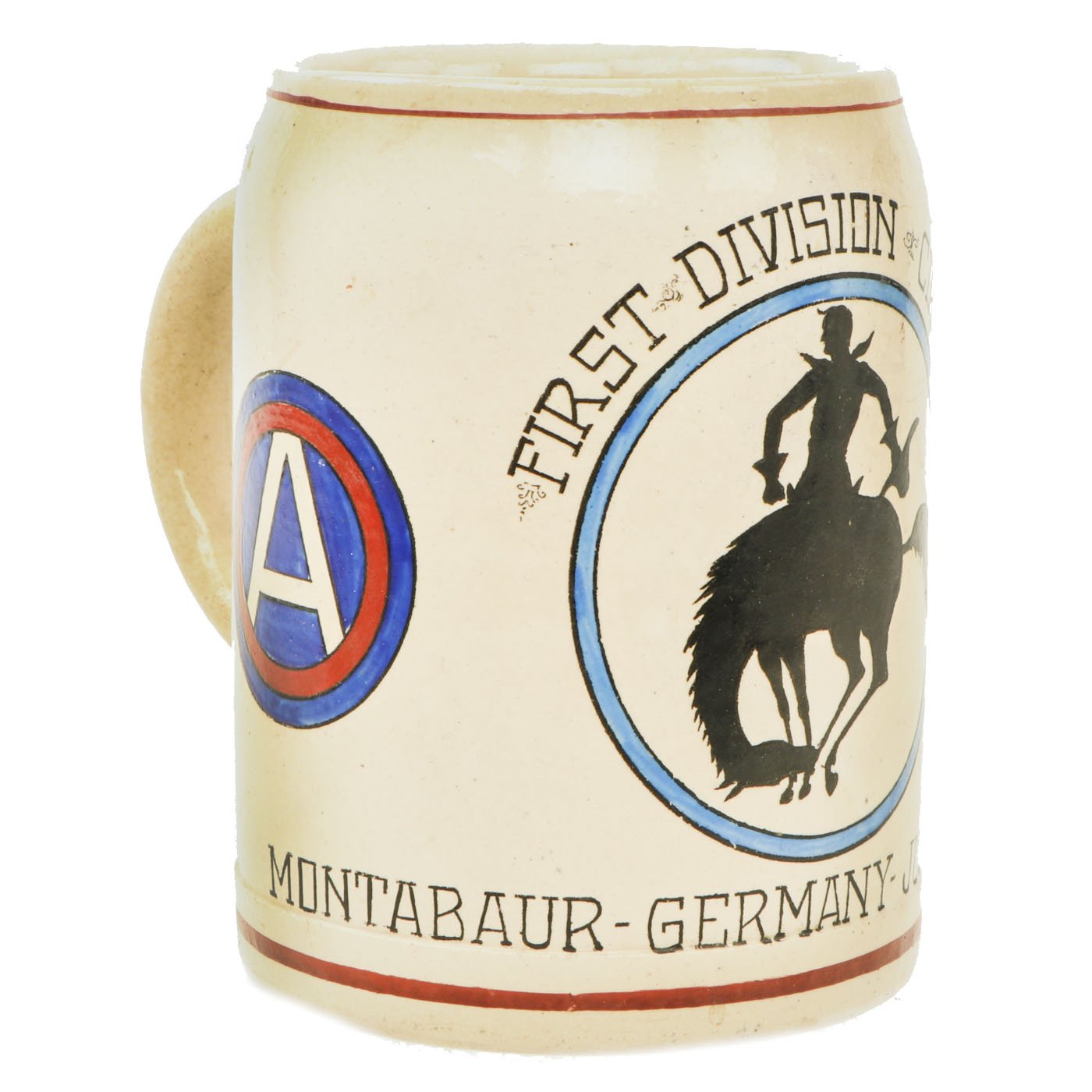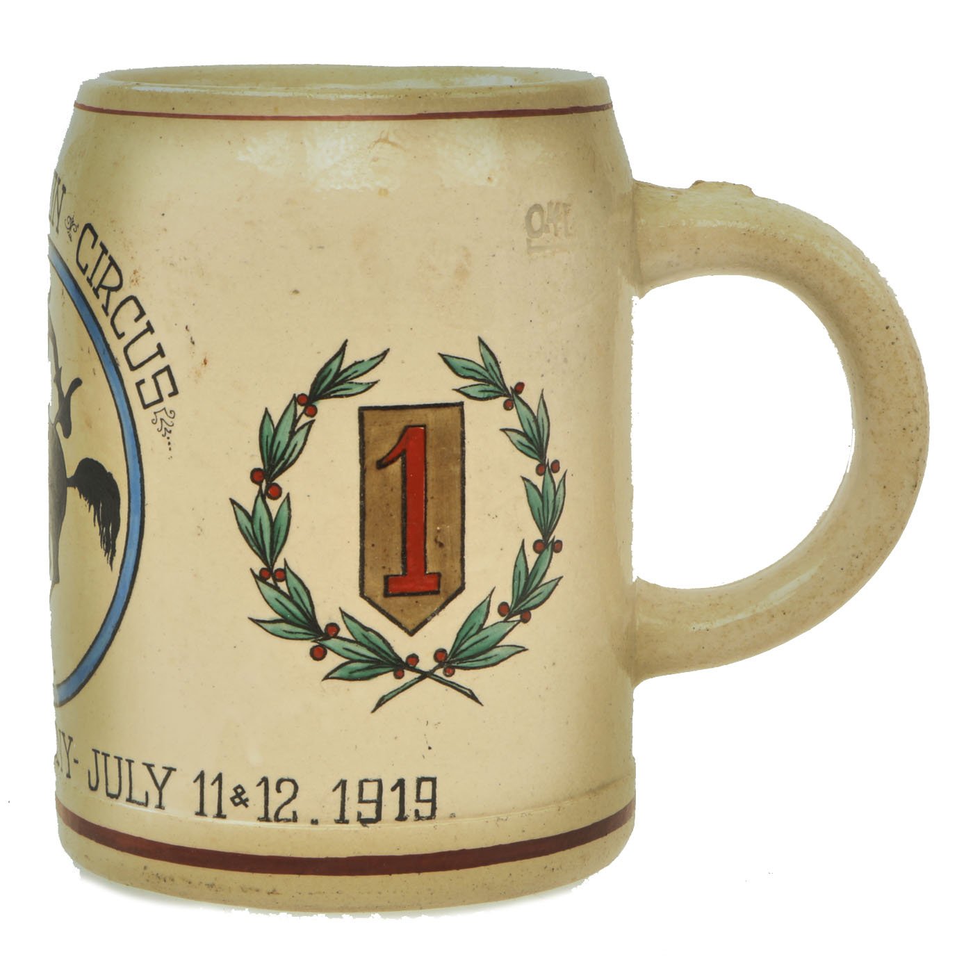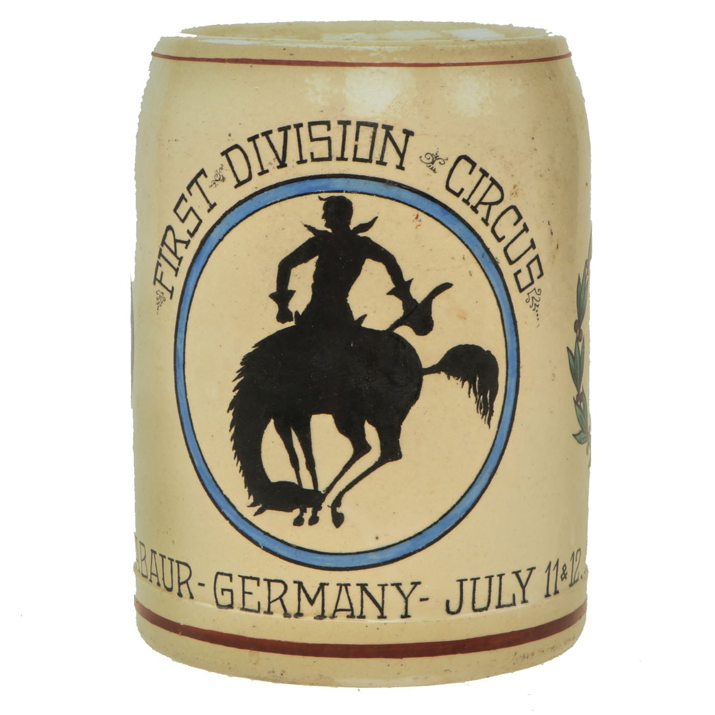This is painted around a very nice "Cowboy" silhouette inside a blue circle. To the left of this is the emblem of the U.S. Third Army, and to the right is the emblem of the 1st Infantry Division inside a Lauren Wreath. The Third Army's First Infantry Division was part of the forces in Germany during the post war occupation. They returned to the United States in September 1919, so this stein was made during the occupation to commemorate a circus event for the troops.