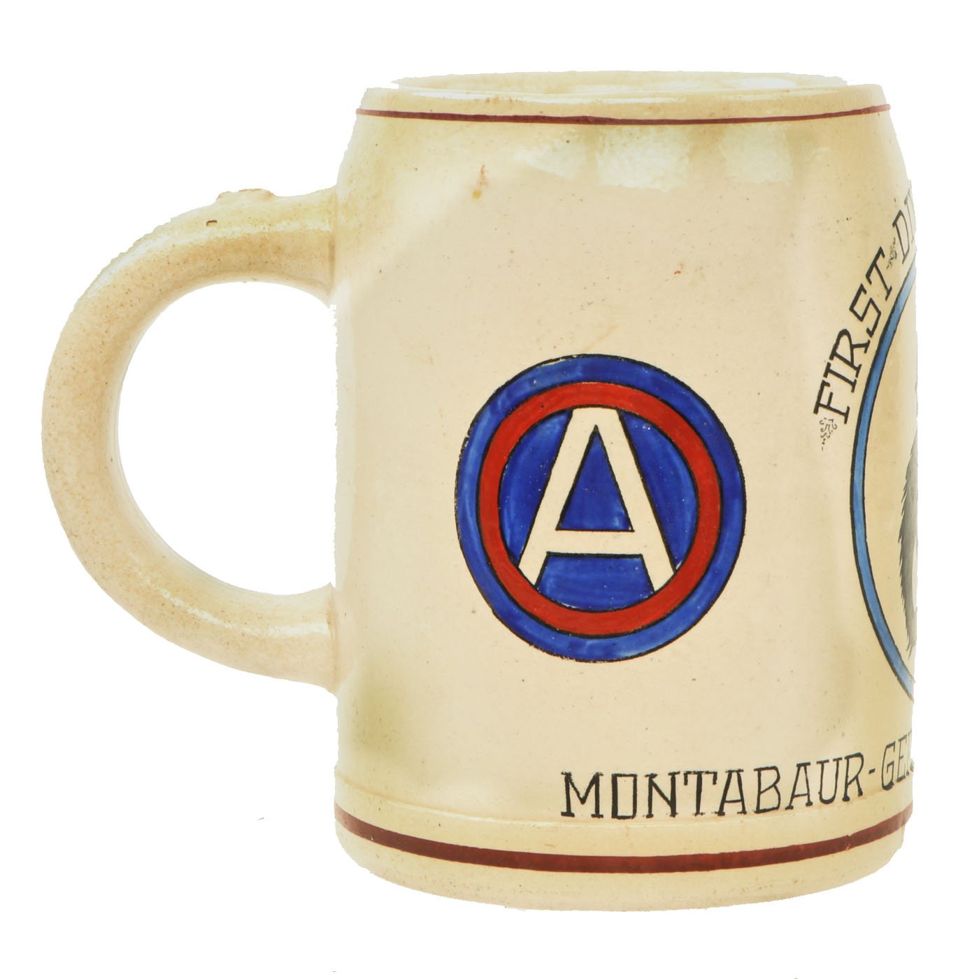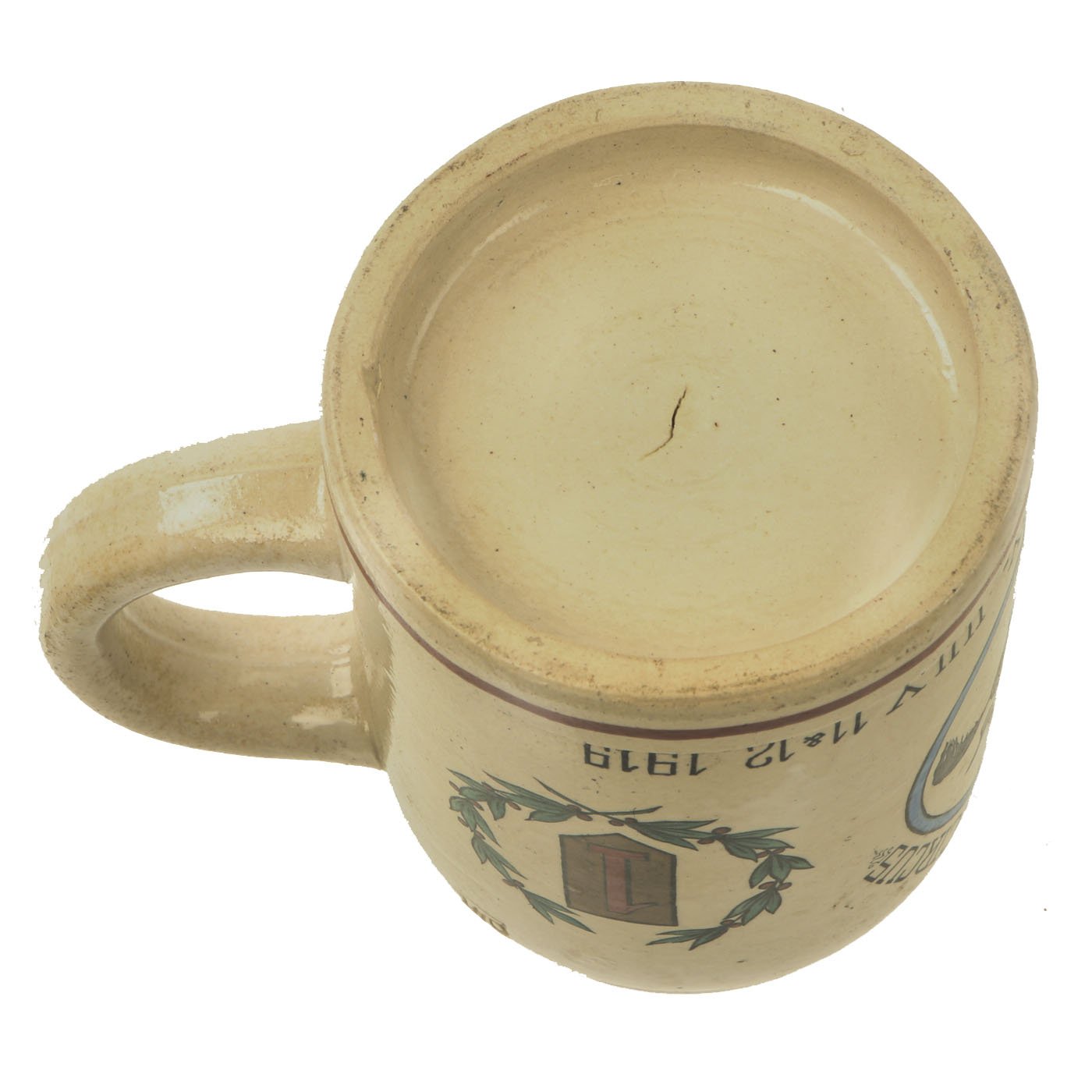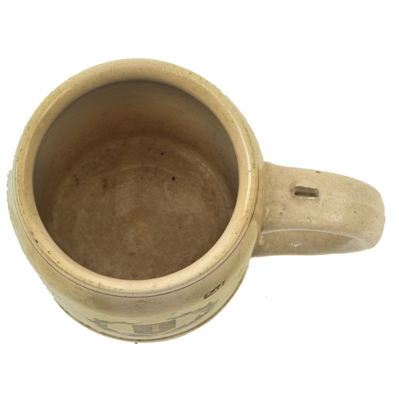 This is painted around a very nice "Cowboy" silhouette inside a blue circle. To the left of this is the emblem of the U.S. Third Army, and to the right is the emblem of the 1st Infantry Division inside a Lauren Wreath. The Third Army's First Infantry Division was part of the forces in Germany during the post war occupation. They returned to the United States in September 1919, so this stein was made during the occupation to commemorate a circus event for the troops.