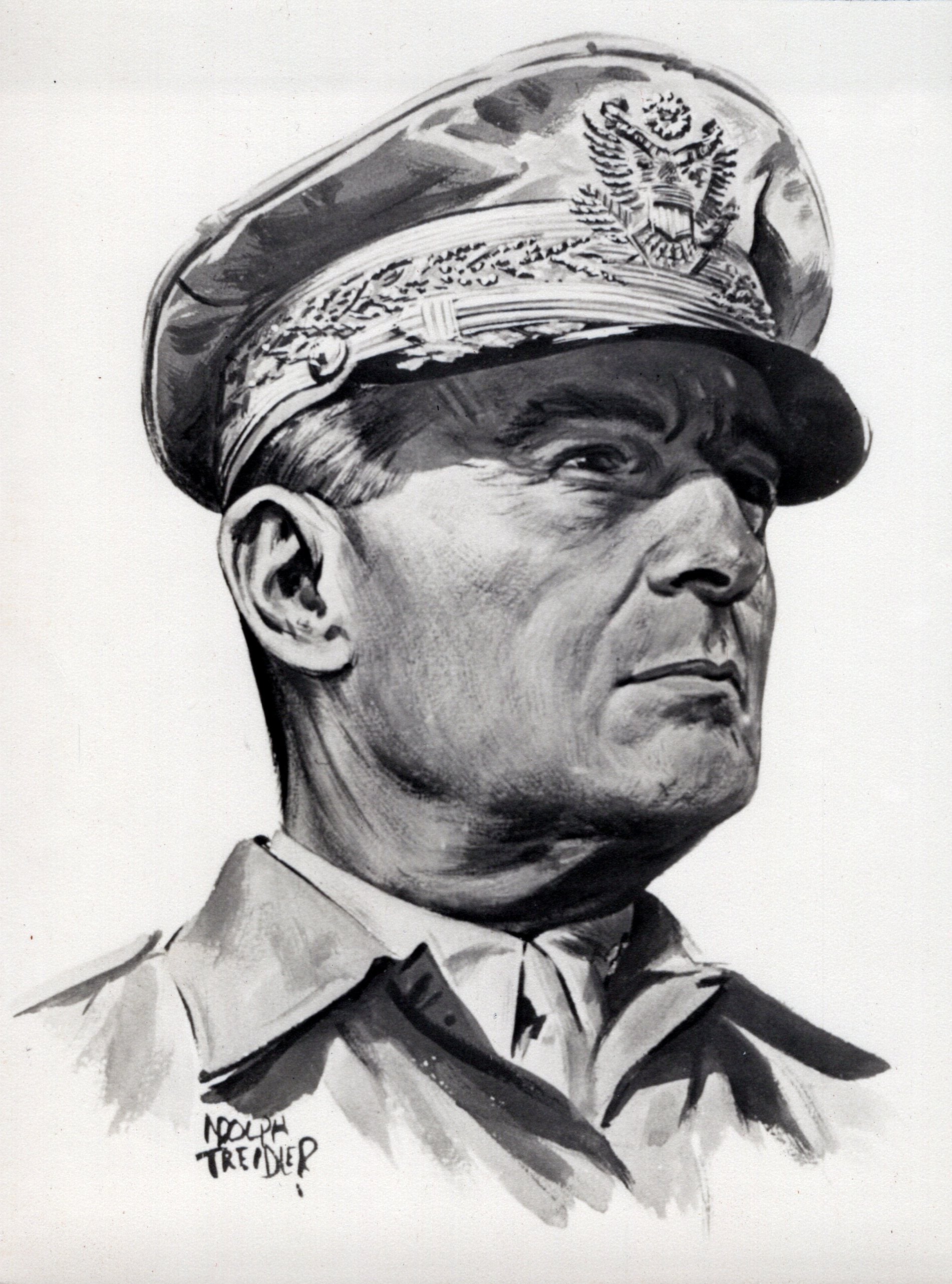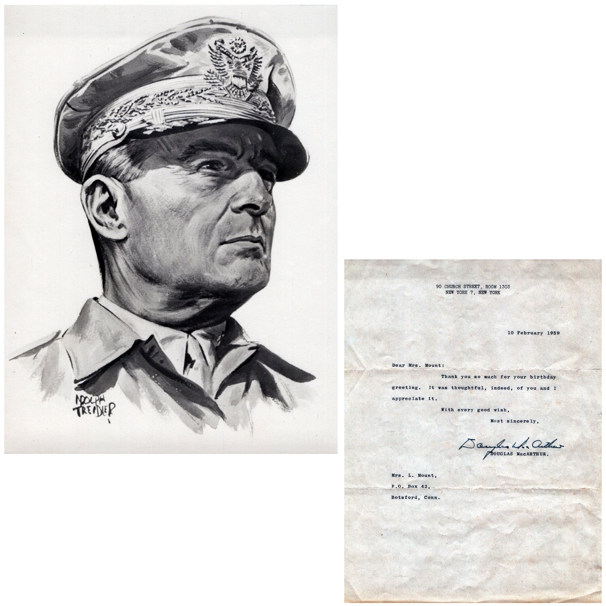 The letter comes with a 6½ x 8½” print of a drawing of MacArthur by Adolph Treidier. The print is on heavyweight paper 0.38mm thick, similar to oak tag, and definitely is not a recent print, though we have no way of verifying when it was made.