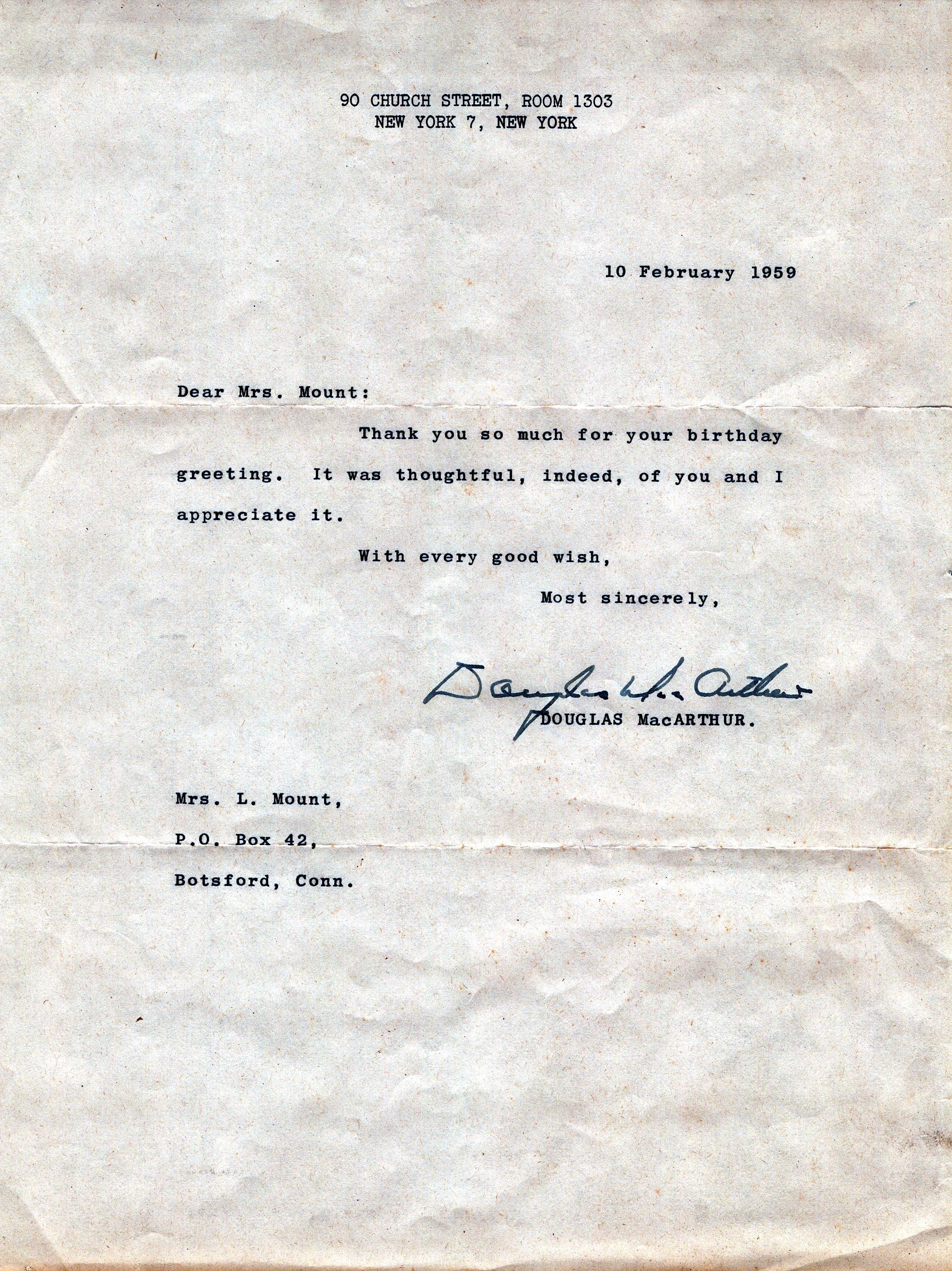 This is a lovely letter typed by MacArthur on February 10th, 1959, thanking Mrs. L. Mount of Botsford, Connecticut for her birthday greeting to the former General. The letter measures roughly 8 x 10⅜” and is signed at the bottom right by MacArthur, but is likely an autopen signature.