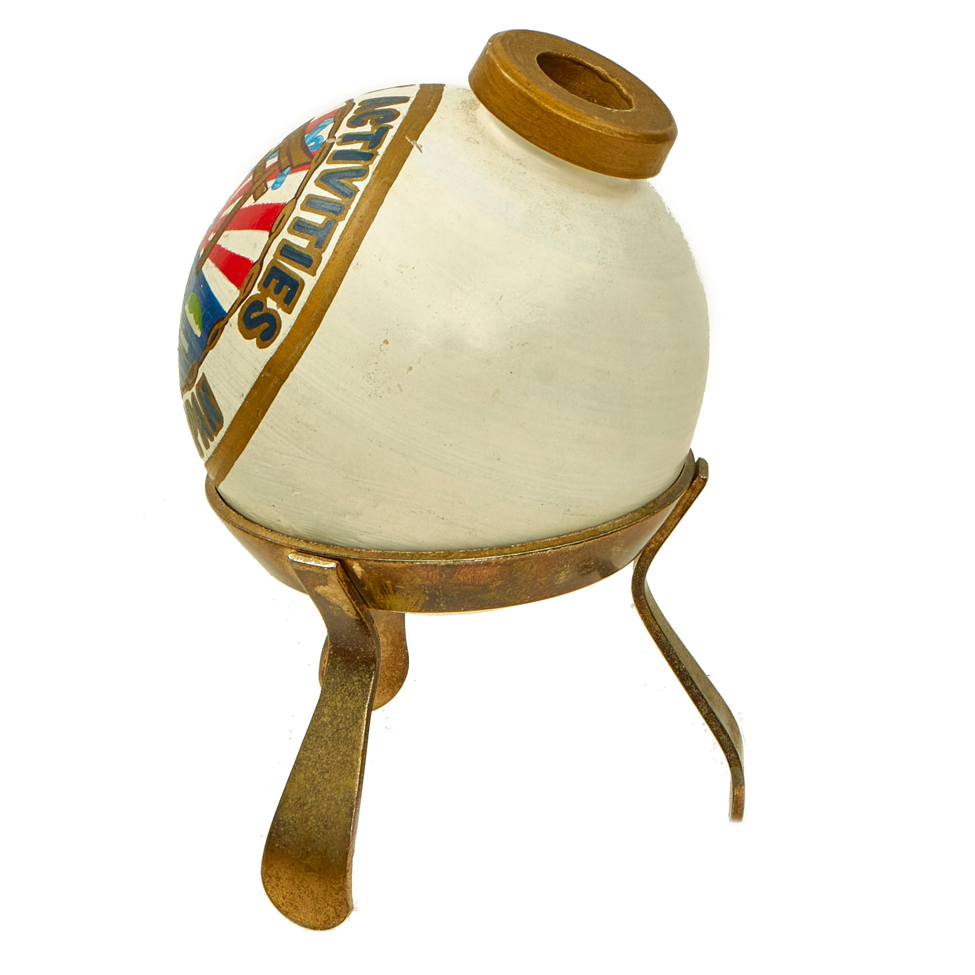 This is an excellent inert demilitarized genuine Japanese Type 4 Ceramic Hand Grenade. This example is offered in excellent condition in the harder to find white body. On the white body is a beautifully painted logo of the Fleet Activities station of Sasebo and is retained perfectly.