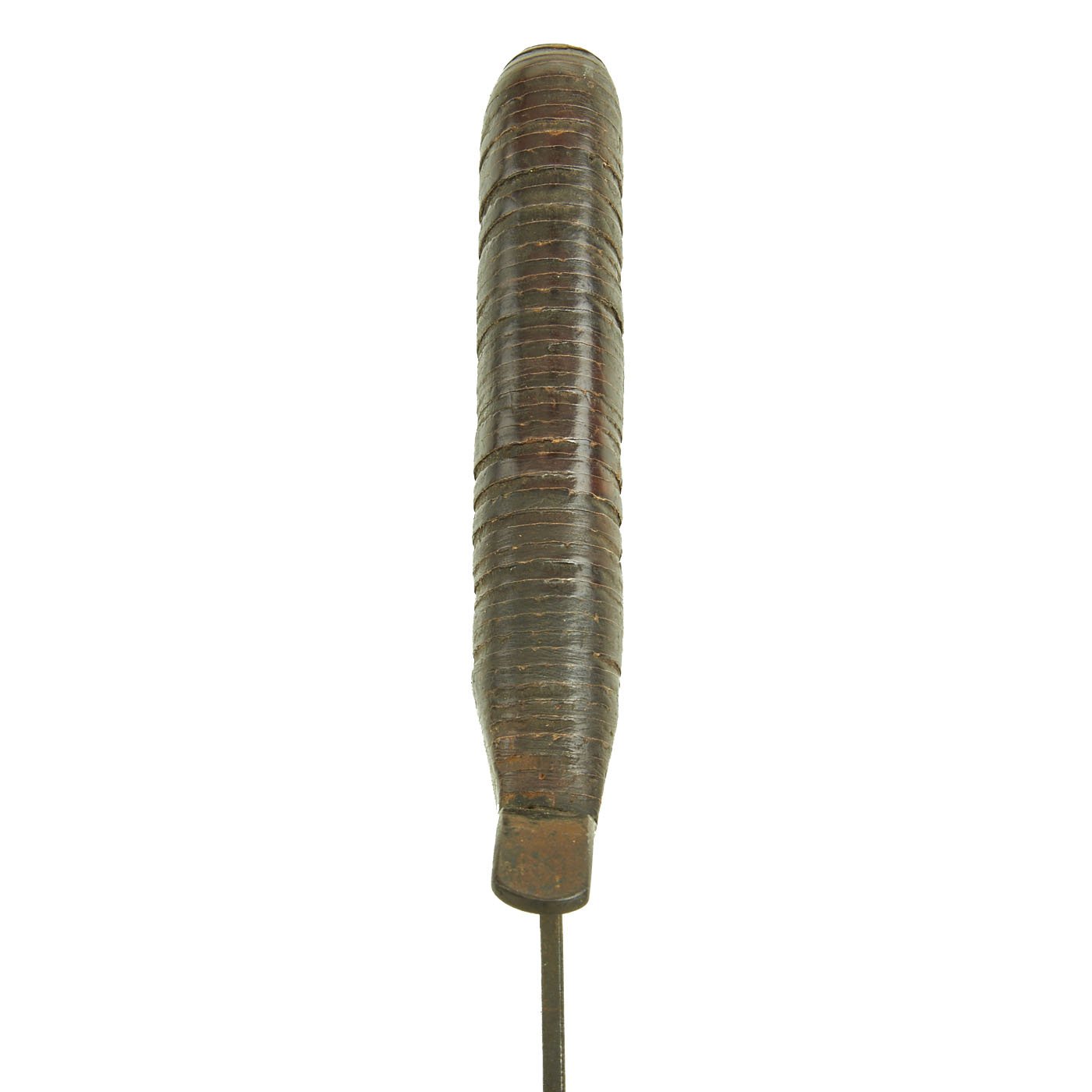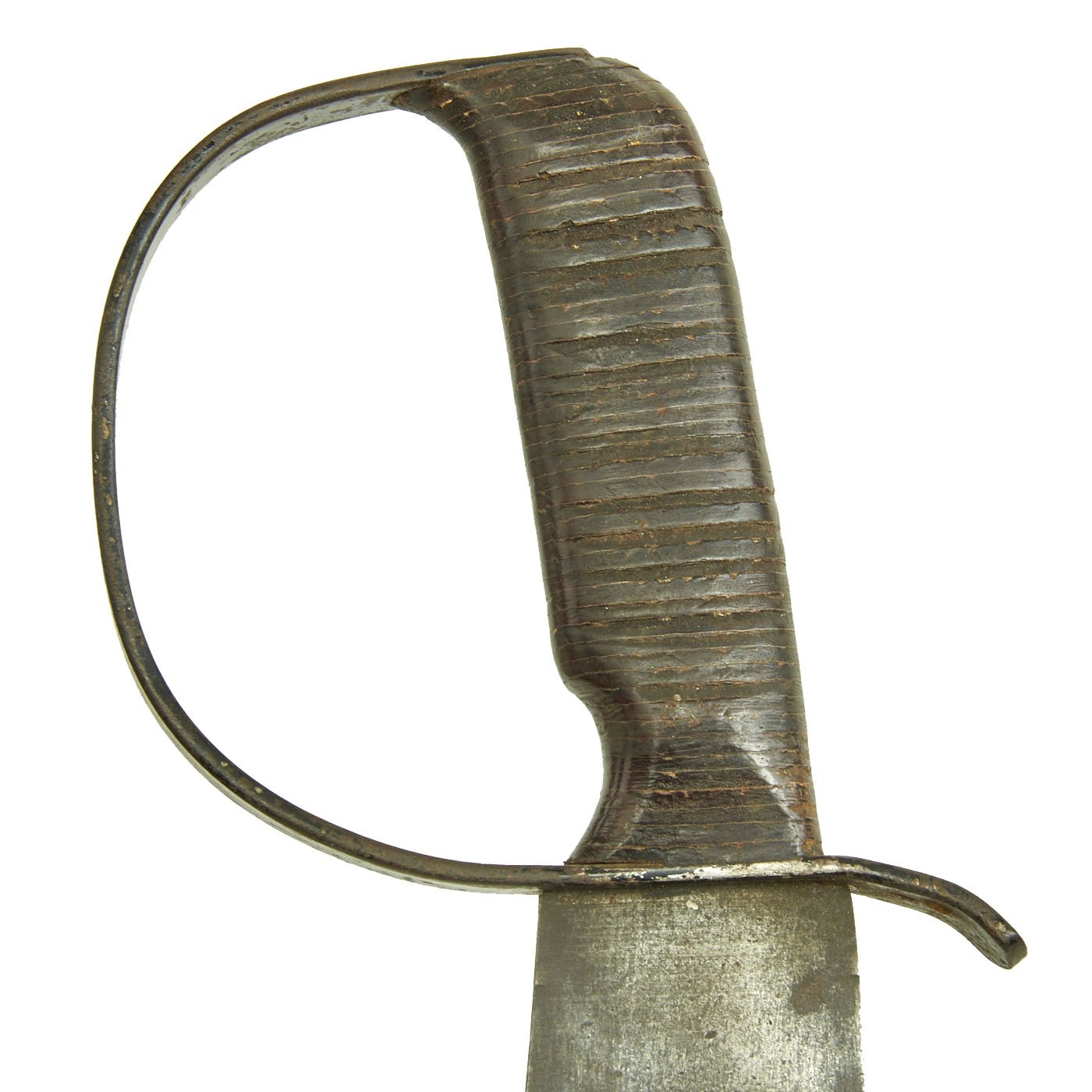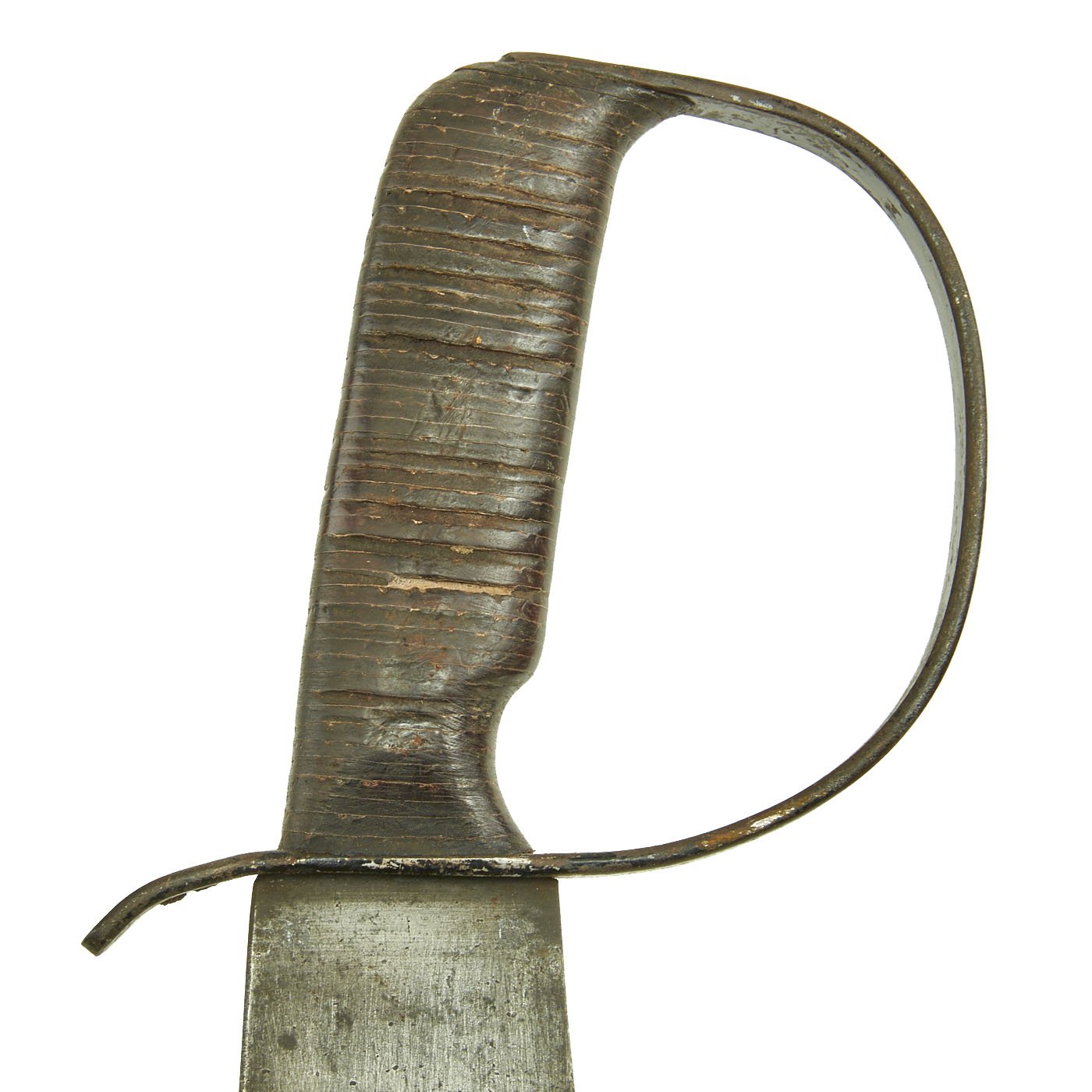 This example is in very good condition, and is from the post war period. The edges are not very sharp, but they have not been sharpened much, so there is still plenty of life left in the blade. The stacked leather handle is intact, and in good shape. The blade has suffered some rust damage, probably from getting wet while in use in the field.
