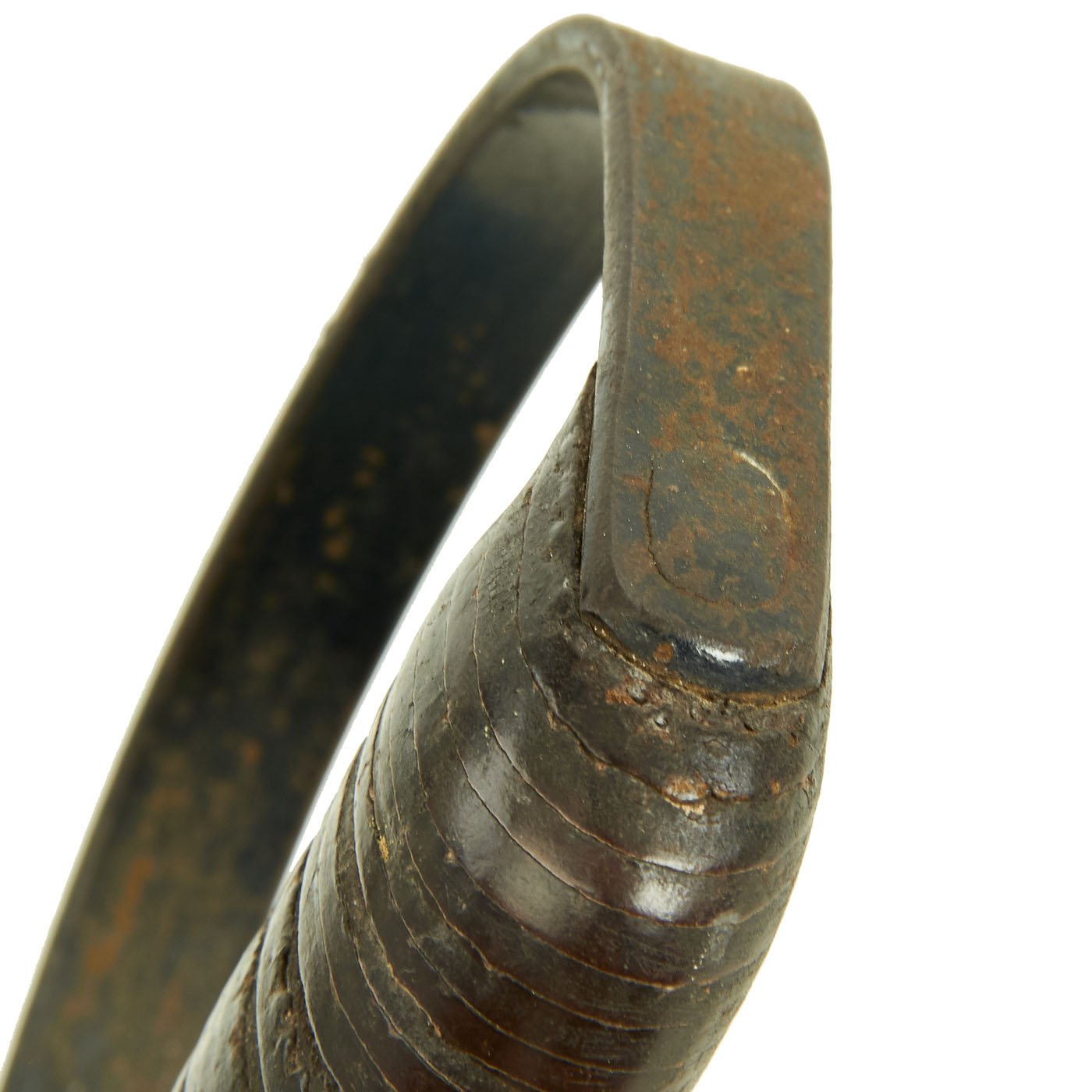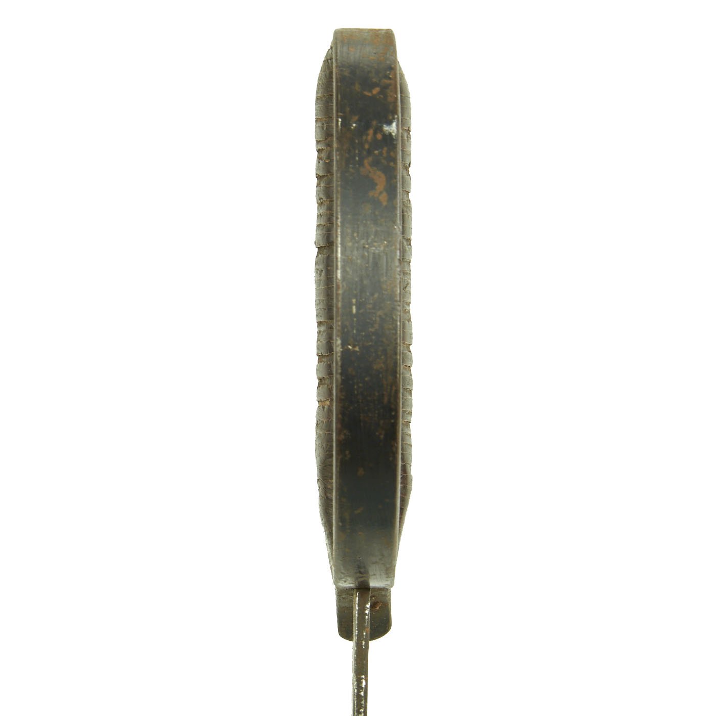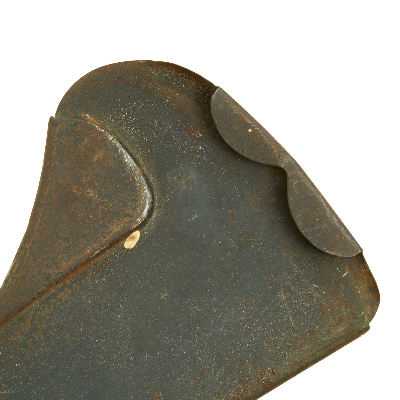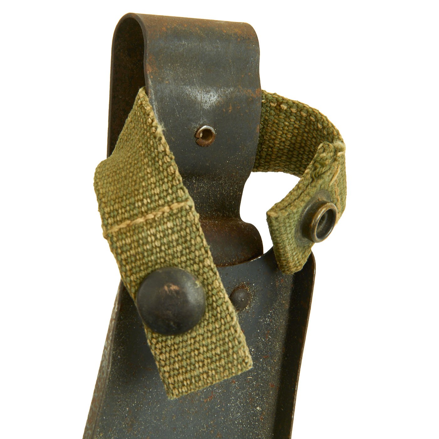 The steel belt carrier scabbard is in good shape, made of blued steel, which has speckled oxidation throughout. These were far more resilient than the WWII style canvas sheaths, which easily wore through. It has an OD green retention strap, as well as a steel belt hook on the back.