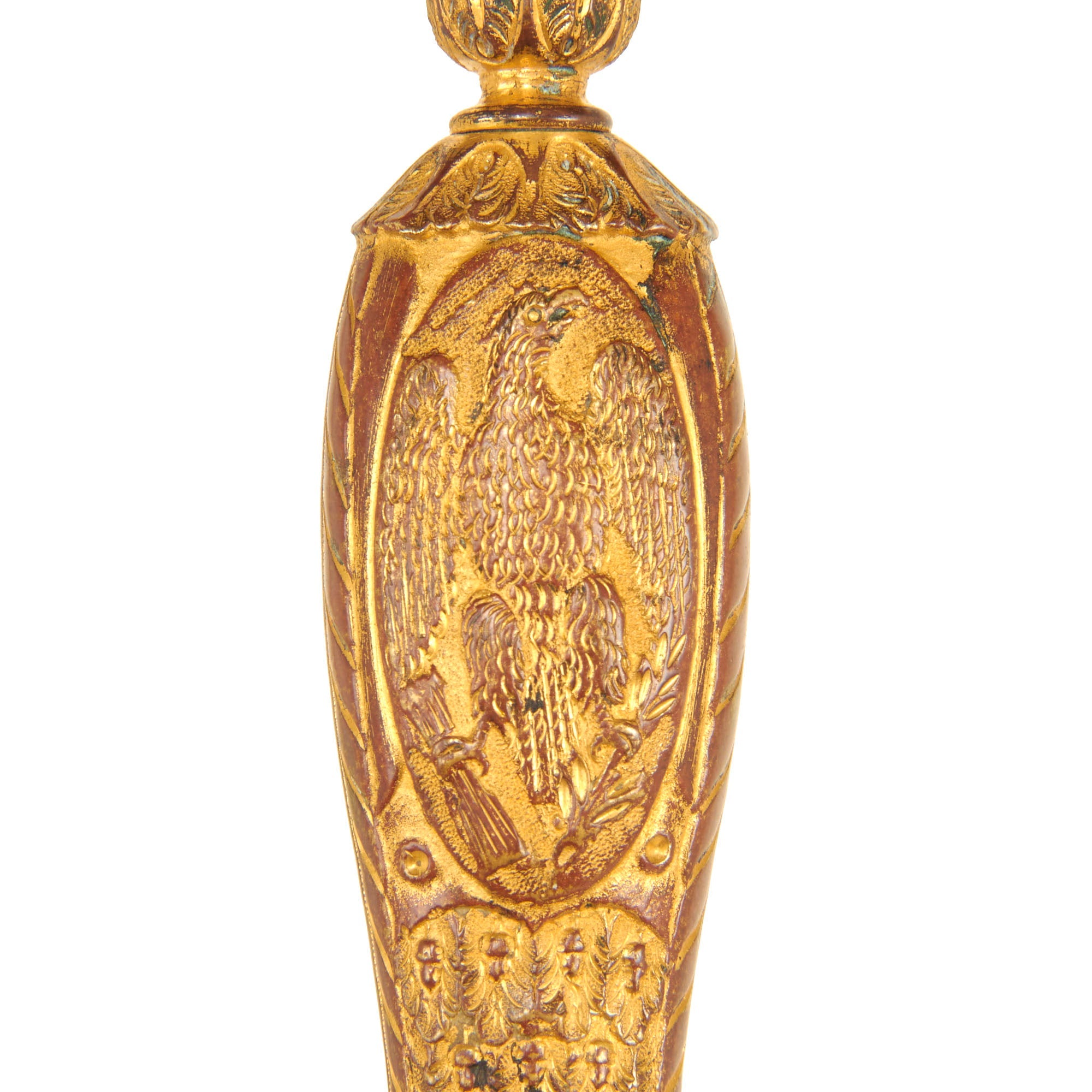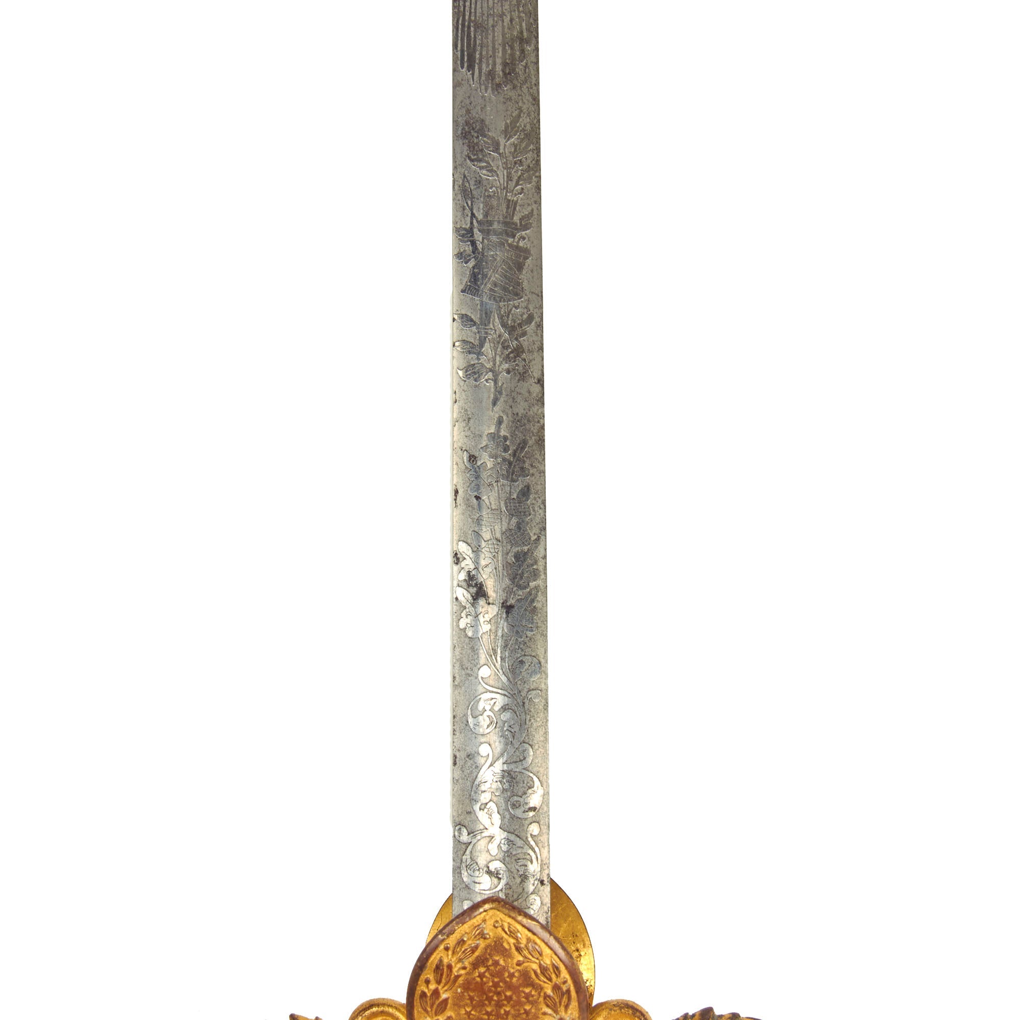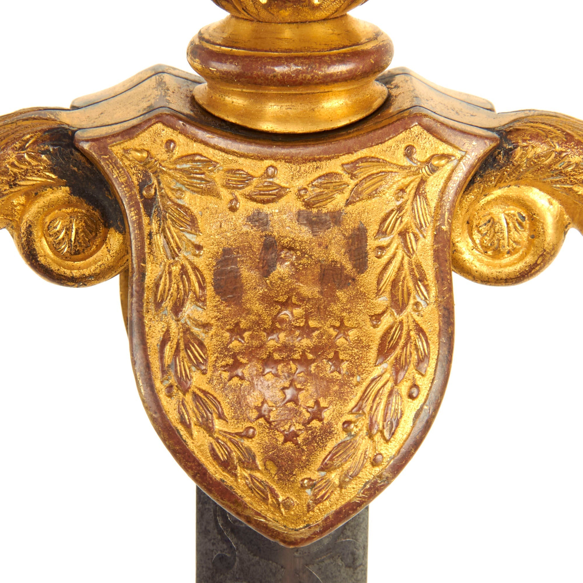 The scabbard is in wonderful condition and without any major dents, bends or extensive damage, however there are a few small dents present. Just like the sword, the scabbard has retained much of the original gold gilt. There are floral designs etched into the scabbard as well as a lovely Eagle clutching an American flag shield.