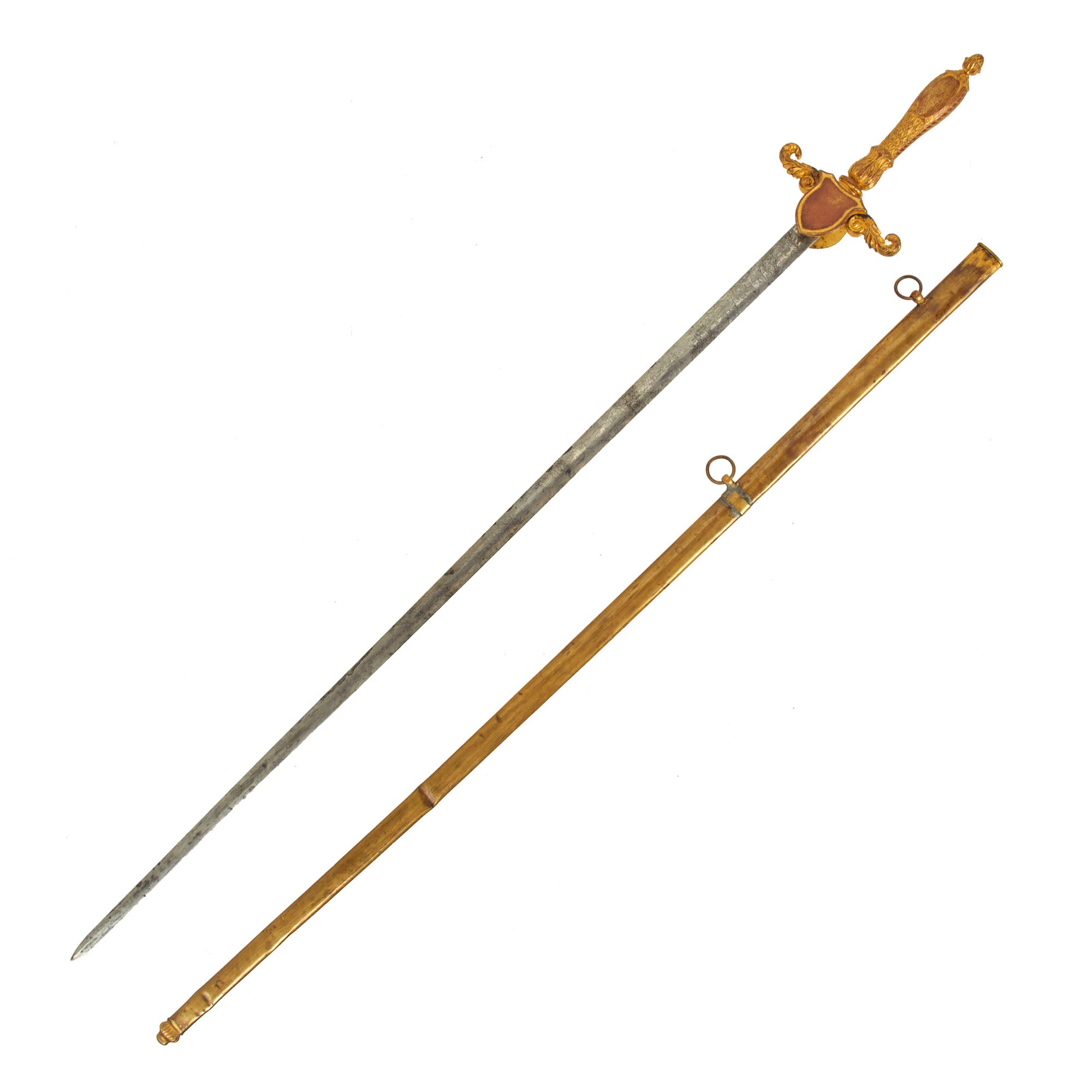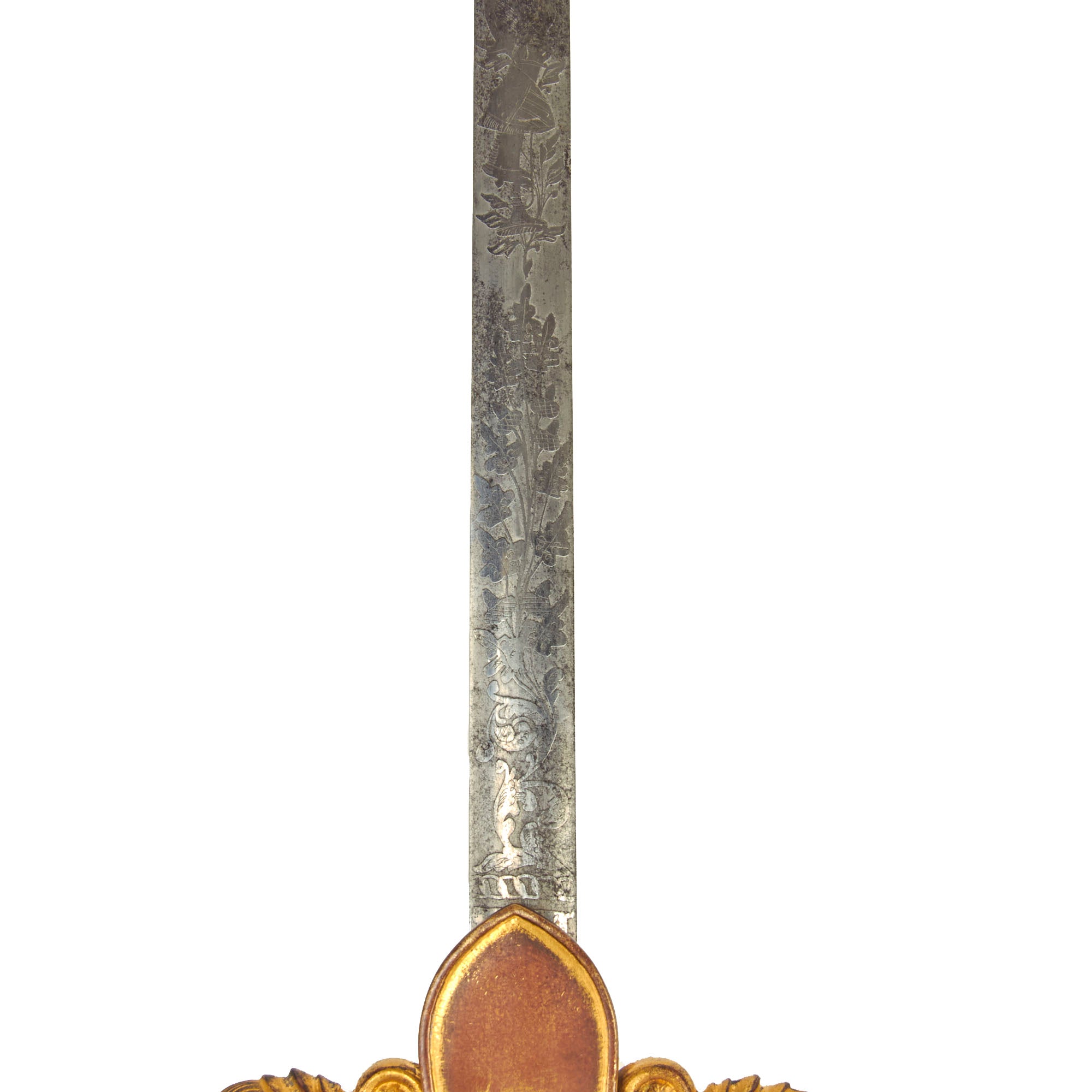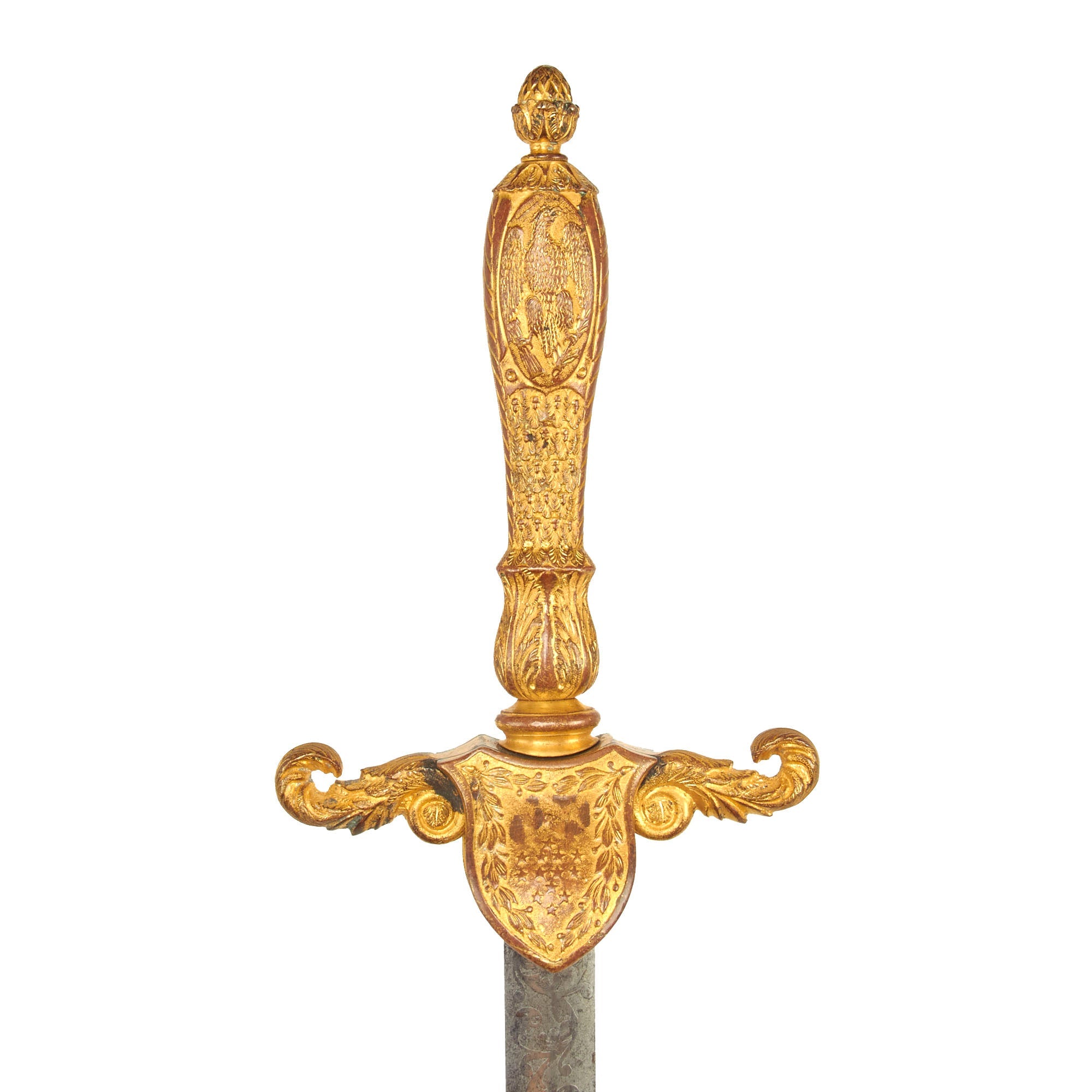 The scabbard is in wonderful condition and without any major dents, bends or extensive damage, however there are a few small dents present. Just like the sword, the scabbard has retained much of the original gold gilt. There are floral designs etched into the scabbard as well as a lovely Eagle clutching an American flag shield.