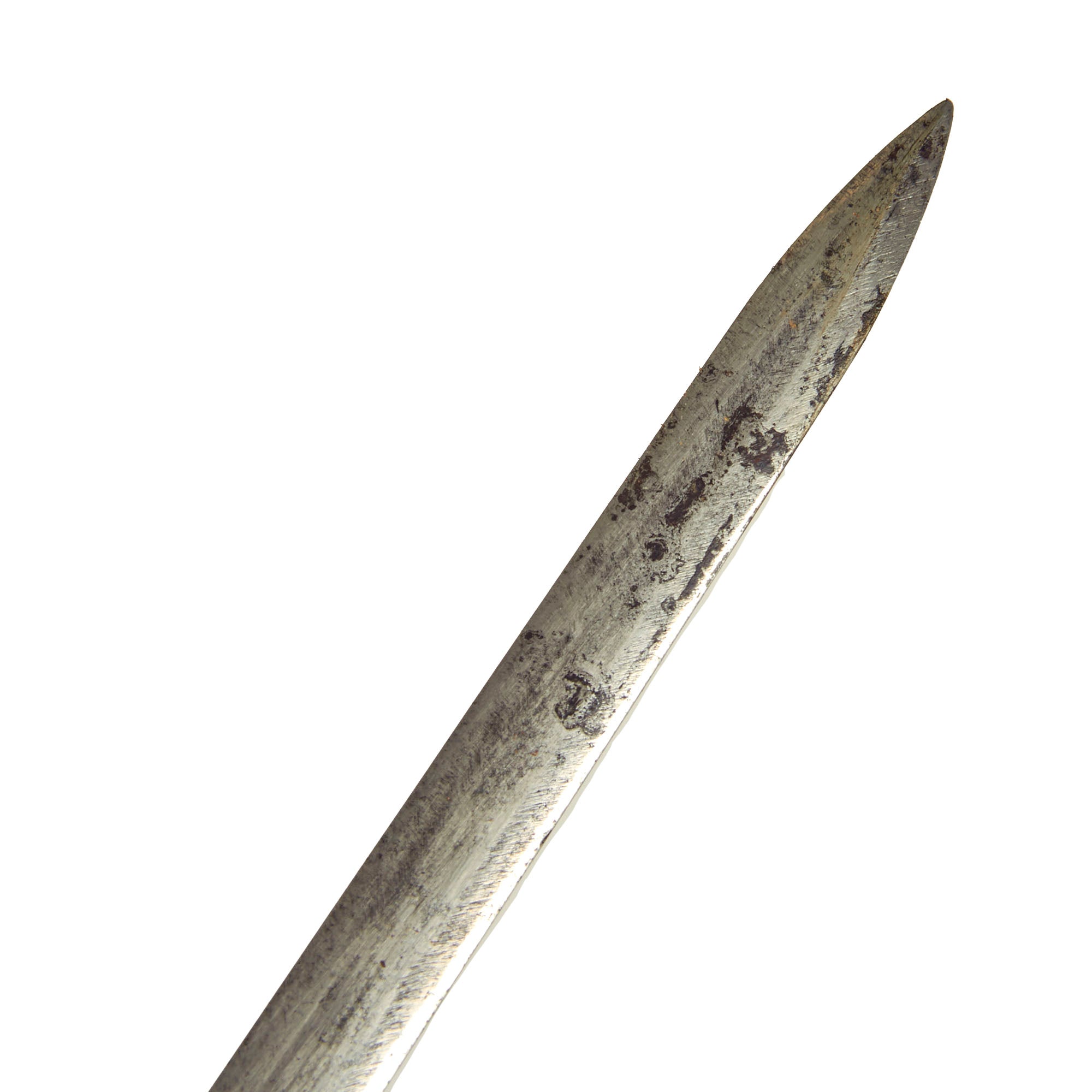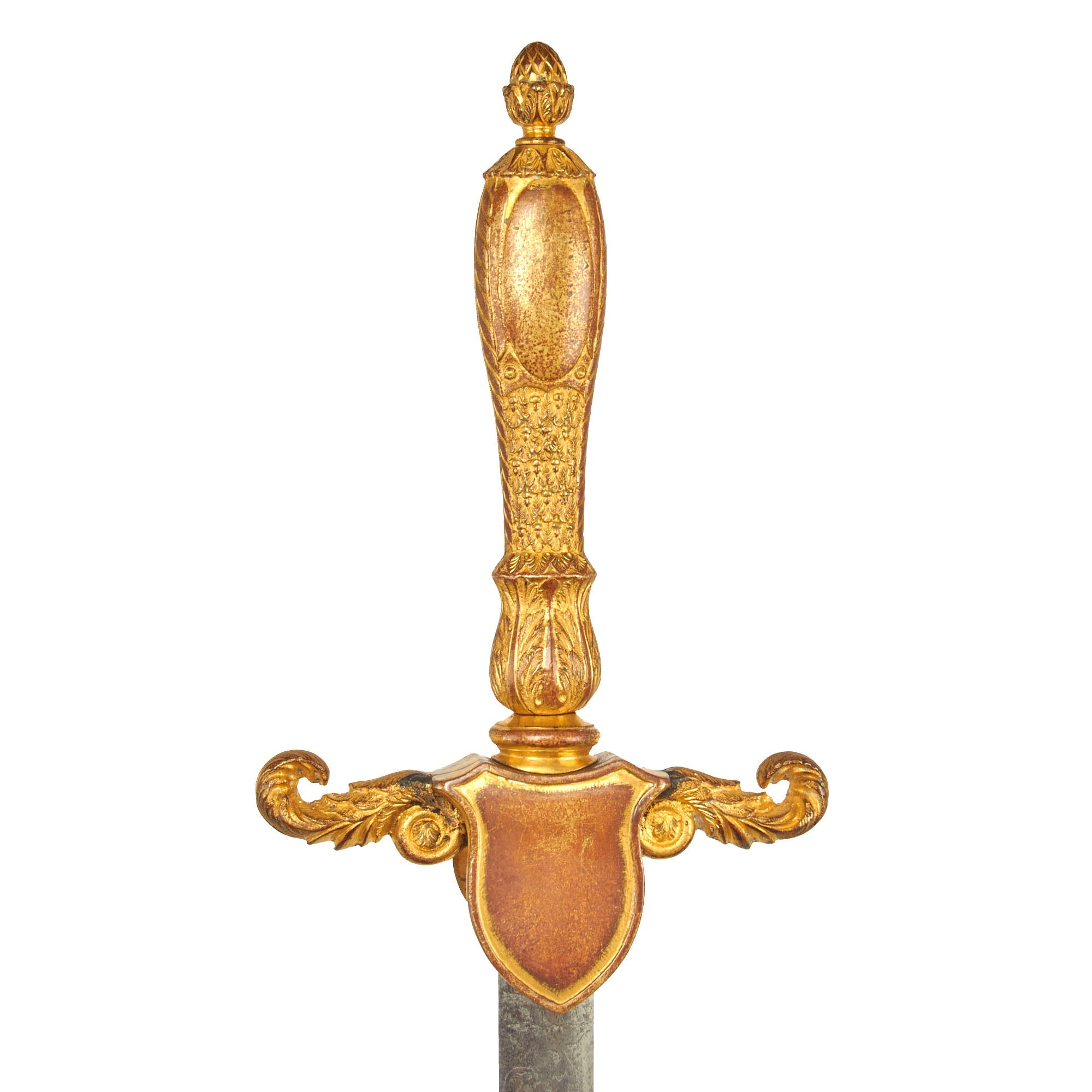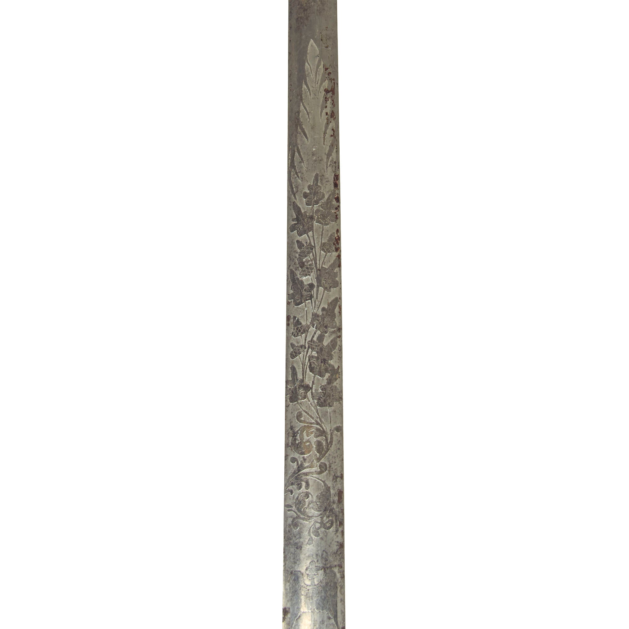 The cruciform-style brass crossguard and chappe is in good shape, with limited patina and much of the original gilt retained. The pommel is a cast of an acorn with a beautifully etched American eagle beneath it on the actual cast grip. Normally these swords had a separately attached “MS” for Medical Services on the front of the shield on the hilt, but now only evidence of one having been brazed on remains.