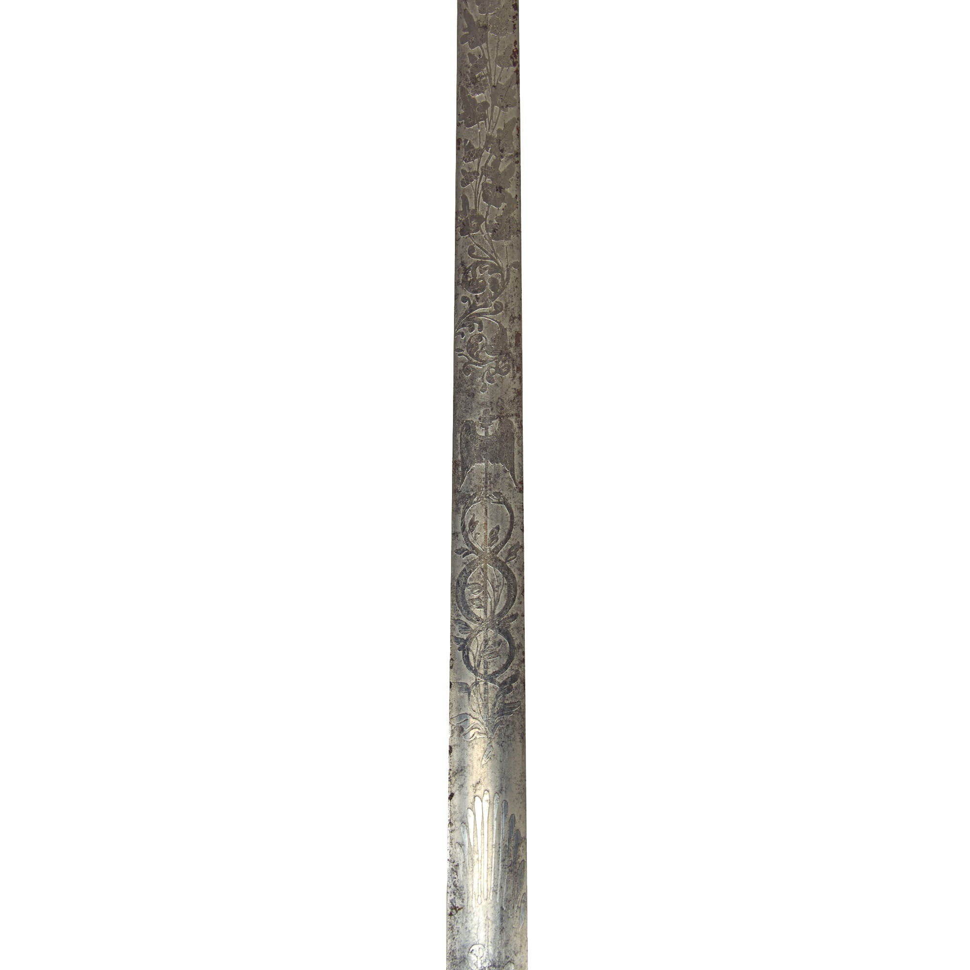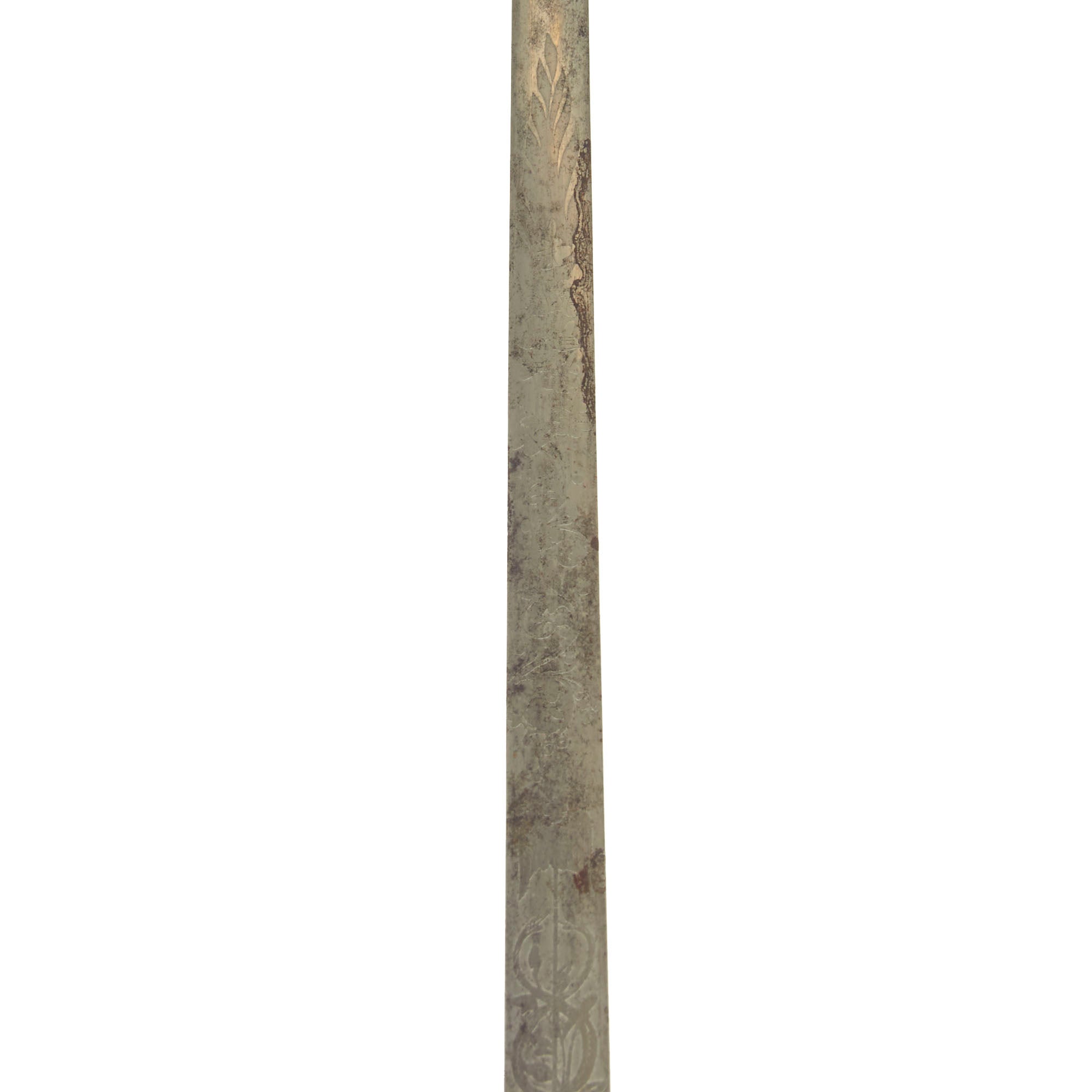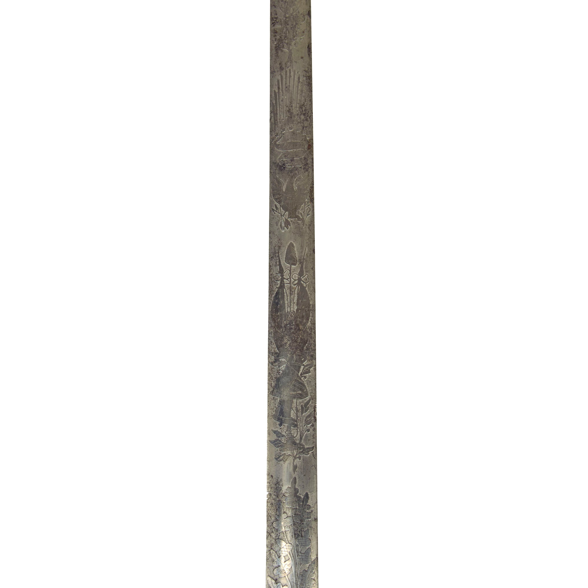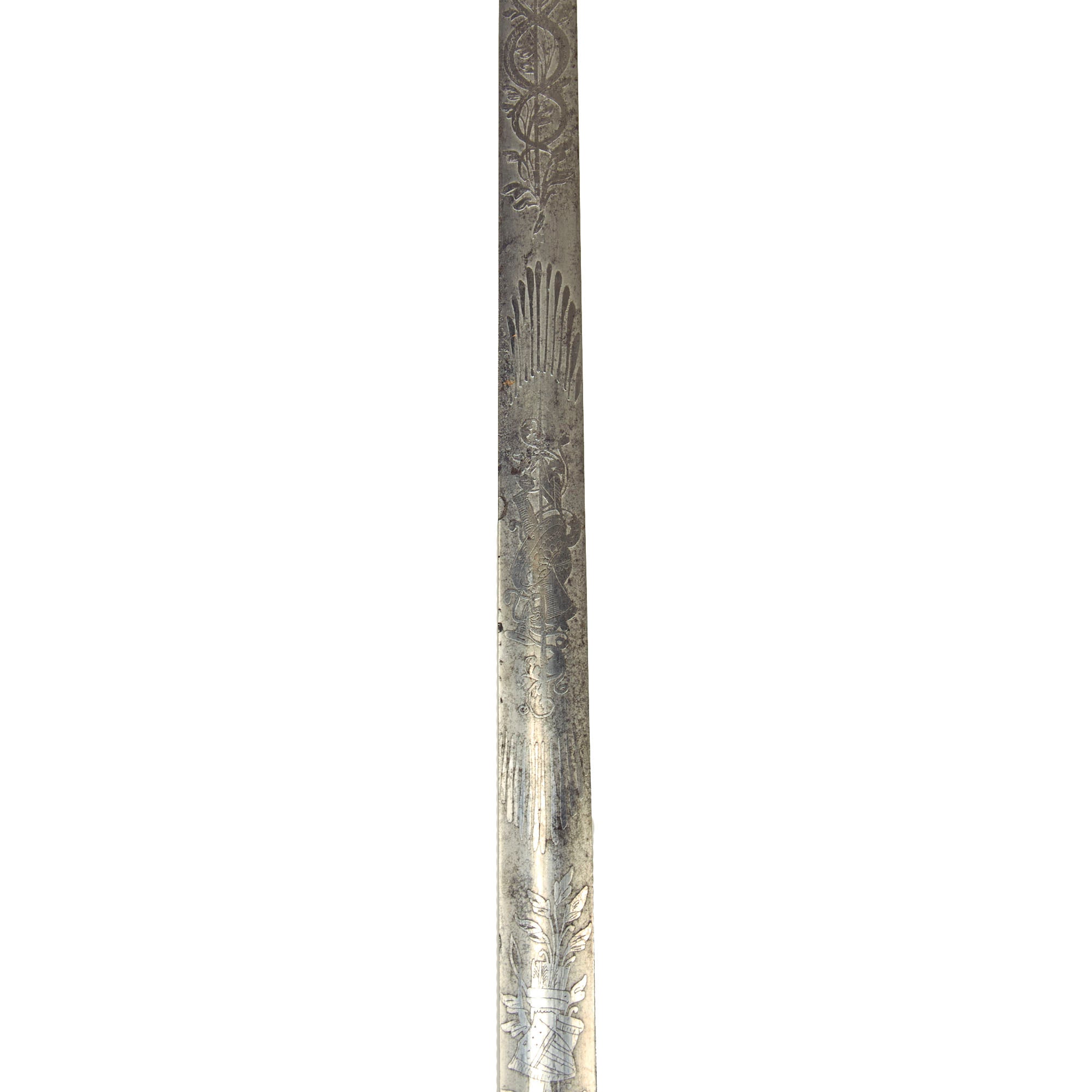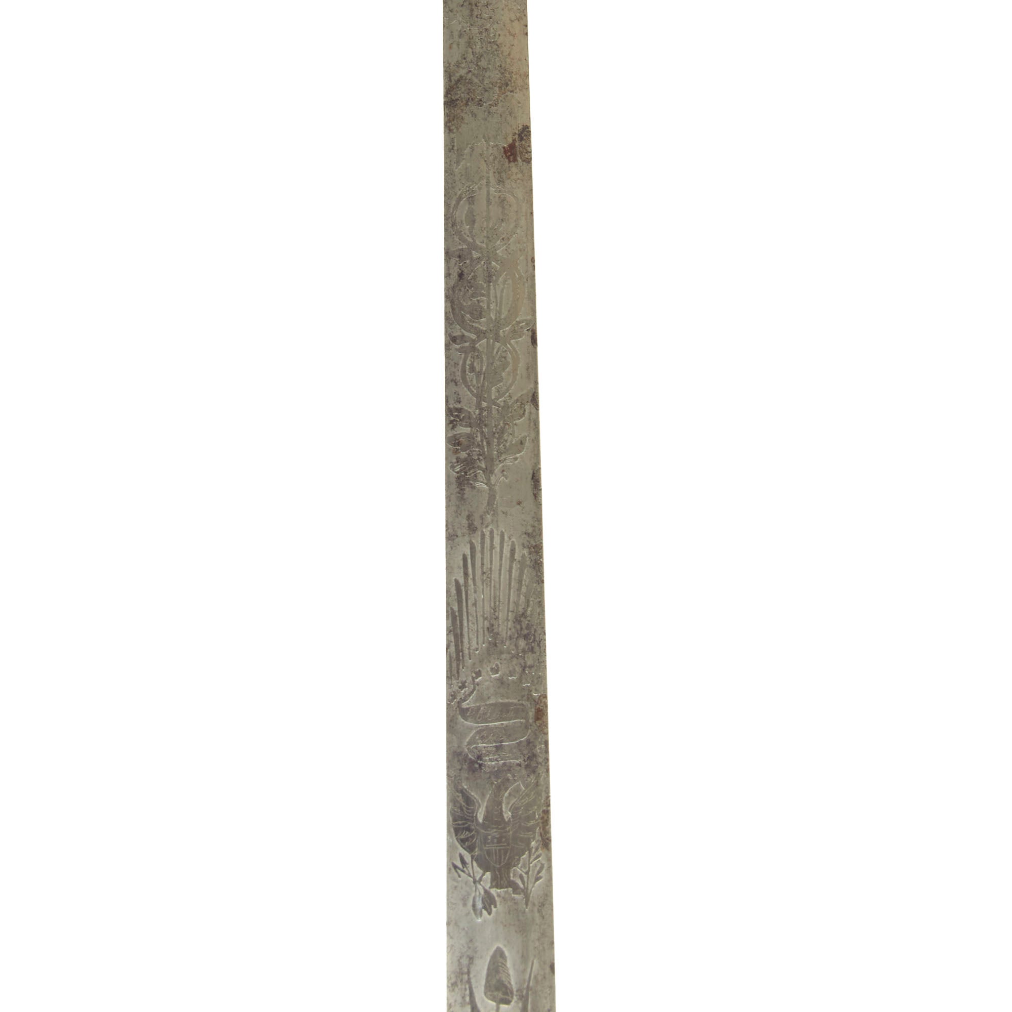 The blade is double-edge and thin without a fuller. The steel still retains some of its original shine, with good edge and point, and lightly frosted etching is somewhat Patriotic in nature. There are various images and motifs of a Caduceus as well as American Eagles.