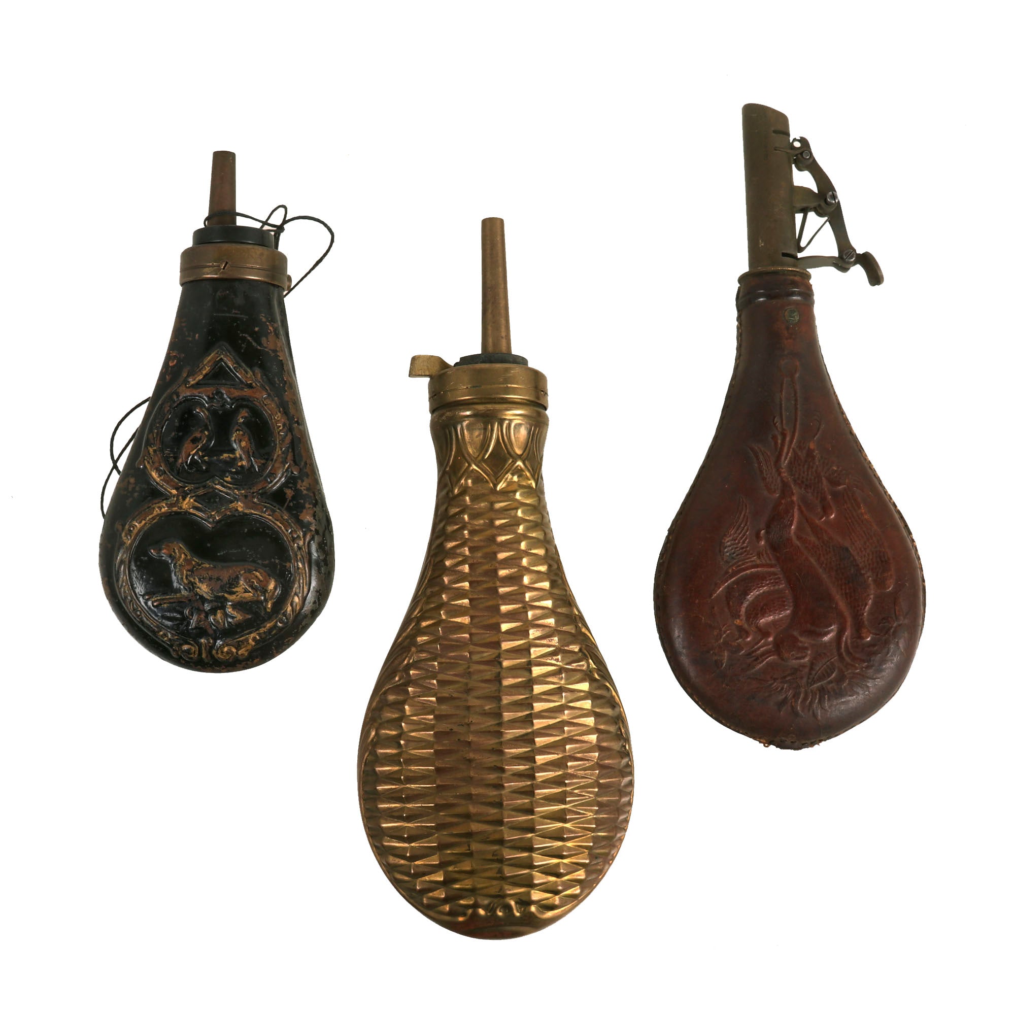 Original Items: One-of-a-kind Set. This set of three powder flasks from the 19th century is a remarkable example of American craftsmanship. Each flask is made of durable brass and sturdy leather, adorned with intricate embossing that speaks to the exceptional attention to detail of the artisans who created them. The flasks not only serve as functional containers for gunpowder, but also as exquisite decorative pieces that showcase the beauty of 19th-century American design.
