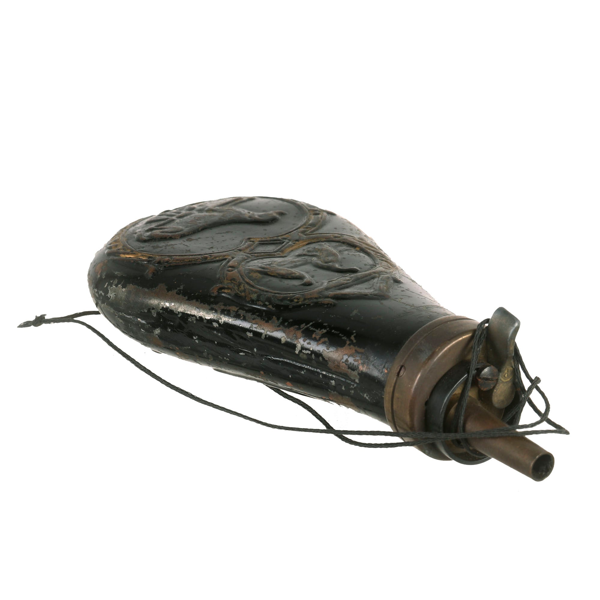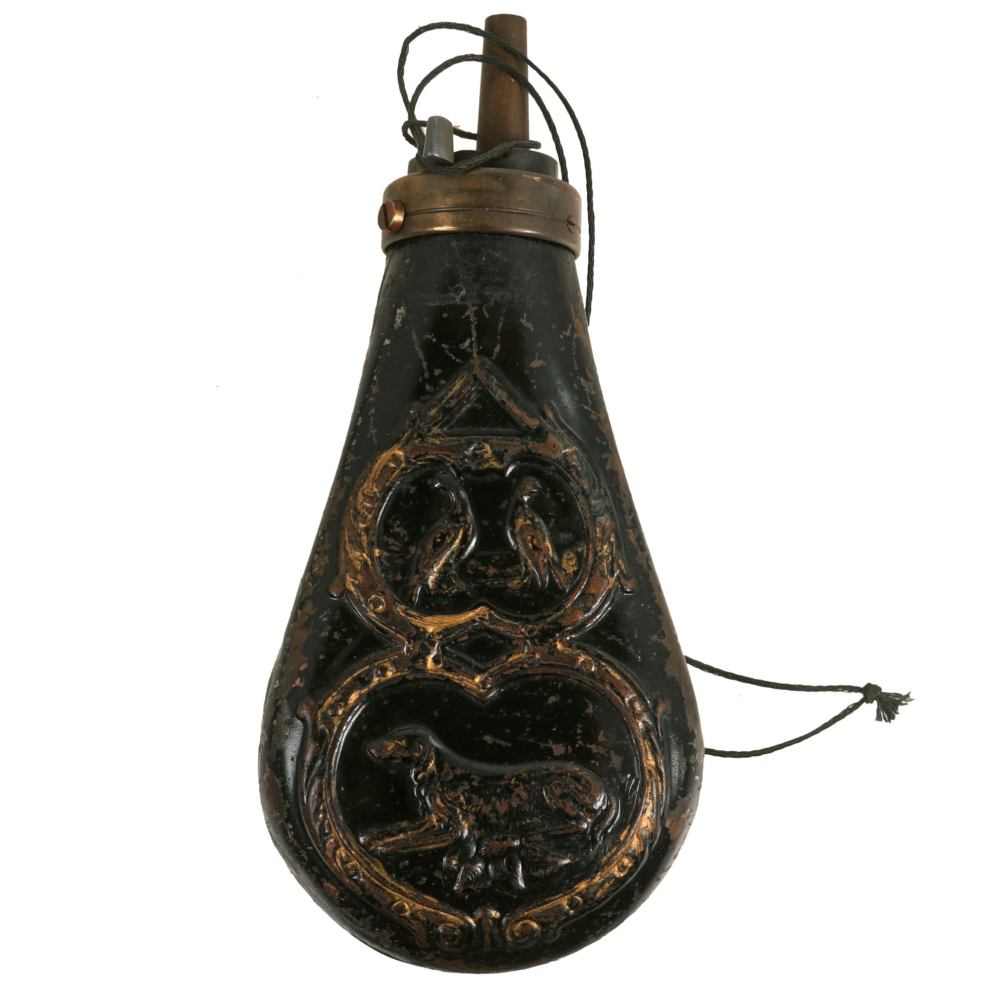 - Black painted brass with embossed hunting scene of birds and dog. Measures 6" x 3" with functional spout and release lever.