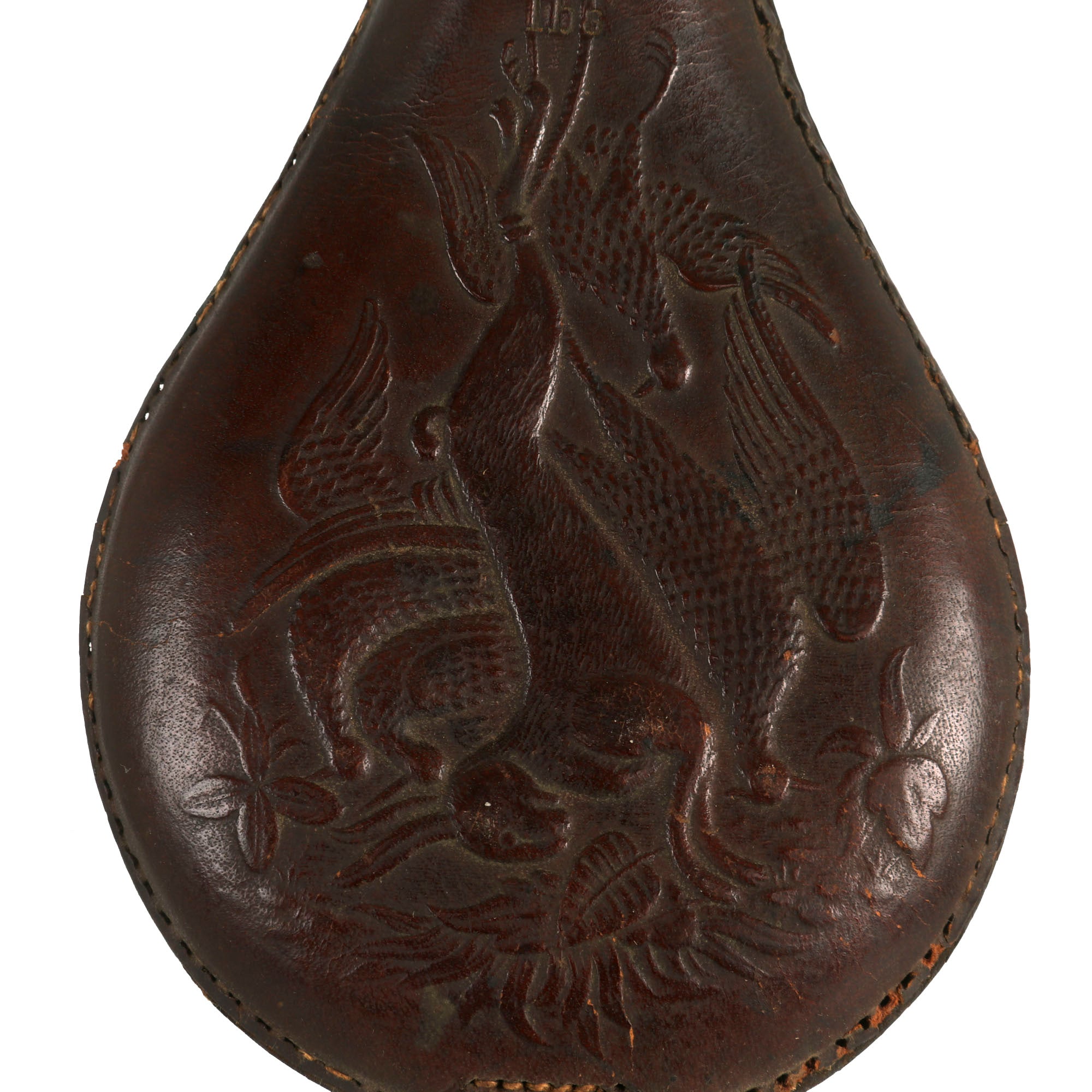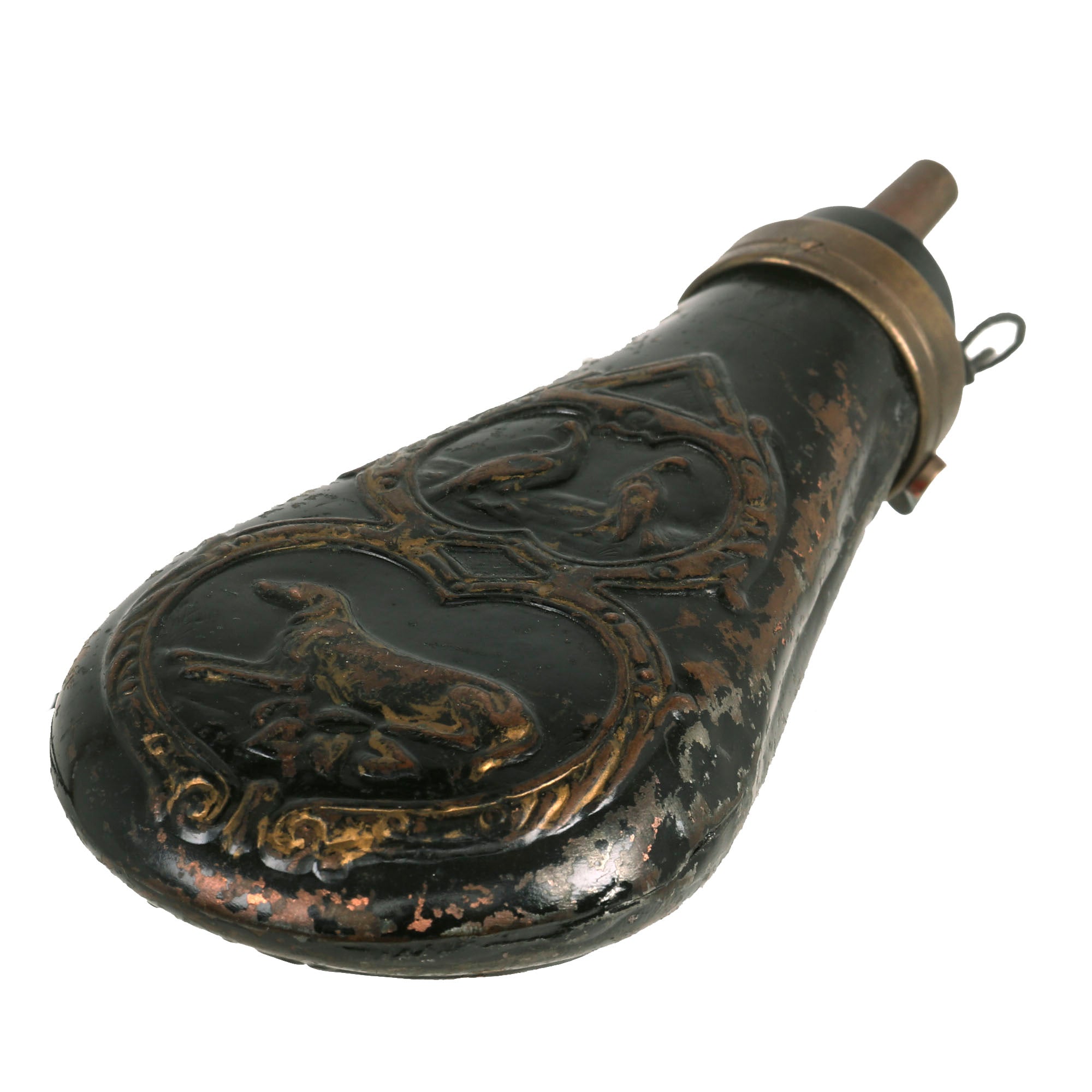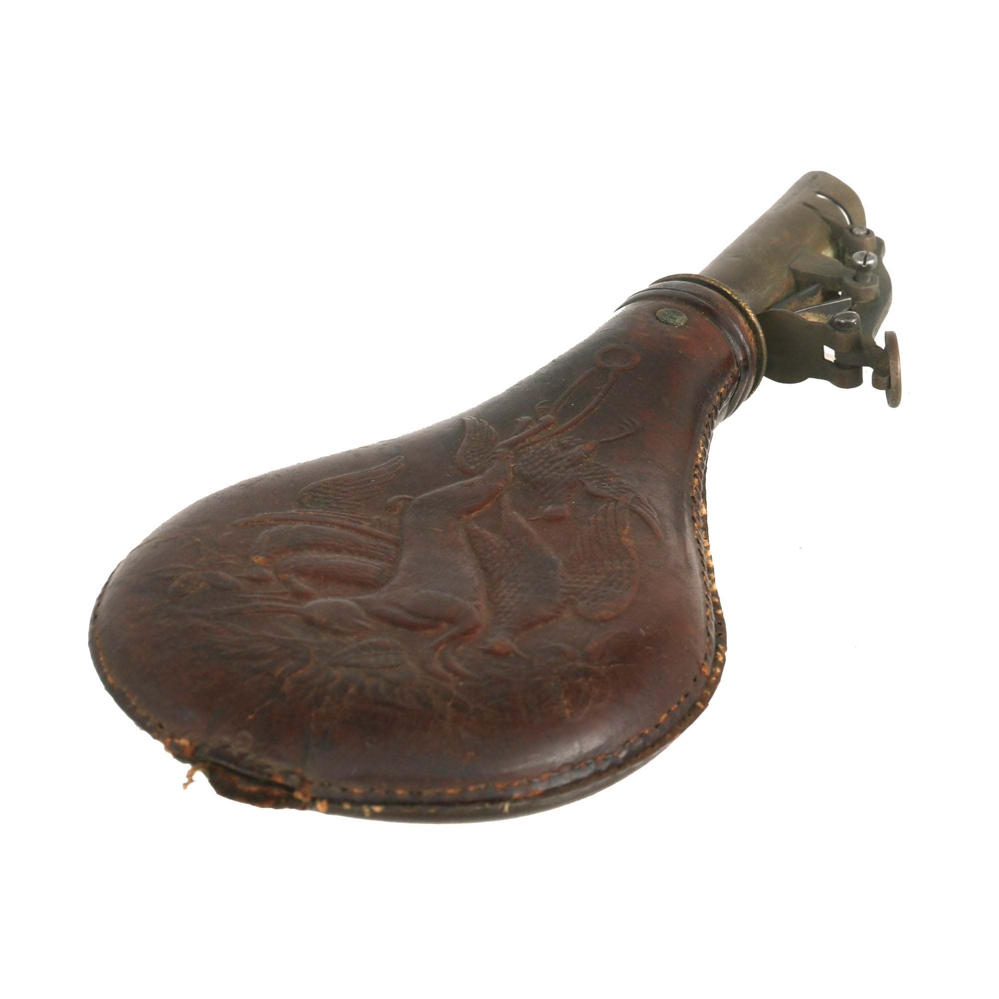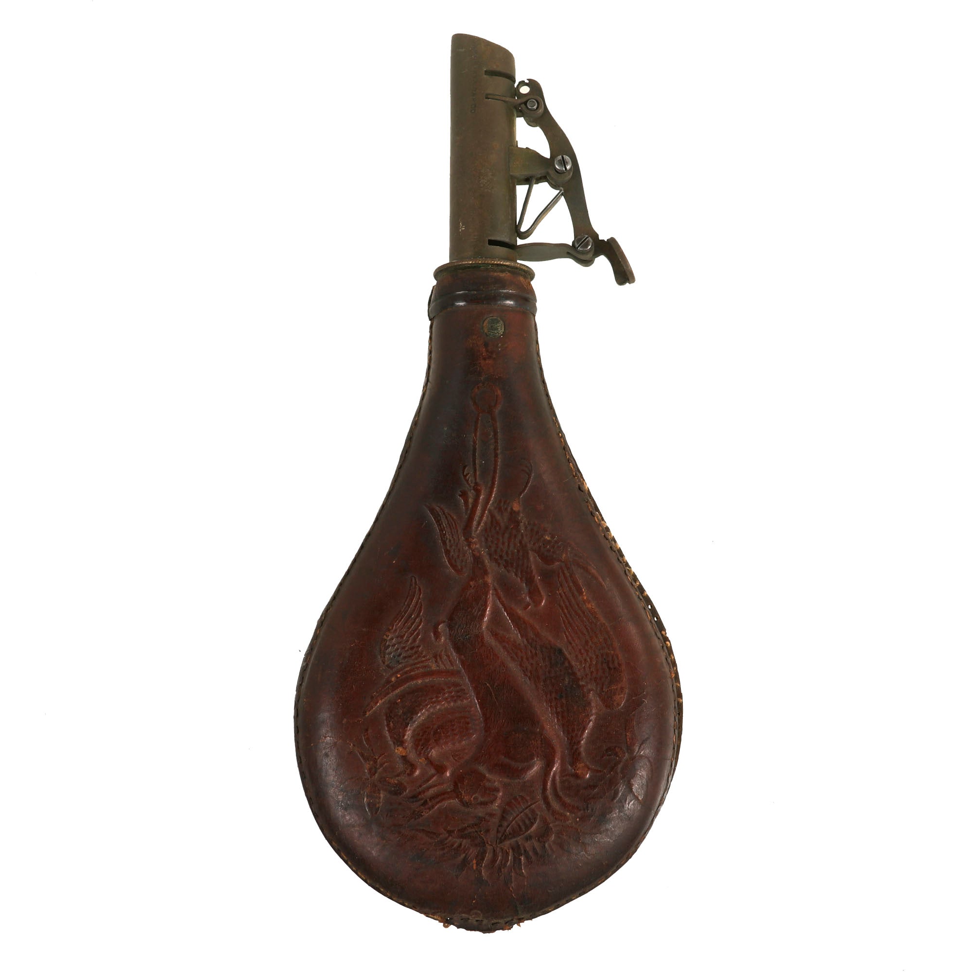 - Leather with embossed rabbit and fowl decoration, excellent patina. Measures 8" x 3.5" with functional spout and release lever. The release lever on this one is actually marked with AM Flask Co. for the American Flask and Cap Company who was in business from 1857-1865 in New York.