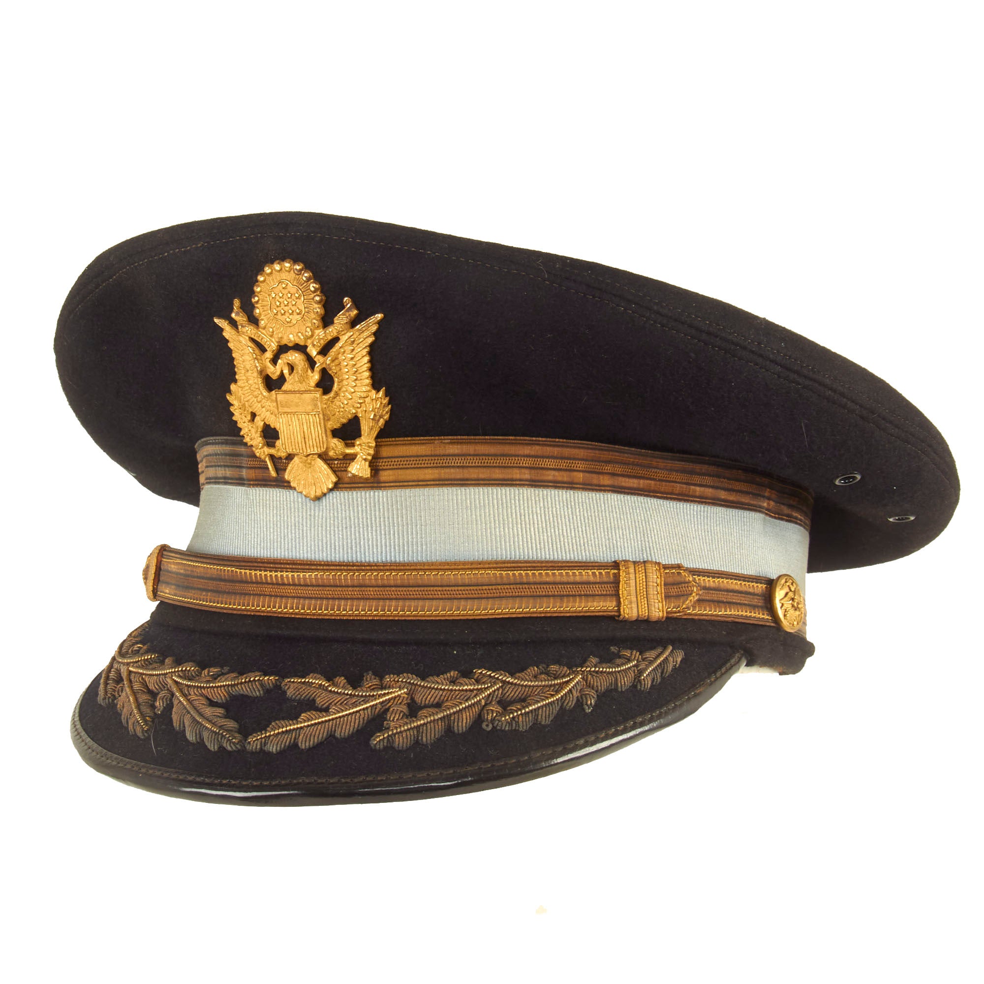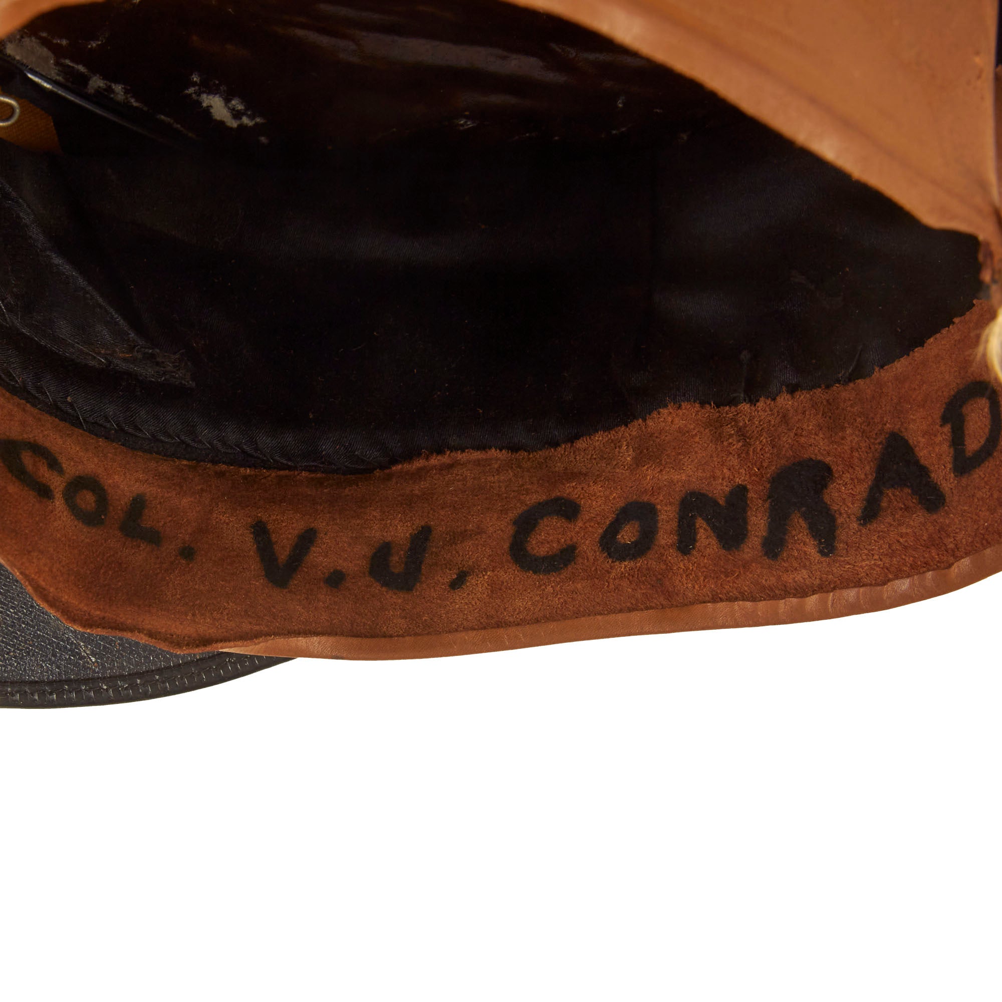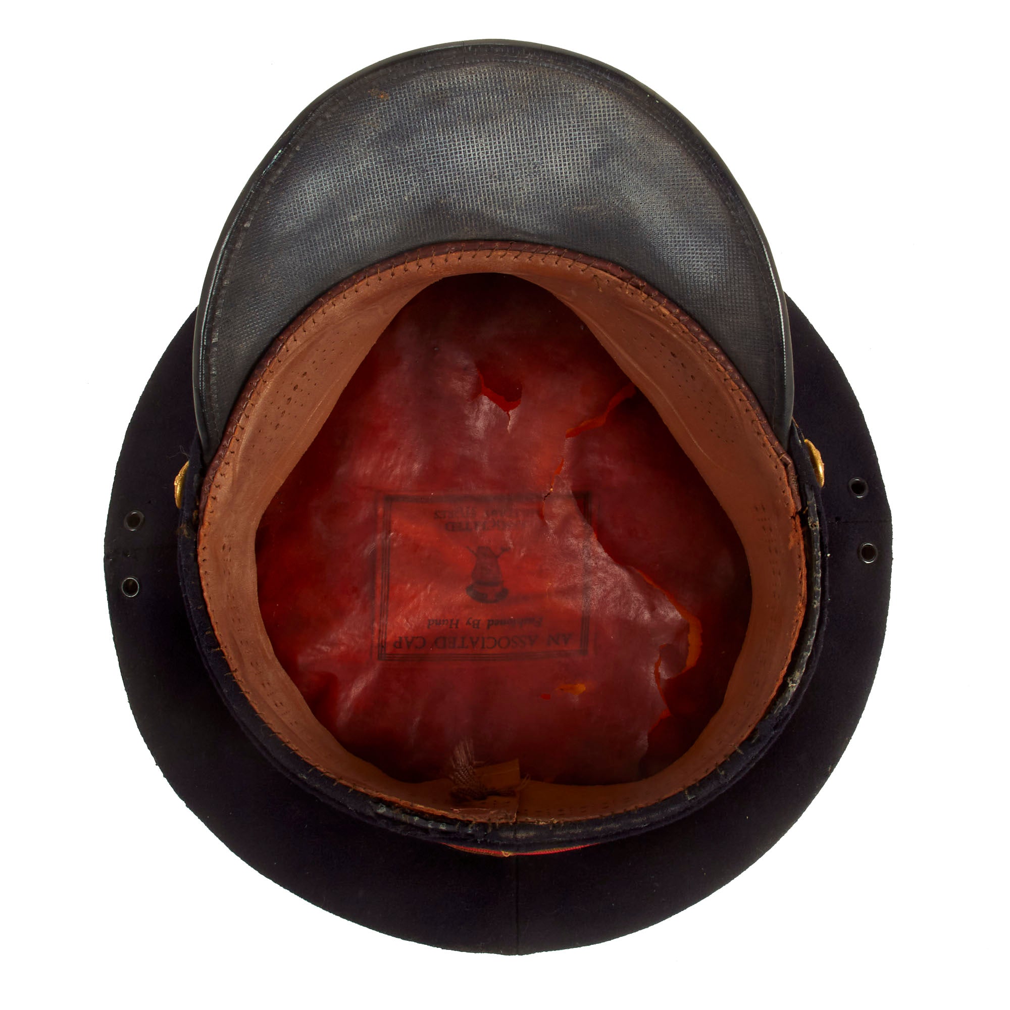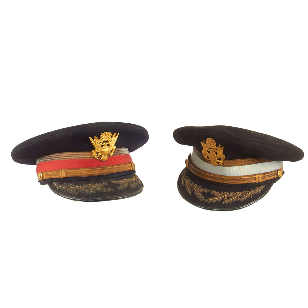 Both visors are in great display condition but are not without signs of faithful service wear. The caps are complete down to the manufacturer labels on the tops of the crown. There is slight detach and thread loss on the leather sweatbands but are otherwise present.