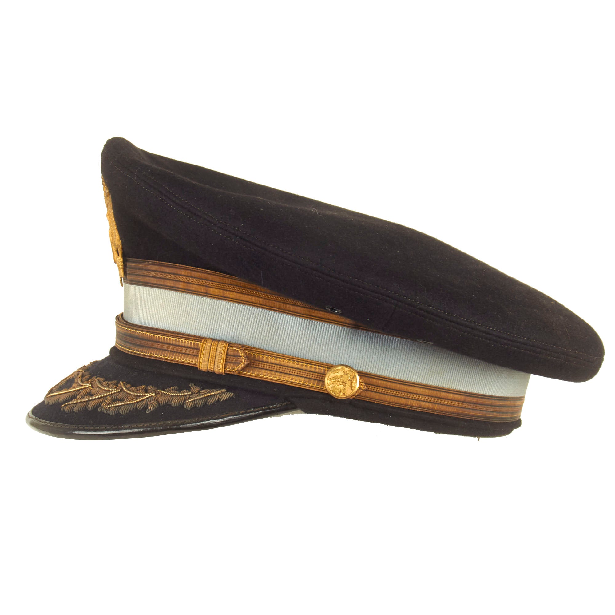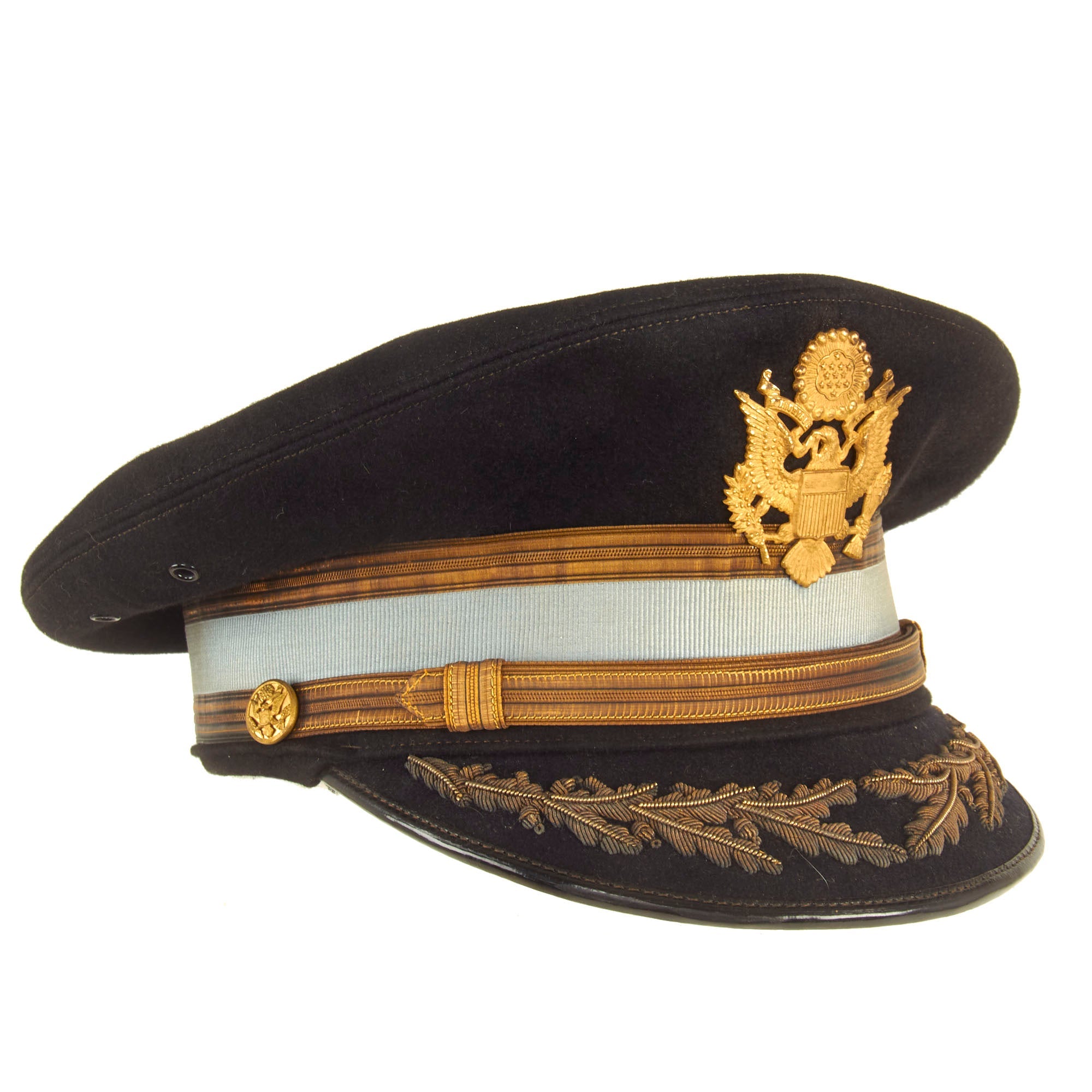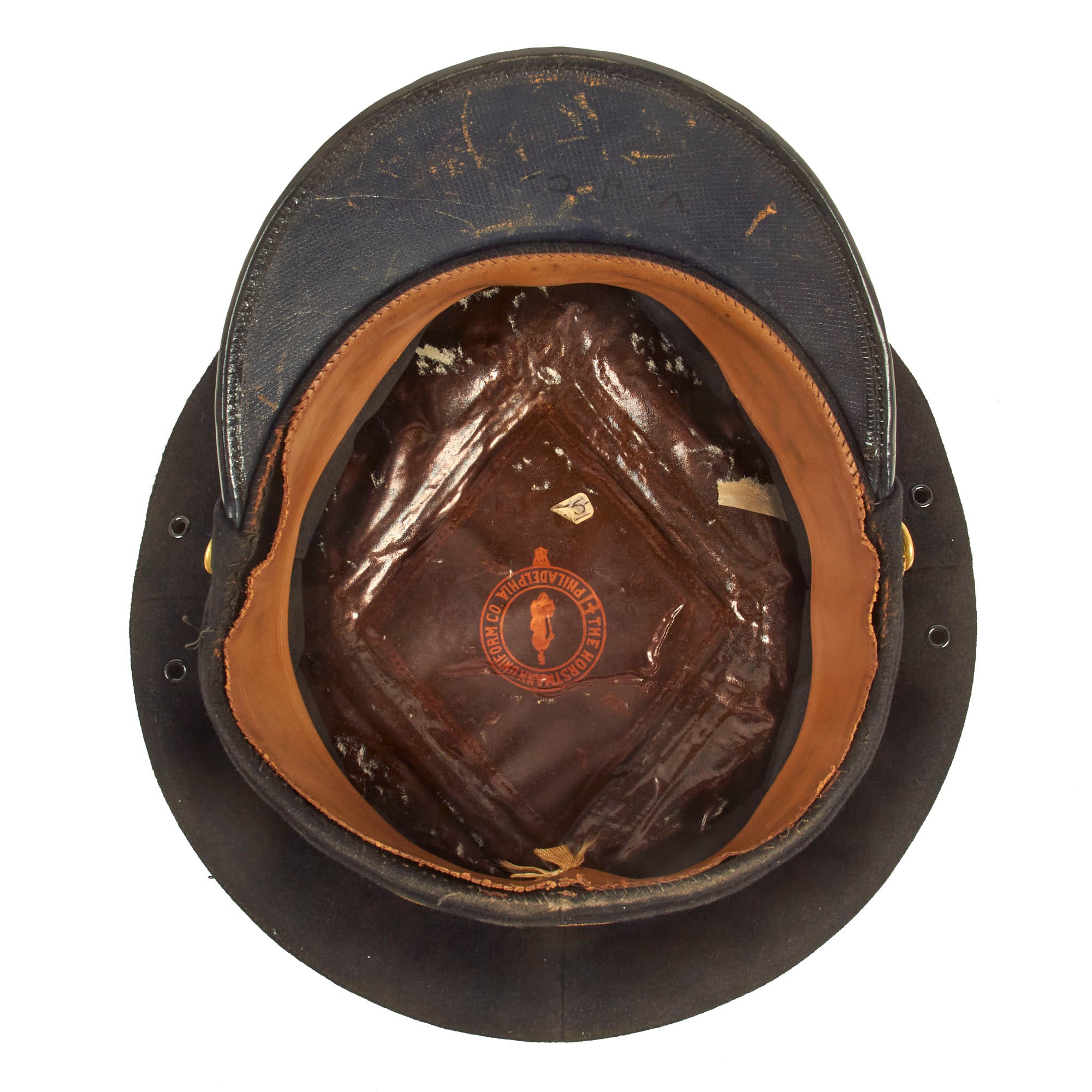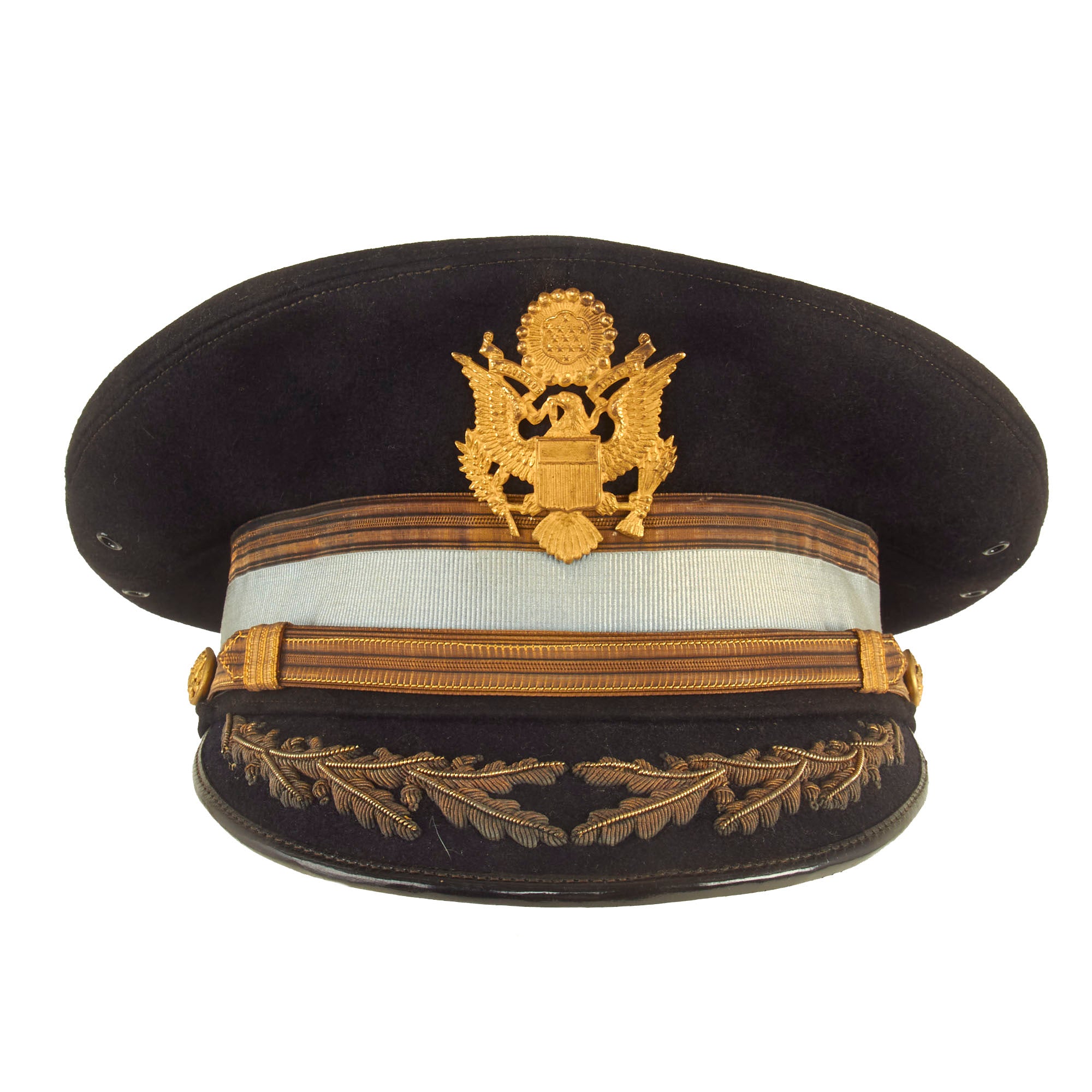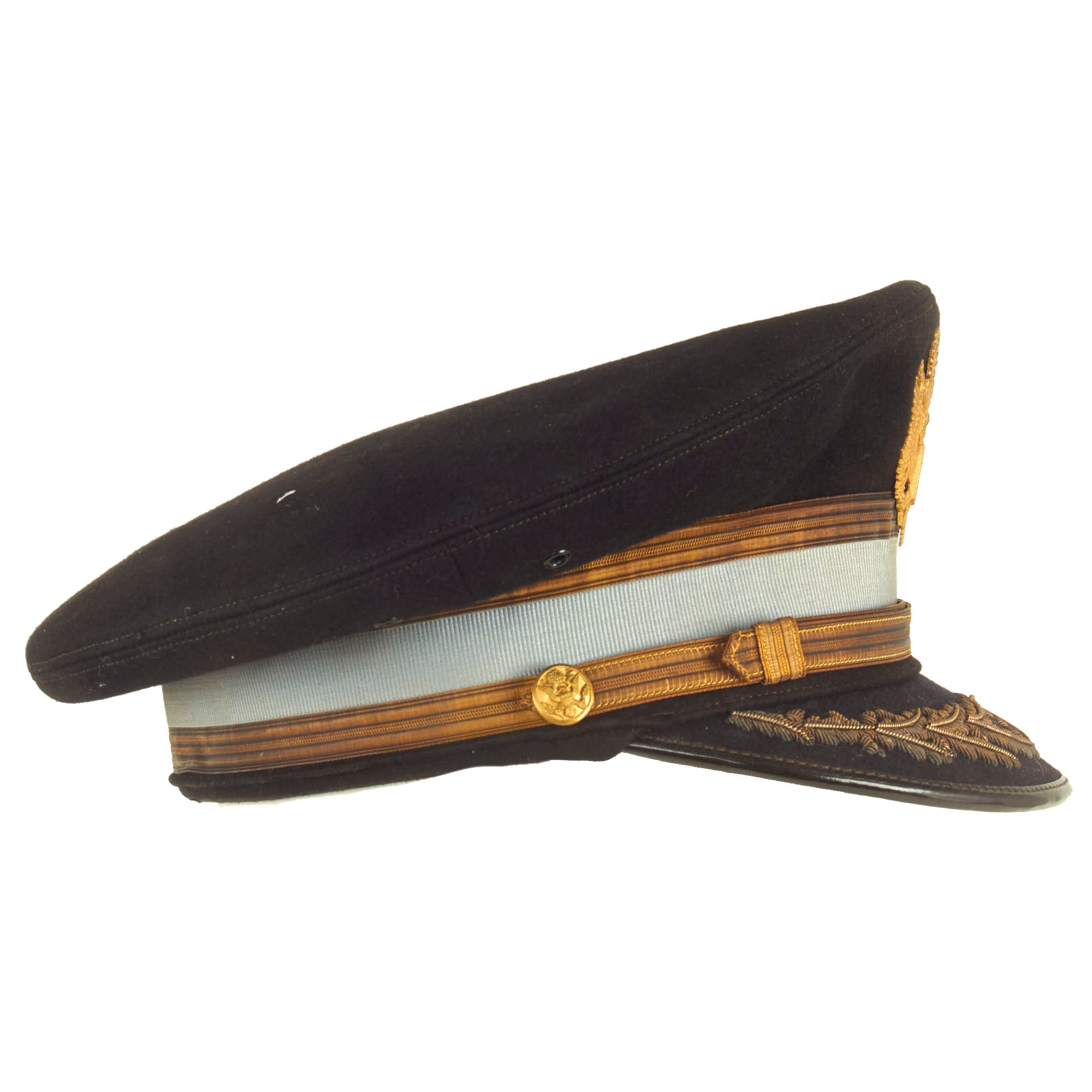Both visors are in great display condition but are not without signs of faithful service wear. The caps are complete down to the manufacturer labels on the tops of the crown. There is slight detach and thread loss on the leather sweatbands but are otherwise present.