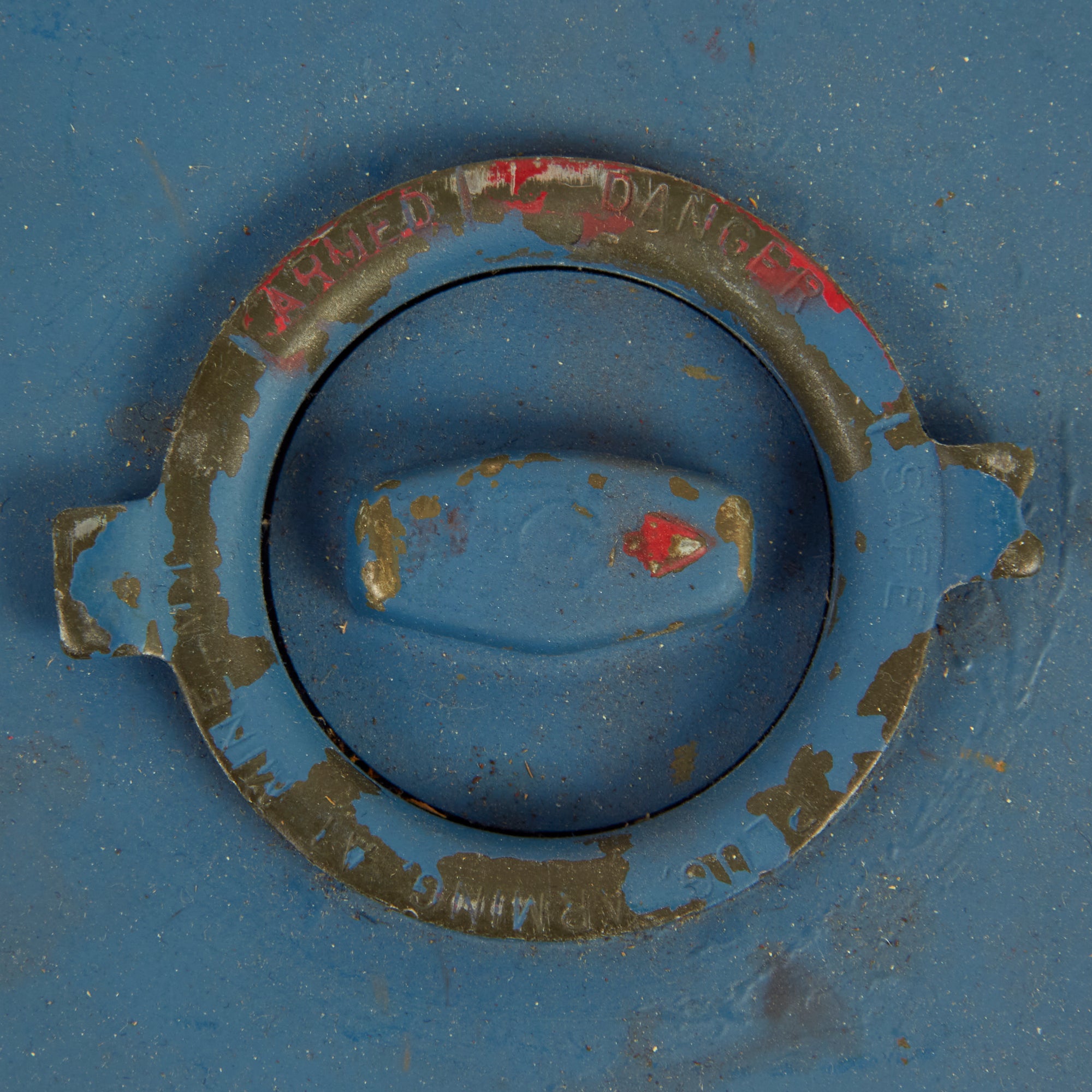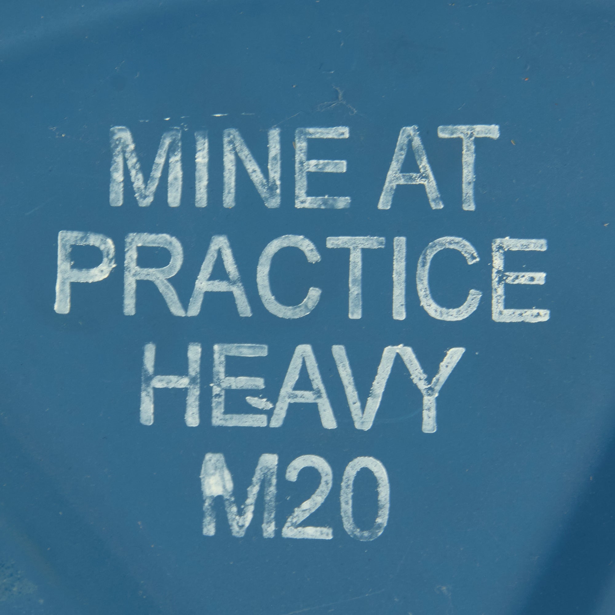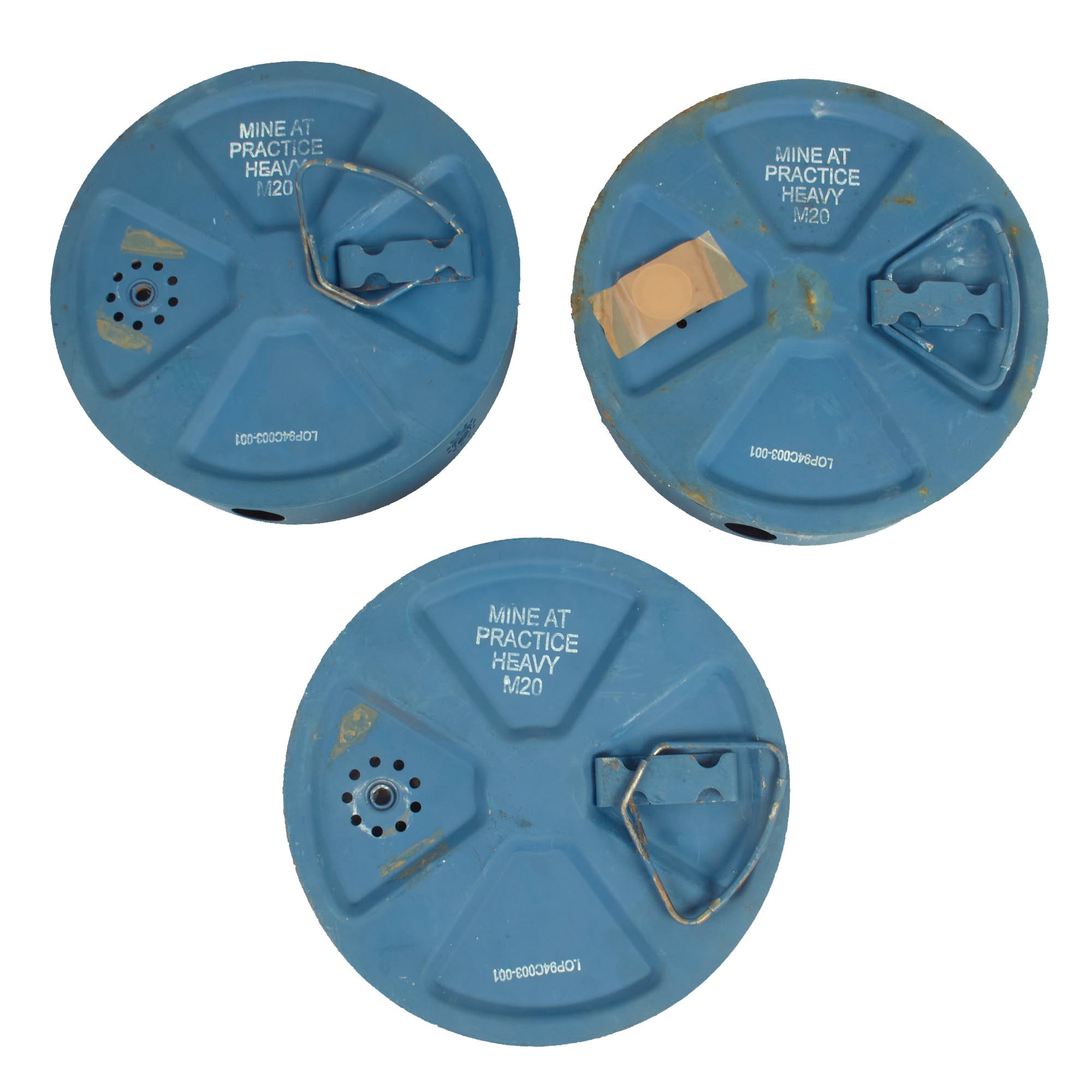 The M20 practice mine is a flat, cylindrical, steel casing externally similar to the high explosive mine M15, and earlier M12 training mine. It is shipped empty, with the arming plug assembled over the primary fuze well, but without primary or secondary fuzes. It is to be loaded with sand and fuzed in the field. The mine is inert, but explosive components will be found in the primary fuze, and if used, in the secondary fuze and activator. The arming plug has a steel shutter which moves from a side position to a center position as the setting knob is moved from SAFE through DANGER to ARMED position. A wire carrying handle is provided. Mine is painted blue, the color of US training munitions. It measures approximately 13 x 4 3/4", and has vents on the top so that smoke is produced when it "triggers".