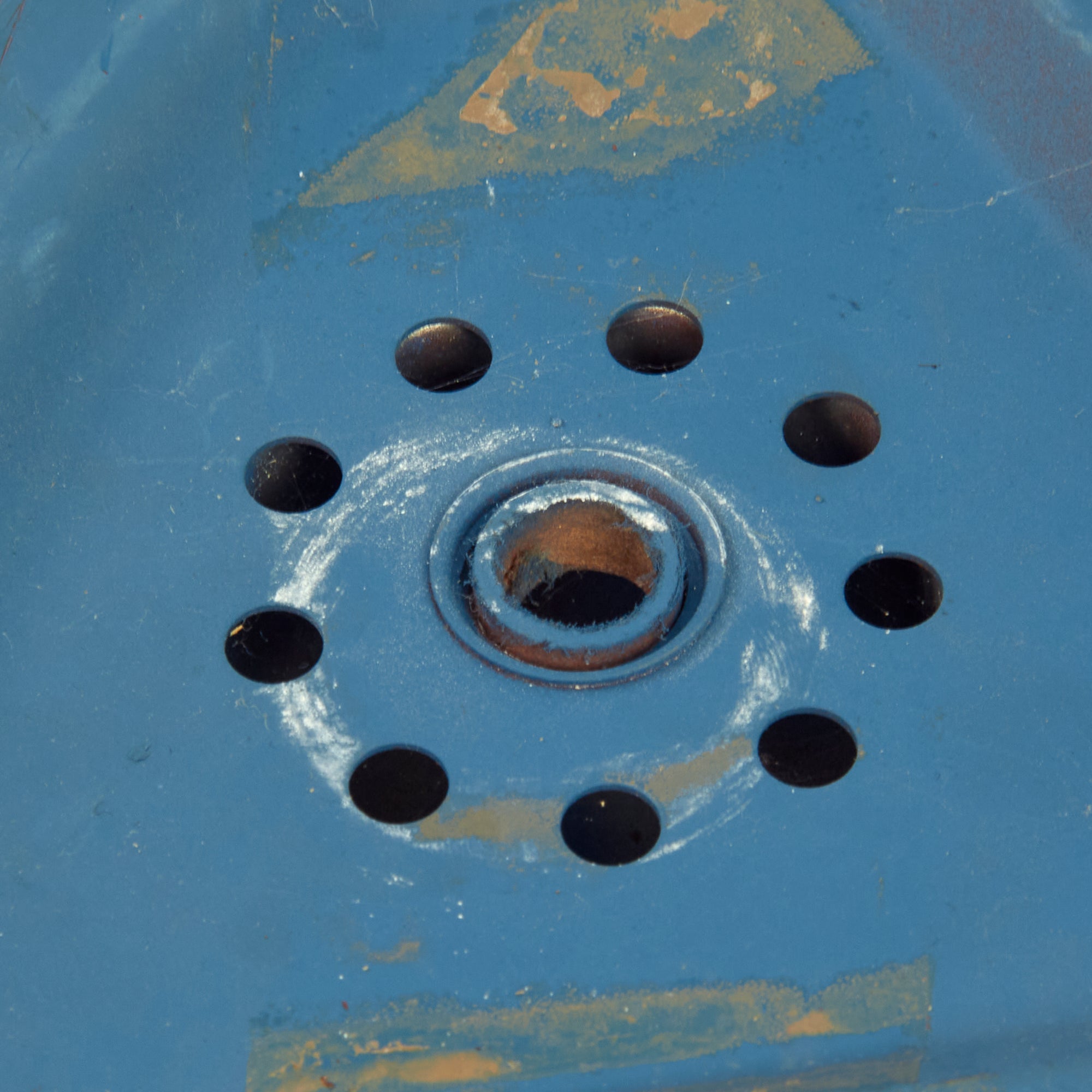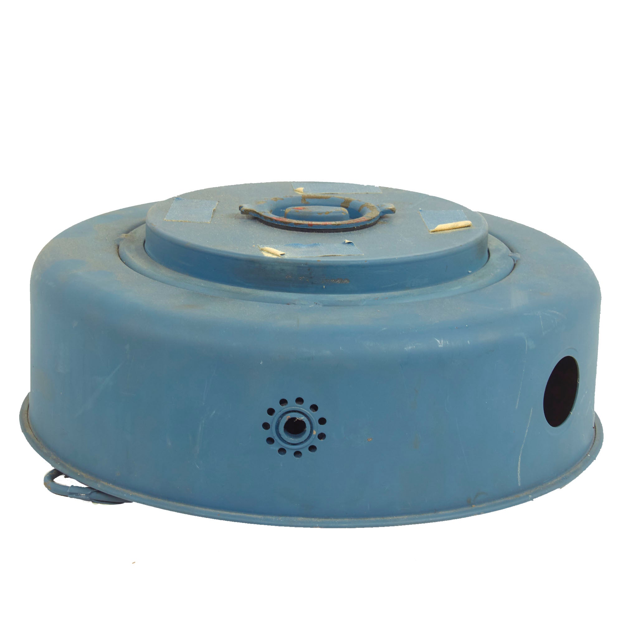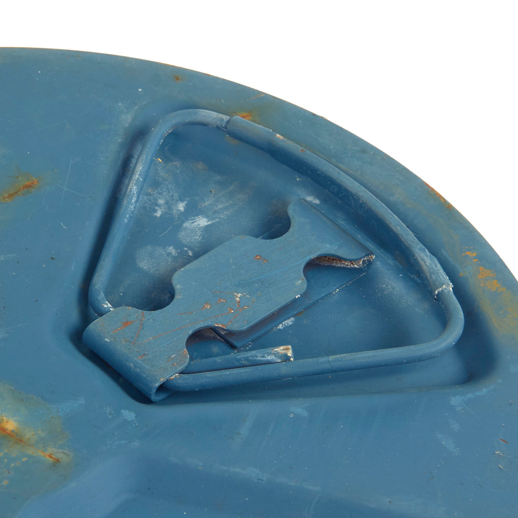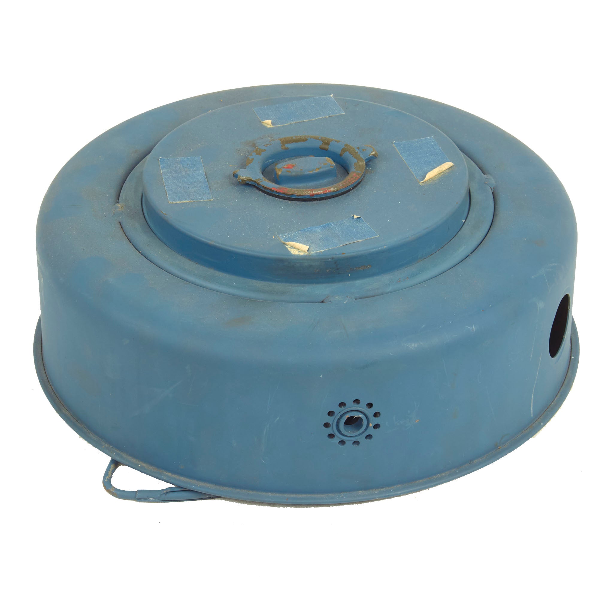 The M20 practice mine is a flat, cylindrical, steel casing externally similar to the high explosive mine M15, and earlier M12 training mine. It is shipped empty, with the arming plug assembled over the primary fuze well, but without primary or secondary fuzes. It is to be loaded with sand and fuzed in the field. The mine is inert, but explosive components will be found in the primary fuze, and if used, in the secondary fuze and activator. The arming plug has a steel shutter which moves from a side position to a center position as the setting knob is moved from SAFE through DANGER to ARMED position. A wire carrying handle is provided. Mine is painted blue, the color of US training munitions. It measures approximately 13 x 4 3/4", and has vents on the top so that smoke is produced when it "triggers".