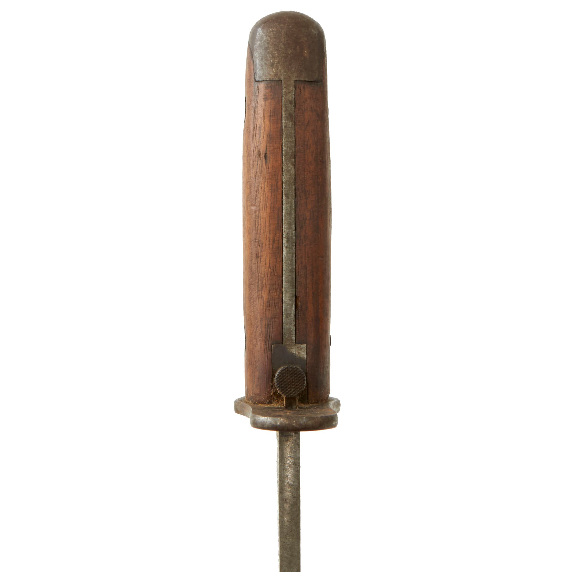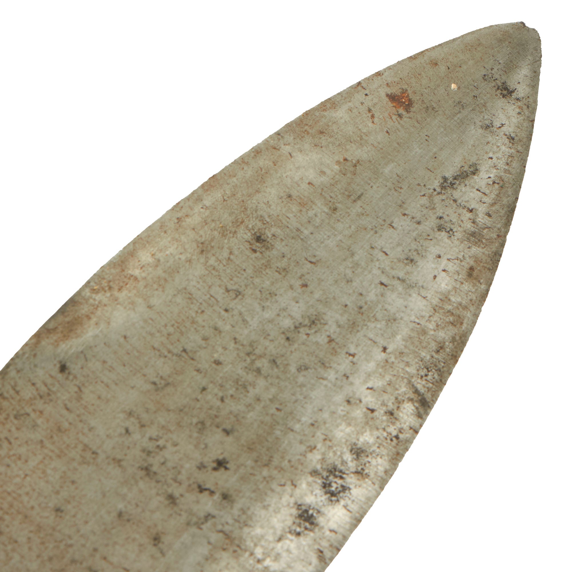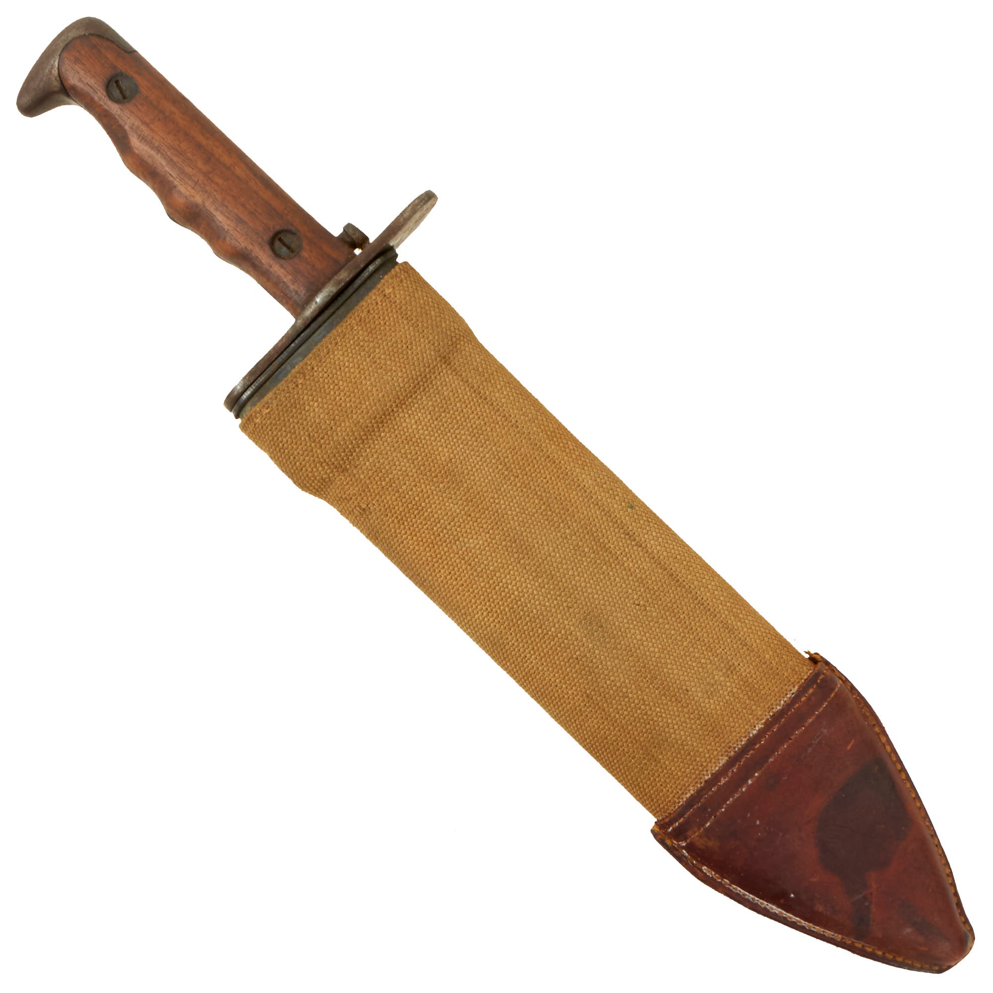 The M-1910 Bolo Knife was adopted to be used for clearing brush and foliage from fields of fire or for cutting through jungle growth. The M-1910 Bolo Knife was produced at the Springfield Armory between 1910 and 1917, and official armory records indicated just under 60,000 were produced. Many of these were refurbished for use in WW2 and parkerized, but this knife is still in the WW1 configuration.