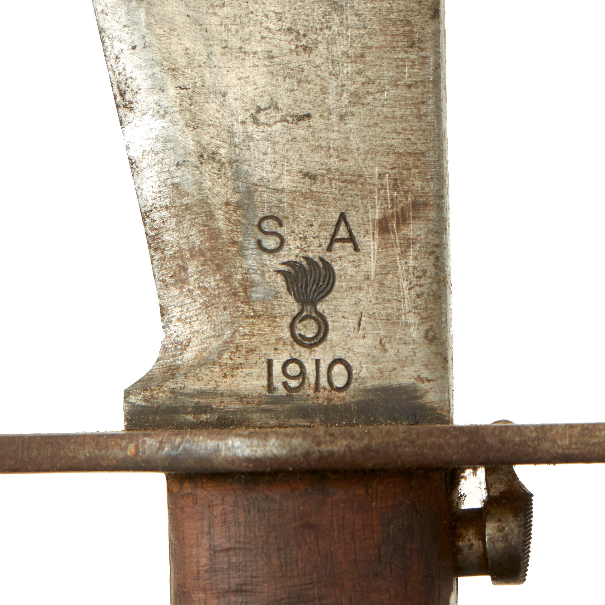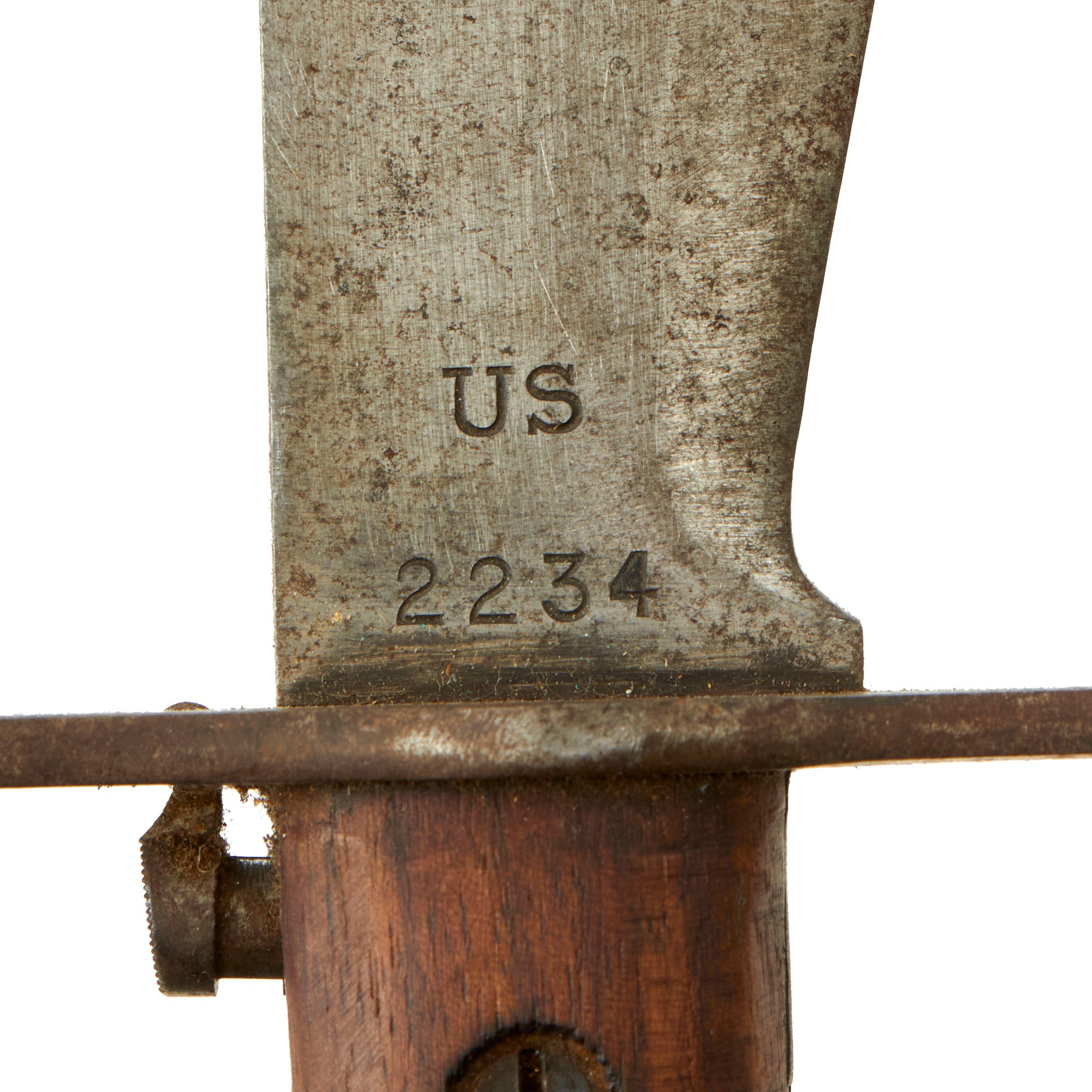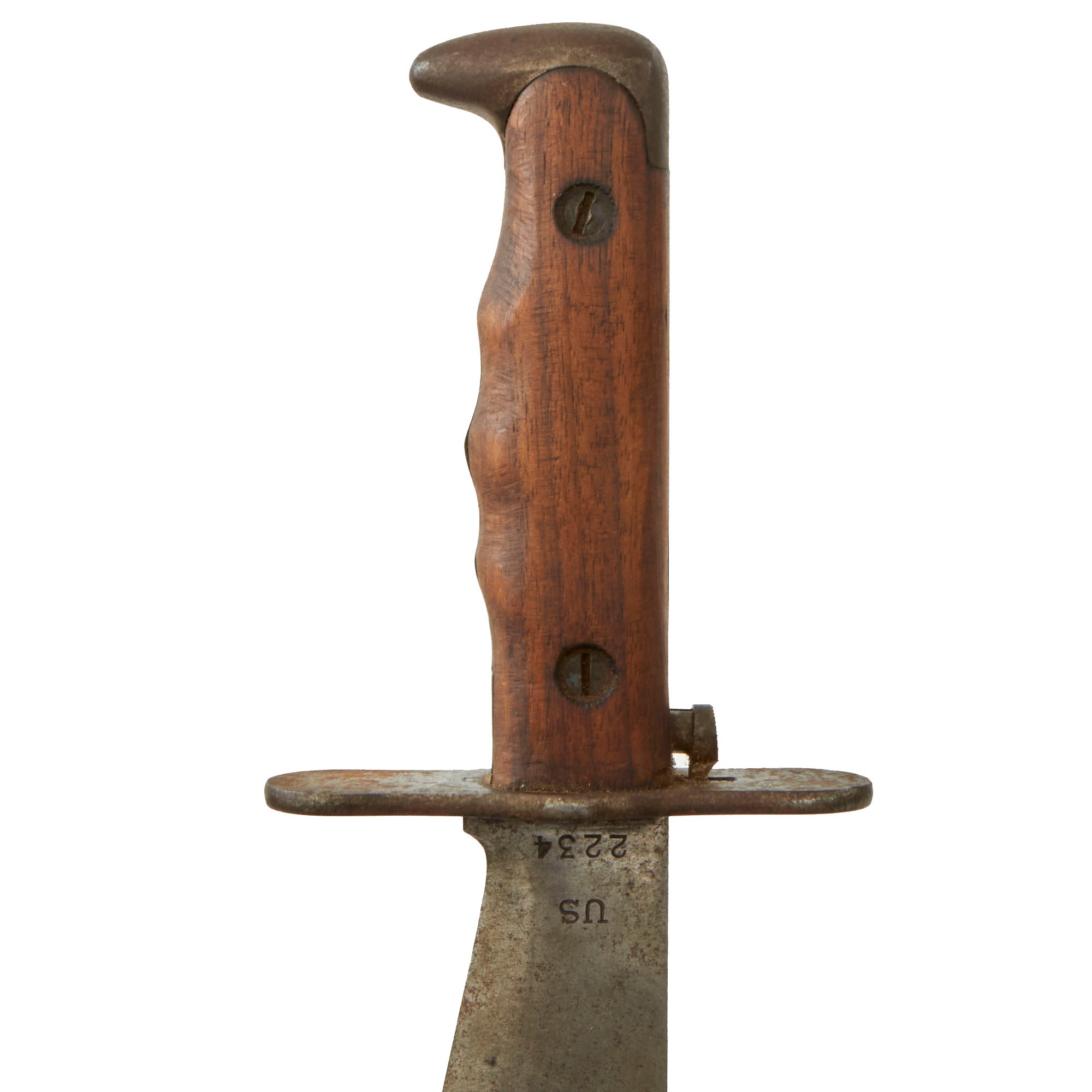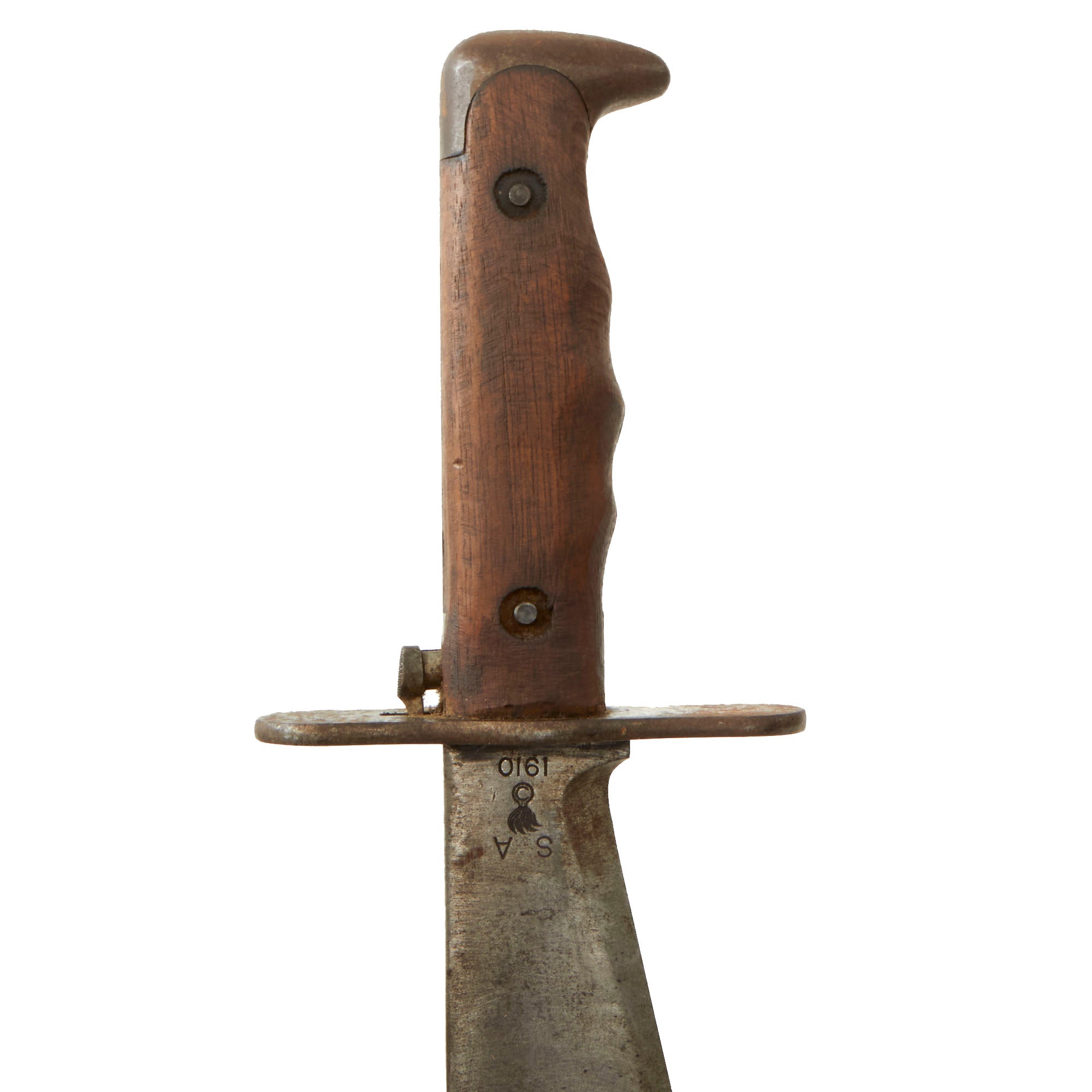 Original Item: Only One Available. This is a very nice service used Model 1910 Bolo knife, manufactured by the storied Springfield Armory of Springfield, Massachusetts. This model is almost identical to the later model 1917 by Plumb, with the exception of the scabbard catch on the 1910. Also, the 1917 issue were all Parkerized, while the model 1910 was issued in bright steel.