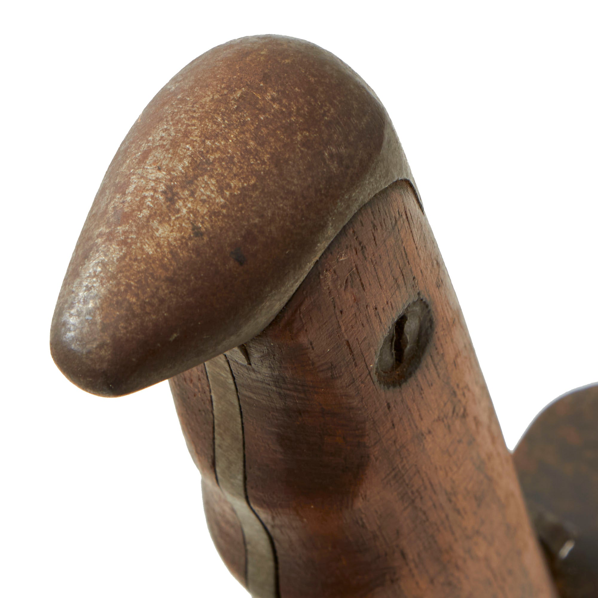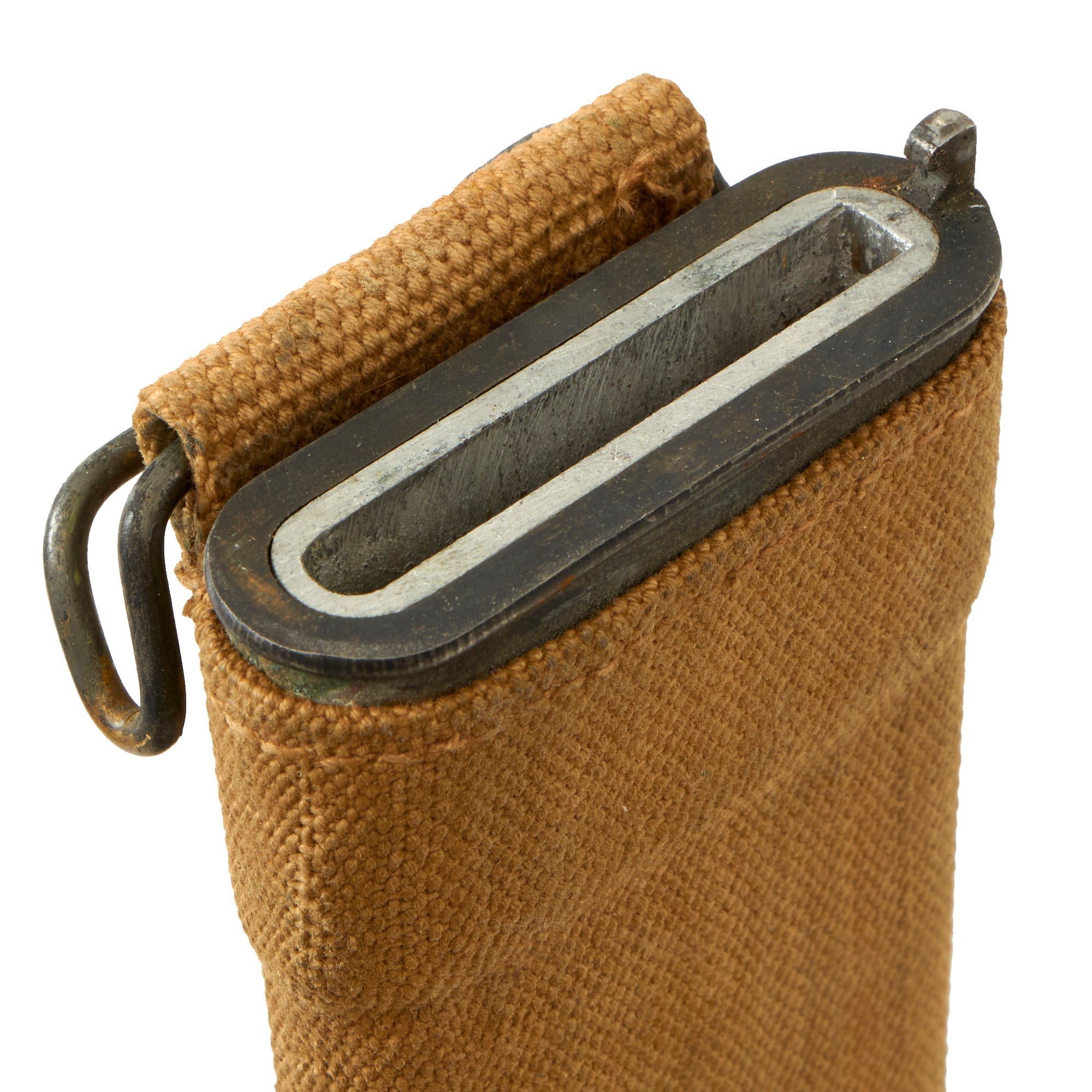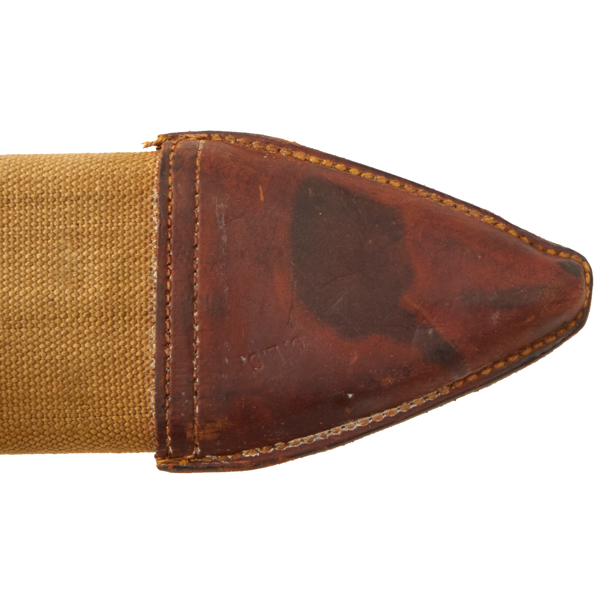The standard M-1910 Bolo Scabbard was fashioned much in the same manner of the M-1910 bayonet scabbard with wood covered in sewn pigskin, a metal throat, metal belt hanger, and a canvas cover with leather tip. It was then modified in 1917 to remove the securing hook for the knife, as that feature was removed though not done on this example. The leather tip of the canvas scabbard sleeve no longer has any visible markings.