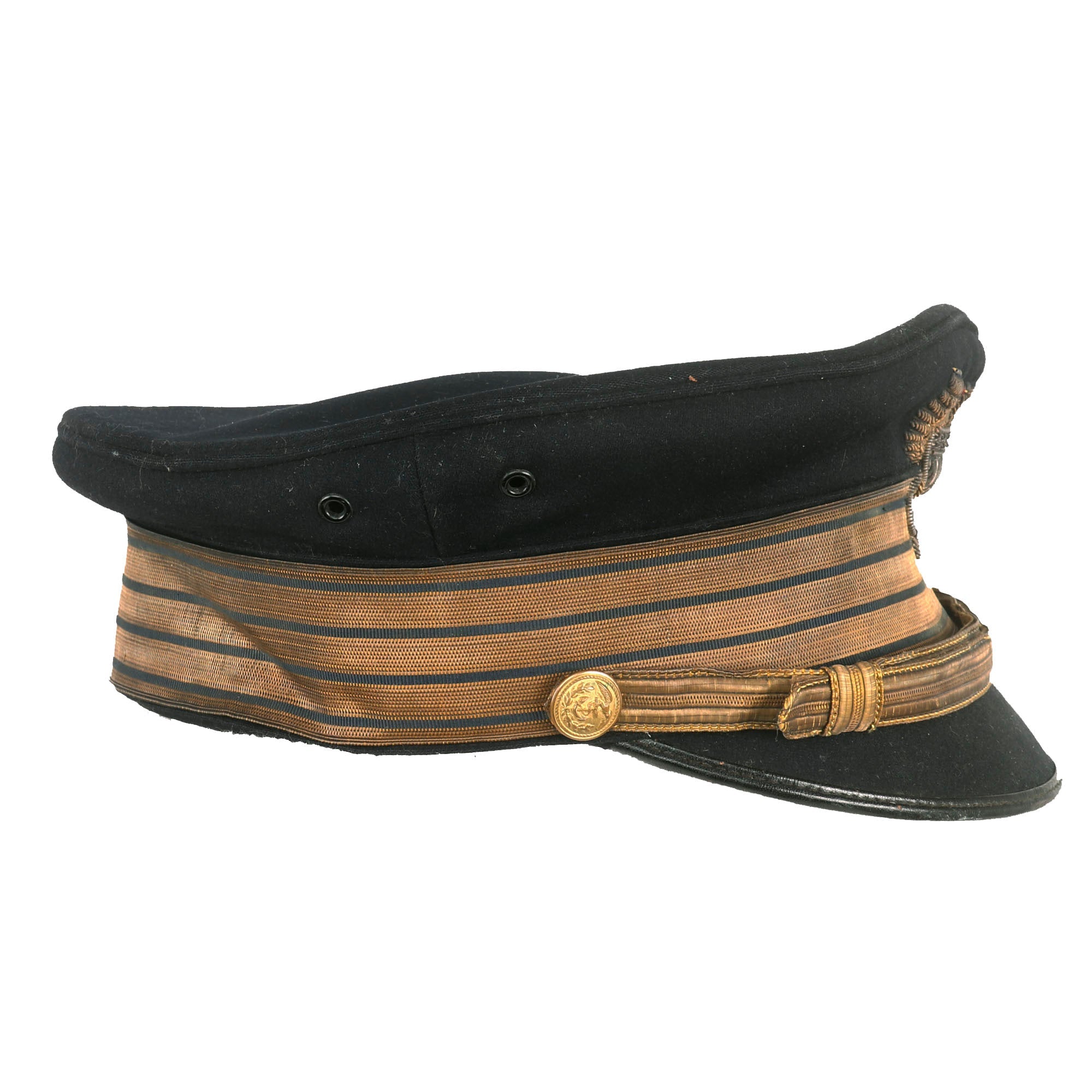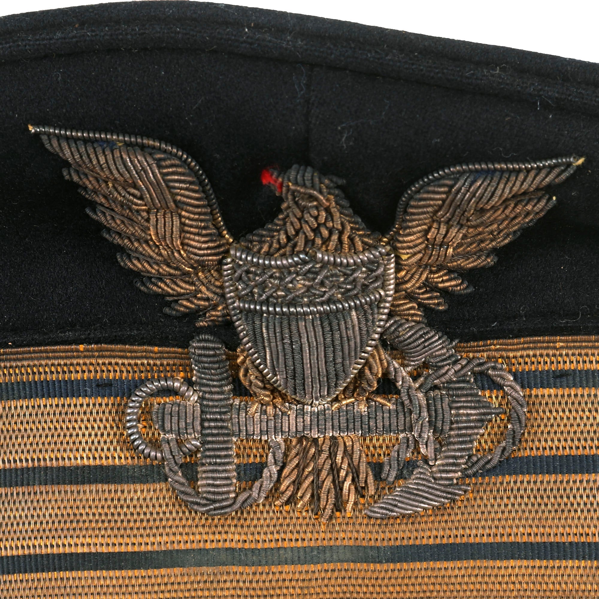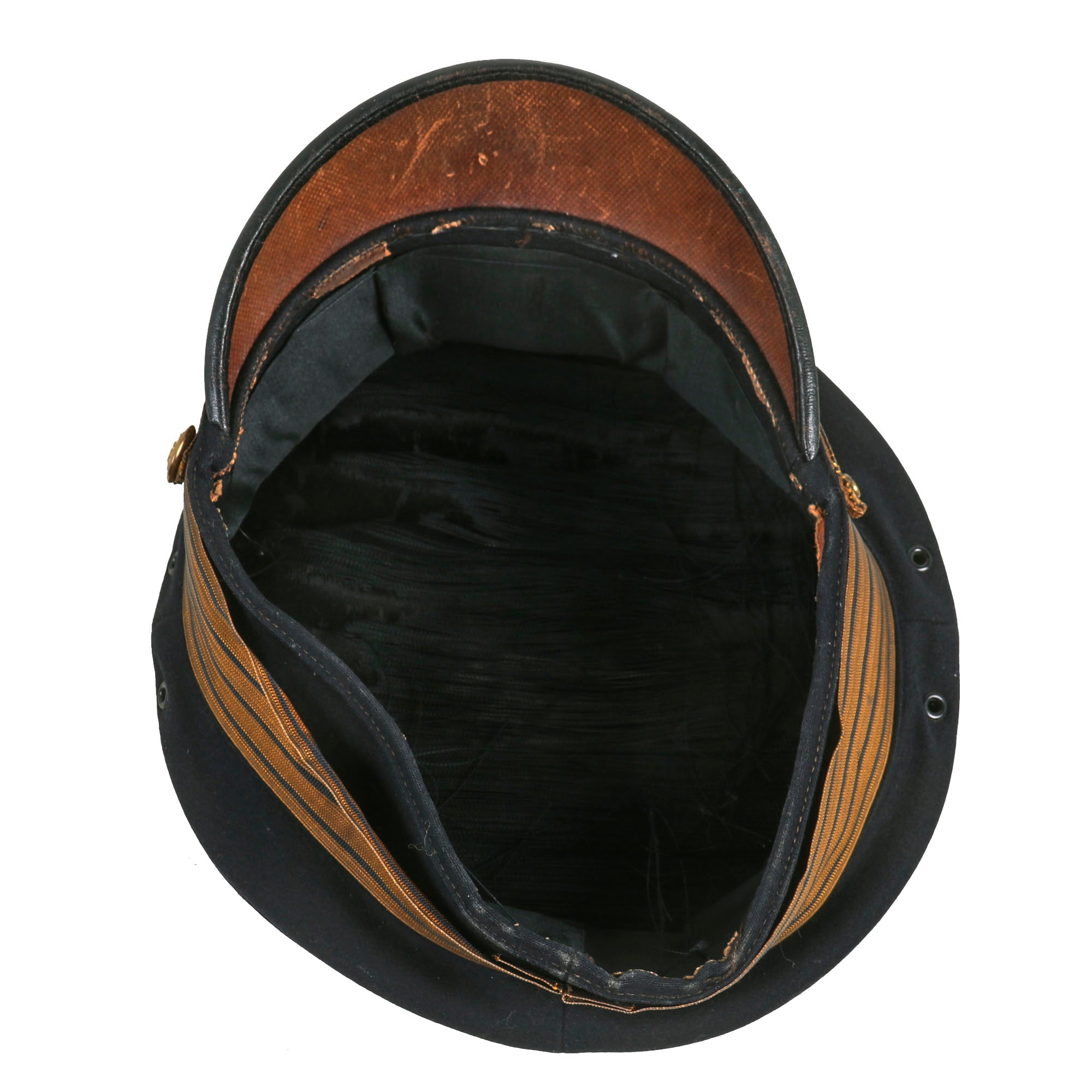 This very rare cap bears the bullion insignia of the U.S. Coast Guard, an American Eagle with shield holding an anchor in its talons. The gold striped band around the cap indicates the rank of Admiral. The gilt chinstrap is held in place by a button and a screw as shown on one side. This may be a period repair or could’ve been done a few years later. The interior sweatband is absent, and the cloth at the interior is splitting in many spots as shown. It seems to be about a size 7 1/4, but that is without a sweatband.