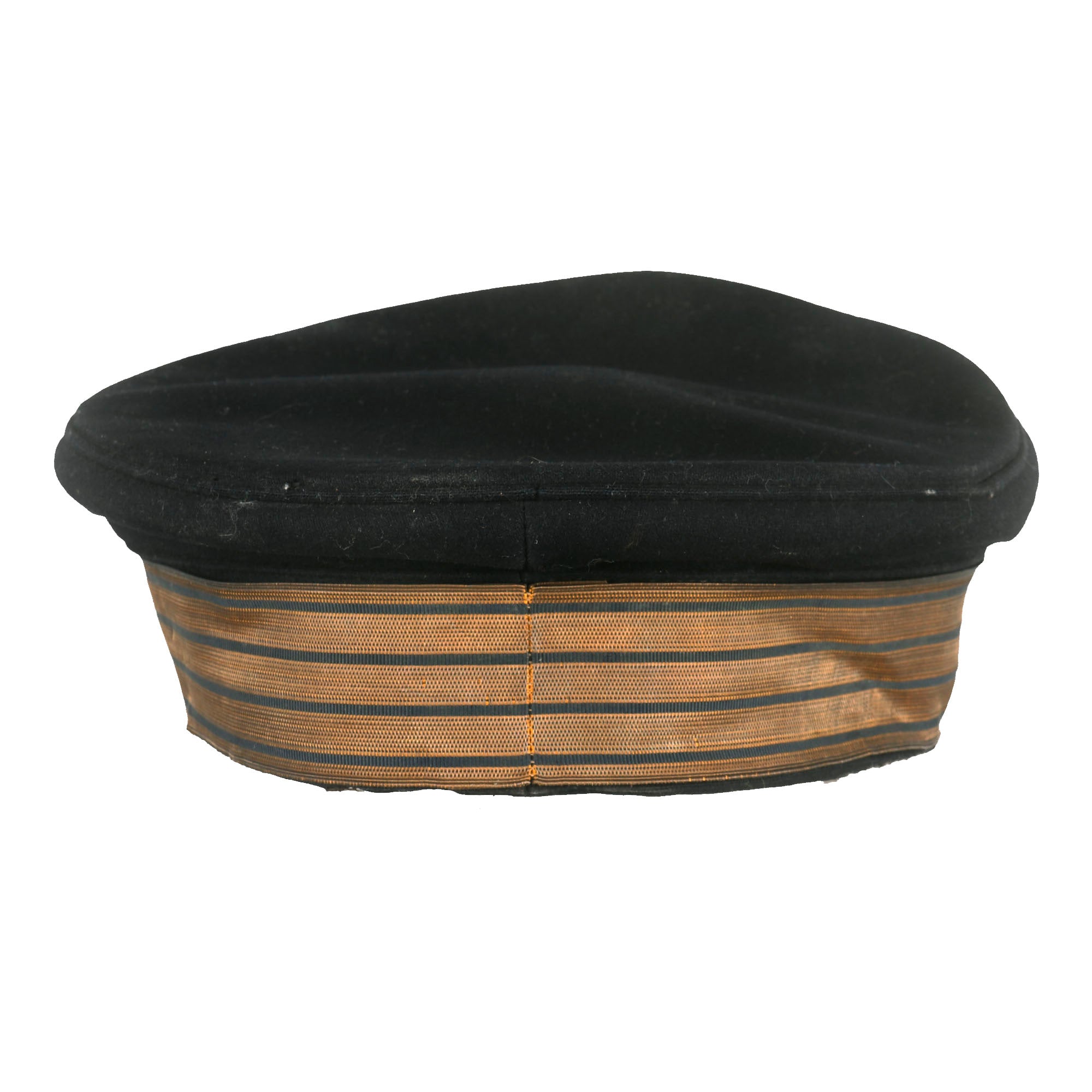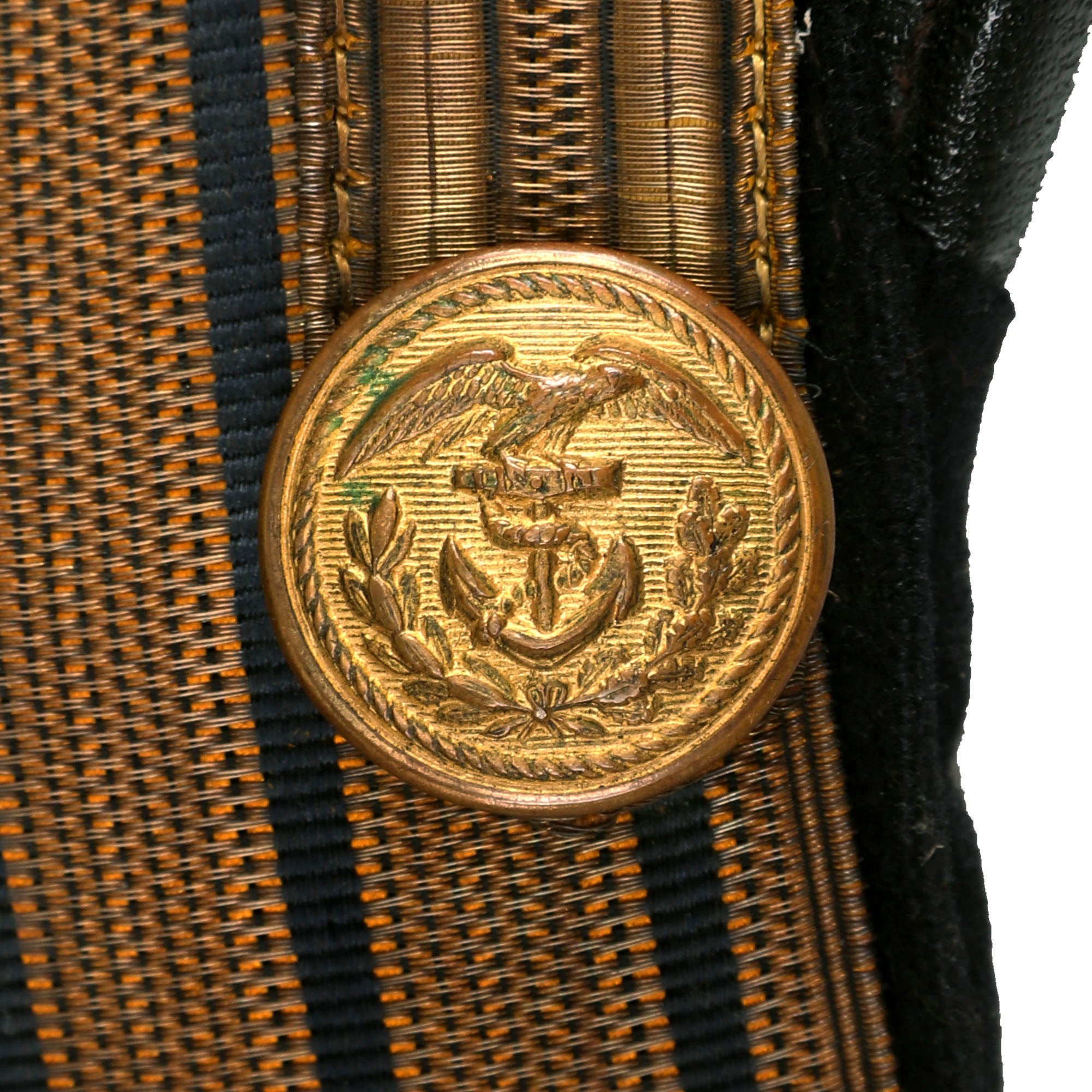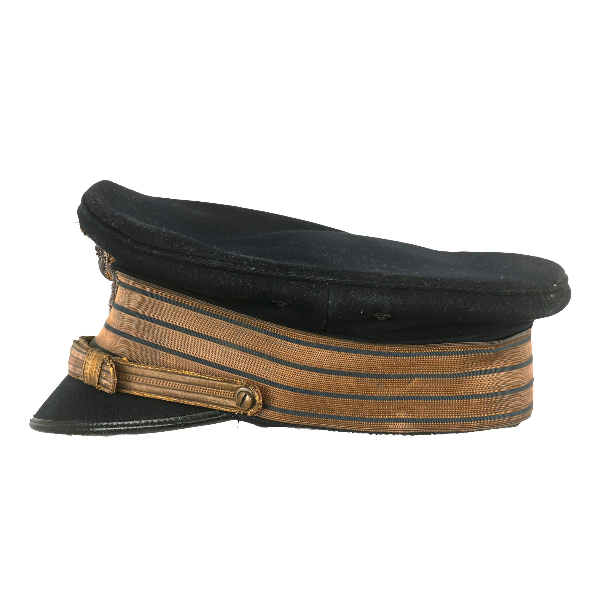 This very rare cap bears the bullion insignia of the U.S. Coast Guard, an American Eagle with shield holding an anchor in its talons. The gold striped band around the cap indicates the rank of Admiral. The gilt chinstrap is held in place by a button and a screw as shown on one side. This may be a period repair or could’ve been done a few years later. The interior sweatband is absent, and the cloth at the interior is splitting in many spots as shown. It seems to be about a size 7 1/4, but that is without a sweatband.