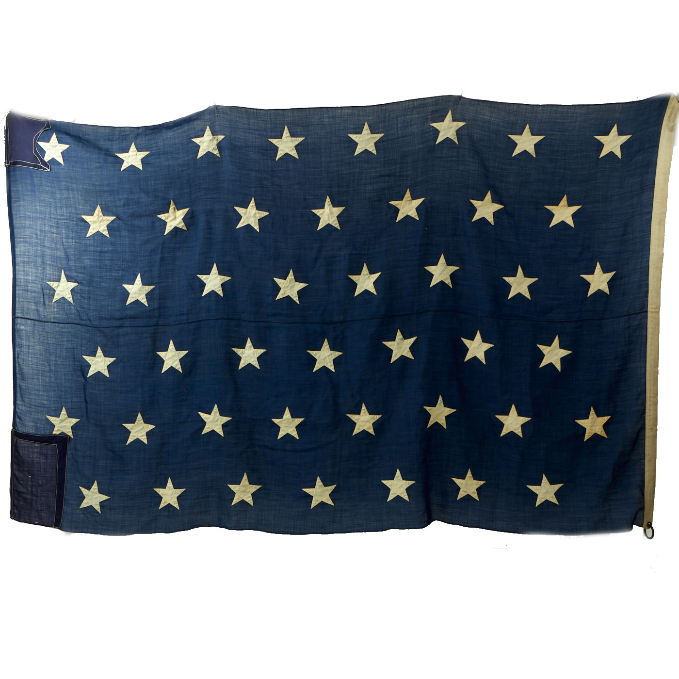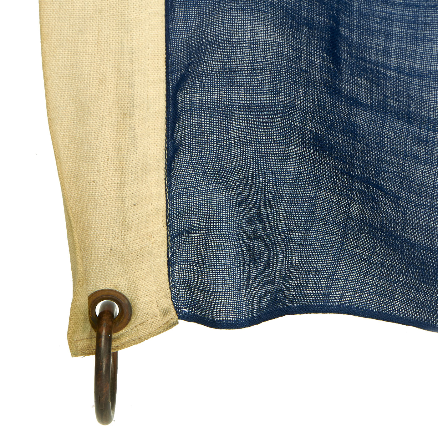 Original Item: Only One Available. This is a wonderful issued example of a WWII US Navy “Jack of the United States”. This is a wonderful 45 Star Union Jack Maritime Flag, which would have been flown on the jackstaff in the bow of U.S. vessels that were moored or anchored. There appears to be two repair marks in each right corner.