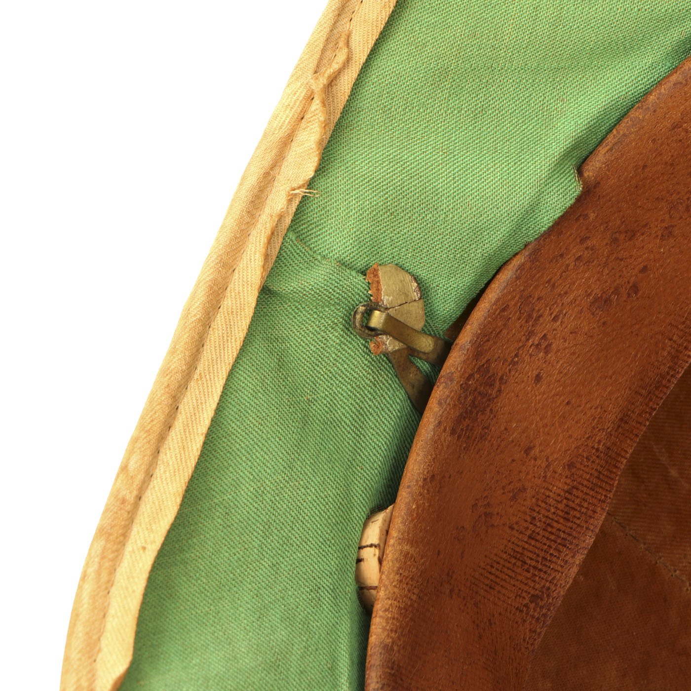 This helmet dates to just after the conflict, probably during the first 10 years of the 20th century. It has a lovely khaki color exterior, with the correct 4 panel construction and top vent cover.