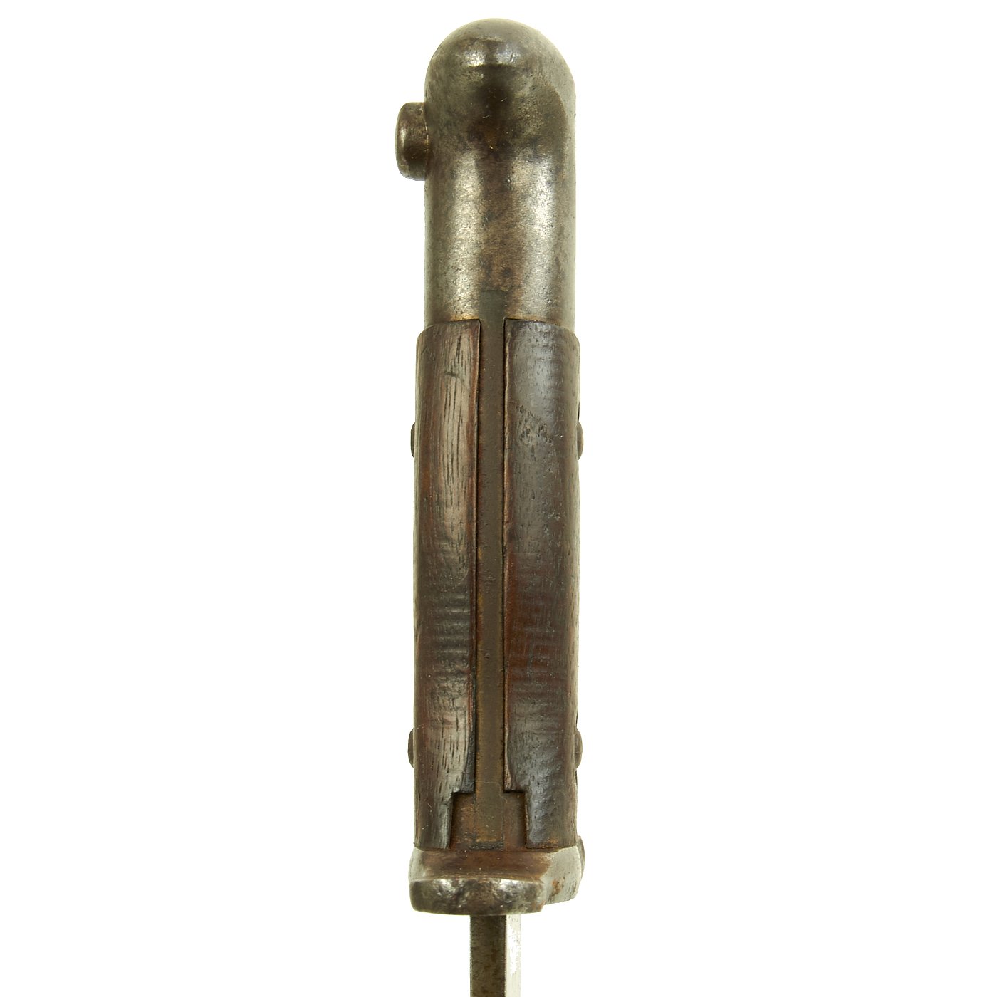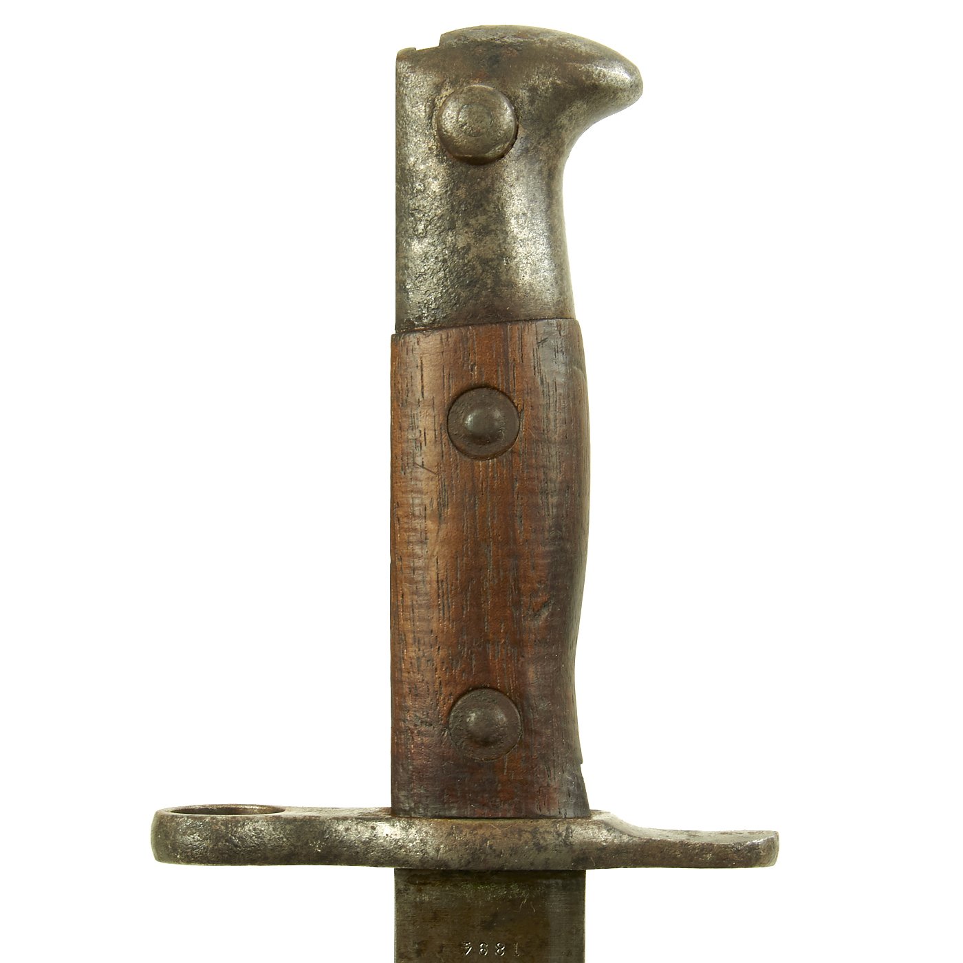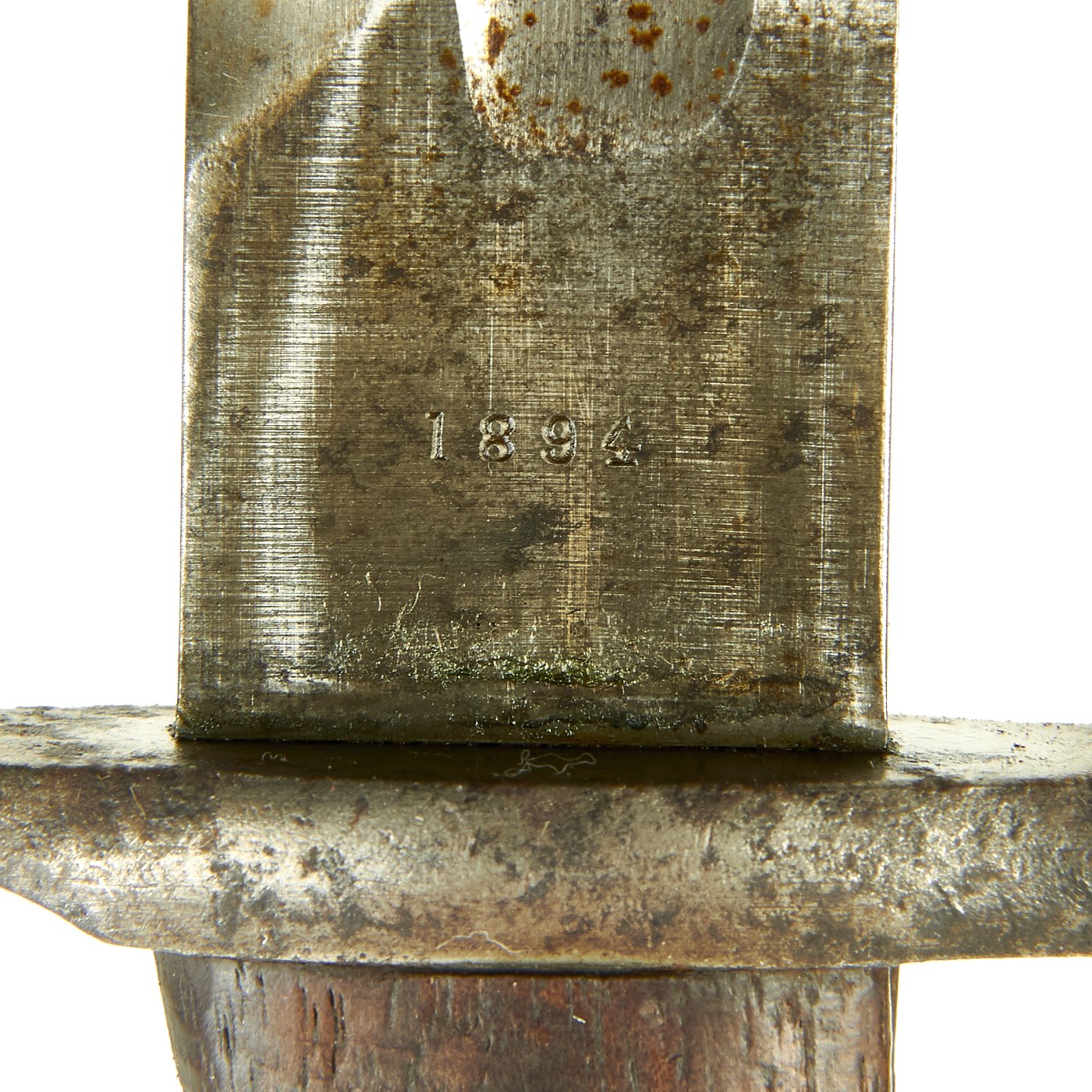 This example is in very good condition, with the original bright finish and a great blade with just a few spots of staining. It has been sharpened, and also was definitely sent back to arsenal once, as it has been refit with 1899 pattern "Ribbed" grip plates, which still have the texture easily visible. It also has "Domed" rivets, which have not been ground smooth like they were before 1899. The wood is in great shape, with only a bit of wear. The blade is dated 1894 on one side, and US on the other, and has a fully functional bayonet catch.