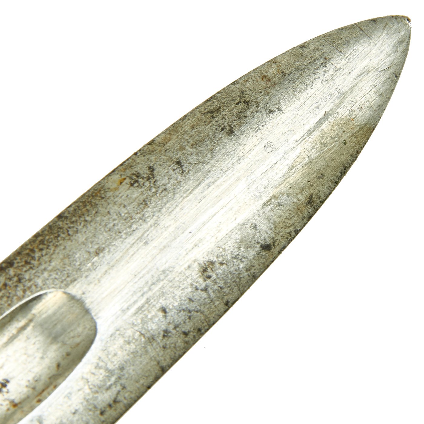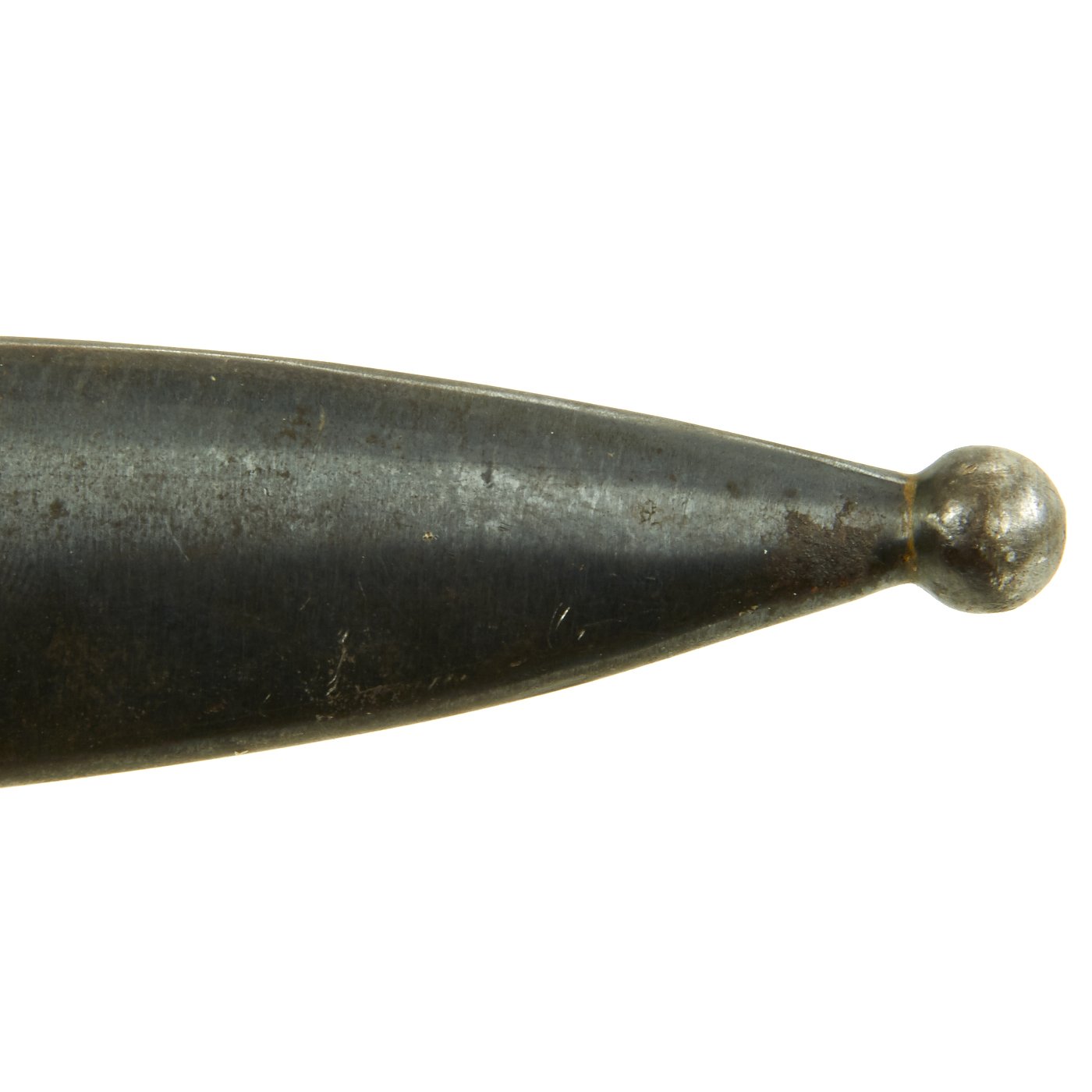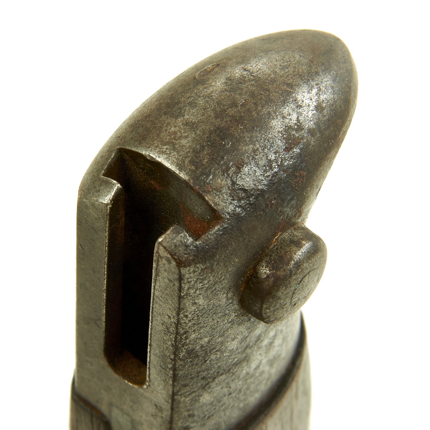This example is in very good condition, with the original bright finish and a great blade with just a few spots of staining. It has been sharpened, and also was definitely sent back to arsenal once, as it has been refit with 1899 pattern "Ribbed" grip plates, which still have the texture easily visible. It also has "Domed" rivets, which have not been ground smooth like they were before 1899. The wood is in great shape, with only a bit of wear. The blade is dated 1894 on one side, and US on the other, and has a fully functional bayonet catch.