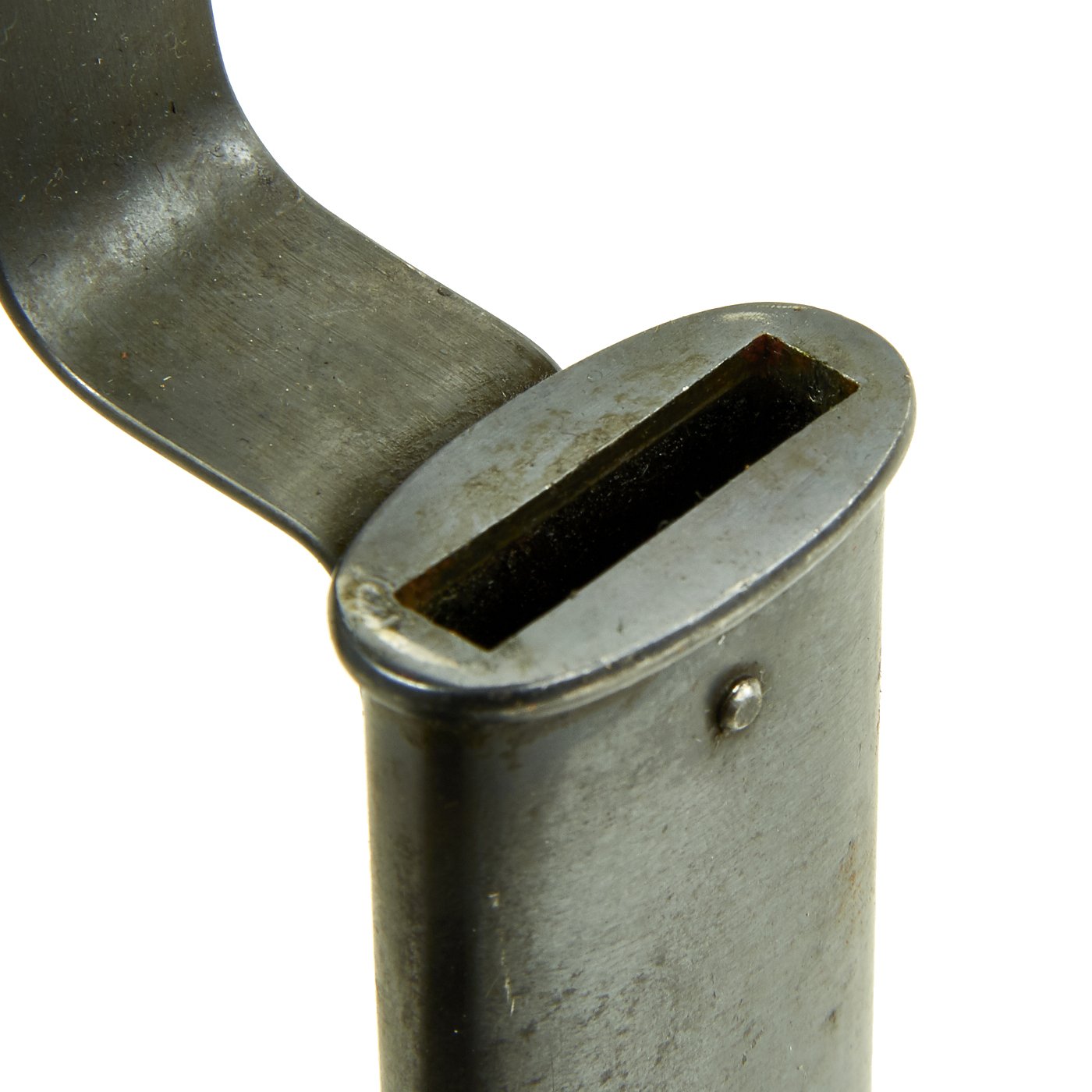 The scabbard is in excellent condition, with a blued finish with very little wear, and a fully functional swivel. The scabbard body is straight and dent free. It has the early type "hook" attachment, correct for an 1894 dated bayonet.