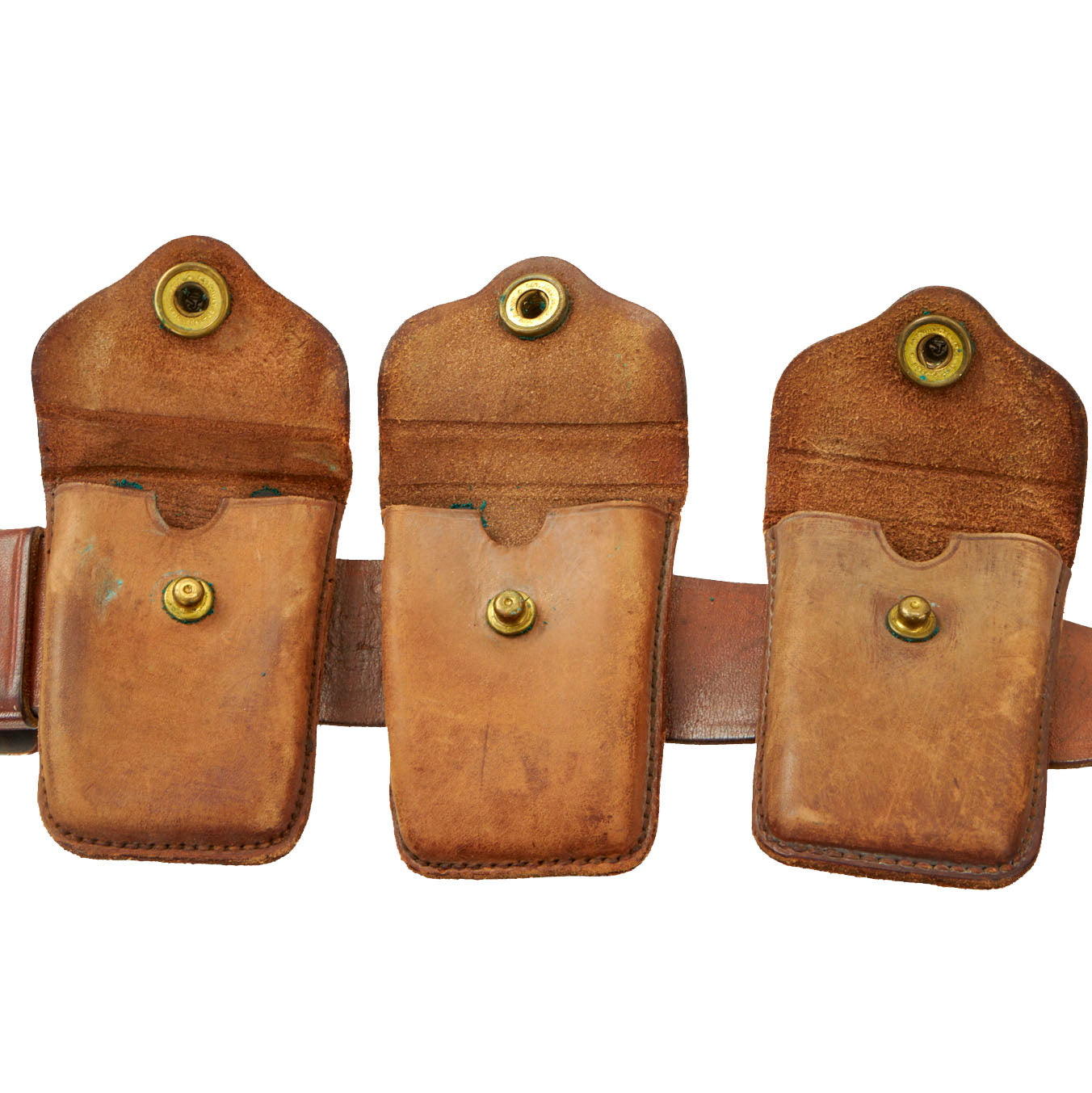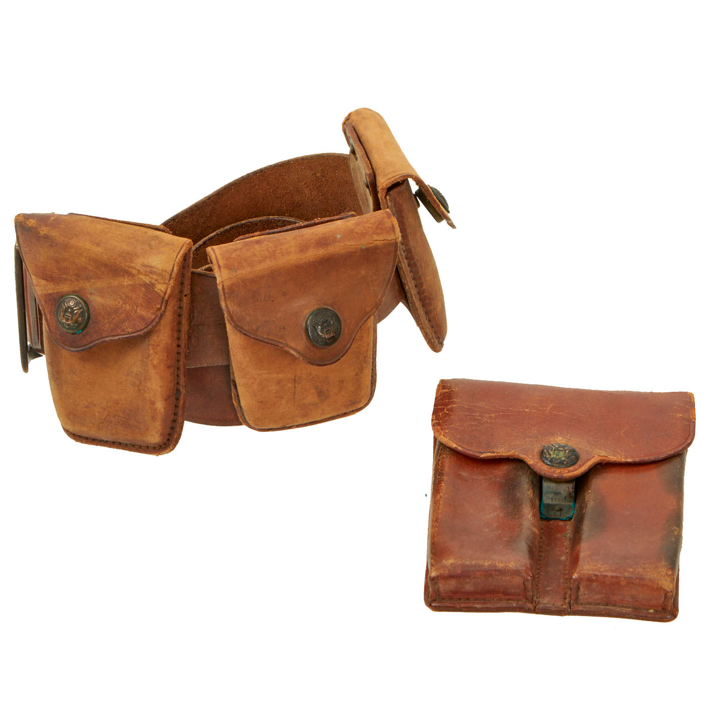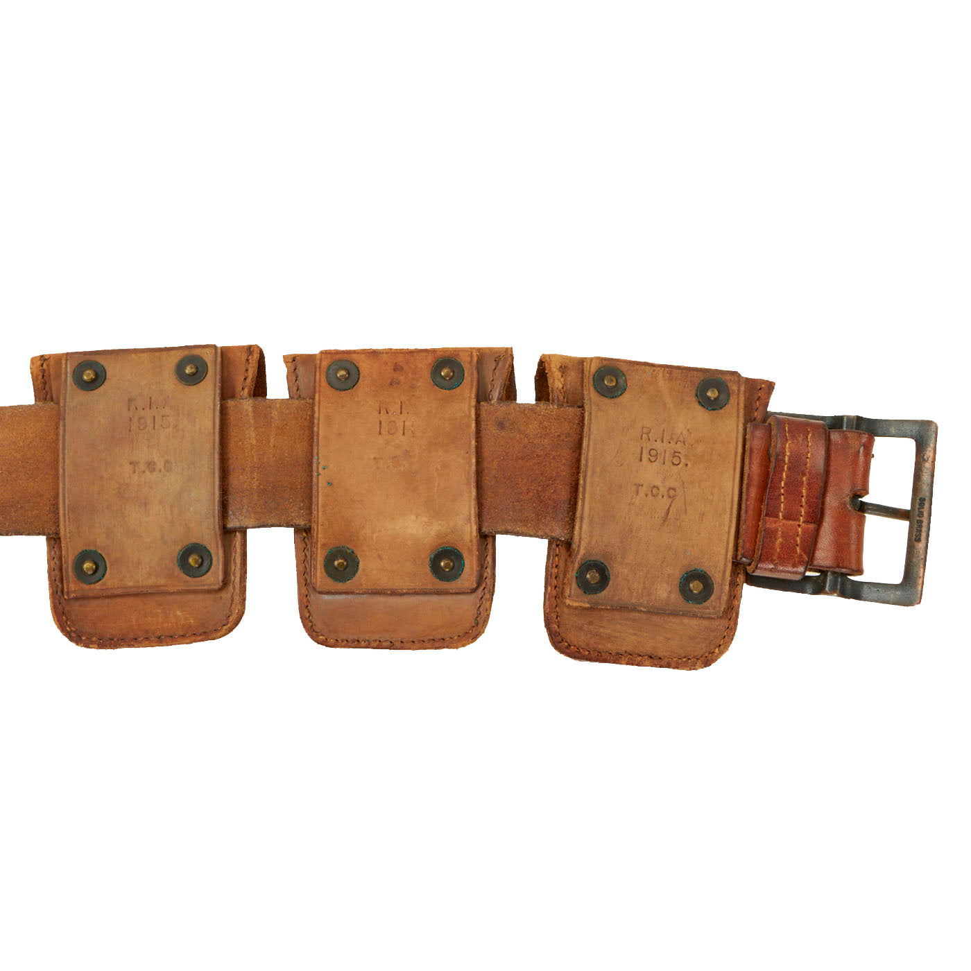 Original Items: Only One Set Available. This is a fantastic set of M1904 garrison belt, RIA 1913 Dated rimless eagle snap 1911 .45 cal twin magazine pouch, and three RIA rimmed eagle snap clip pouch for the Springfield M-1903 Rifle all dated 1915.