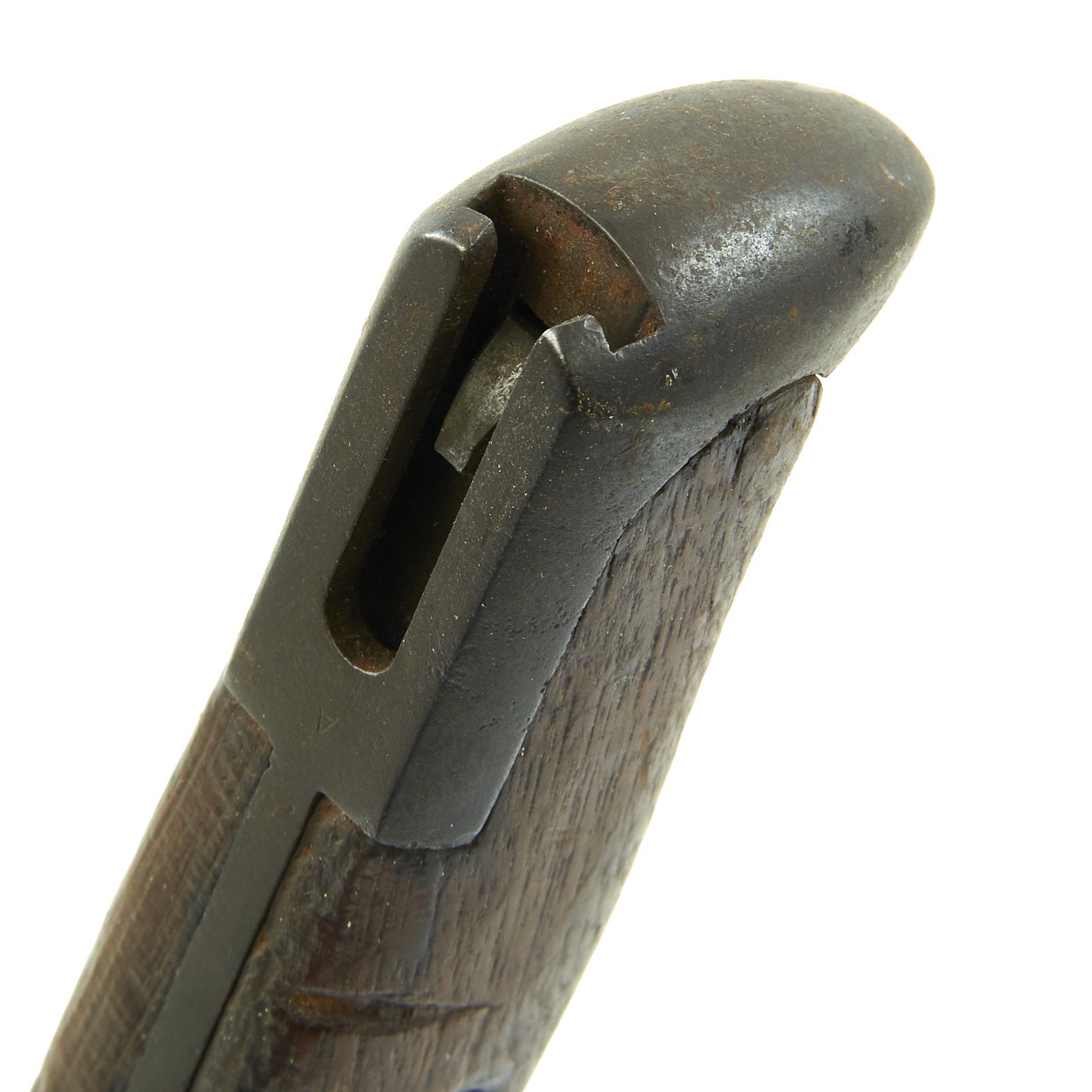 The blade ricasso is marked with SA for the Springfield Armory in Springfield Mass, the primary center for the manufacture of United States military firearms from 1777 until its closing in 1968. Below this is the Ordnance flaming bomb and date of manufacture 1906. The other side of the ricasso is marked with U.S. above serial number 146624. The blade is in very good condition, with a very nice blued finish, though there is wear to the finish and the edge has been sharpened after arsenal. The handle is a nice aged blue, while the cross guard has some surface rust. The original wooden grip scales are in good condition, with some of the original ribbed texture, though the left grip has some gouges carved into it.