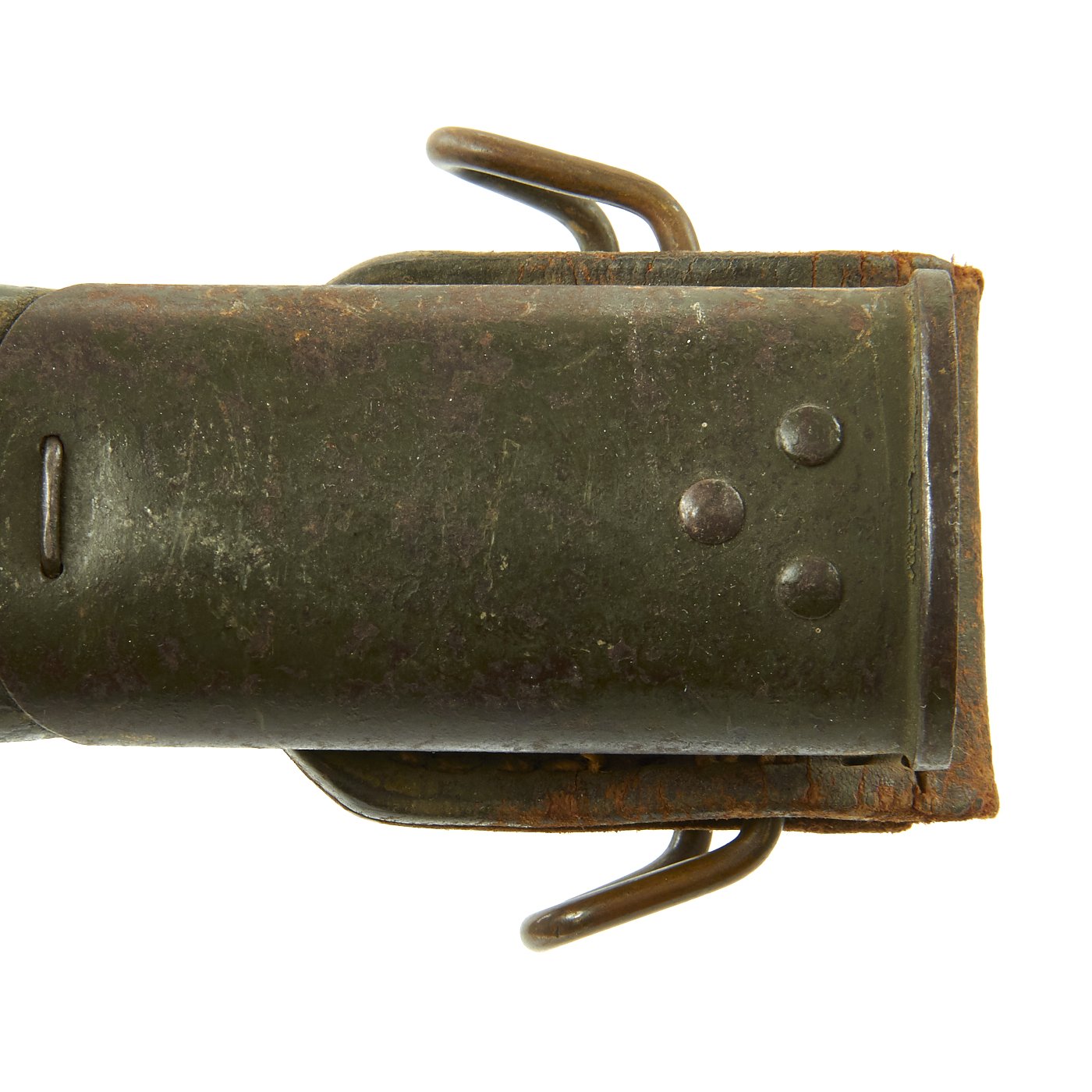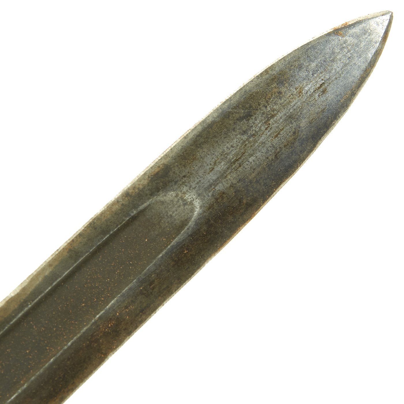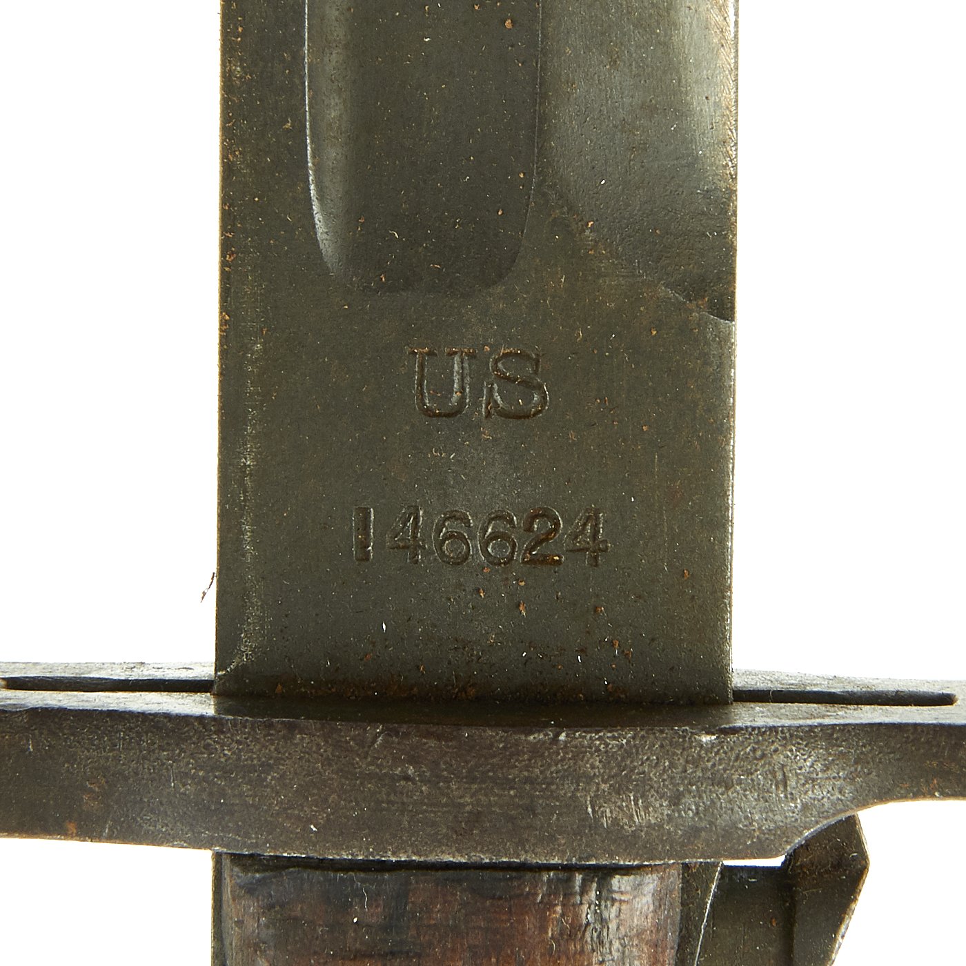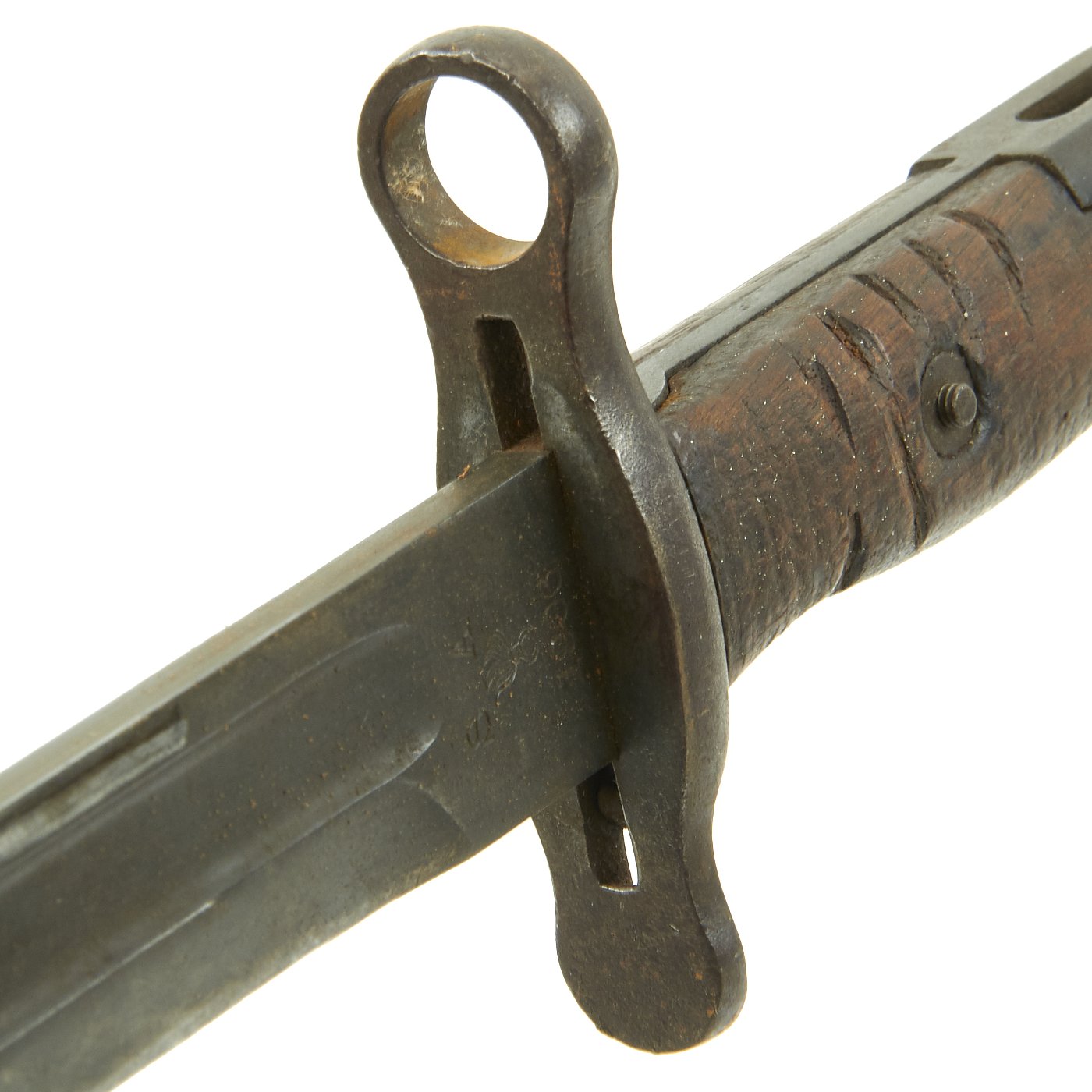 The bayonet itself dated 1906, being made during the pre-WWI period for the M1903 Springfield rifle. It is still in the original issued configuration, with the 16 inch blade, blued handle and cross guard, and wooden grip scales. The M1905 was originally designed with a bright steel blade, but upon U.S. entry into WWI in 1917, the specification was changed to a fully blued bayonet, and bright bayonets on hand such as this one were blued to match. Many of these were reissued for use in WWII, and were parkerized and even cut down, but this one was not.
