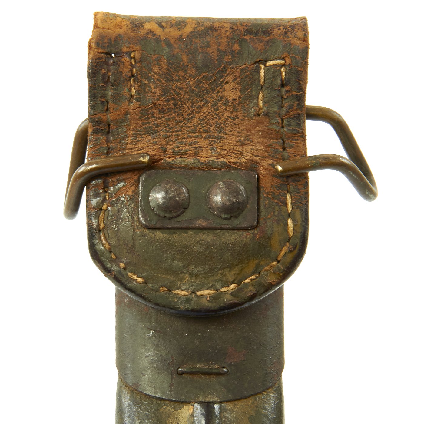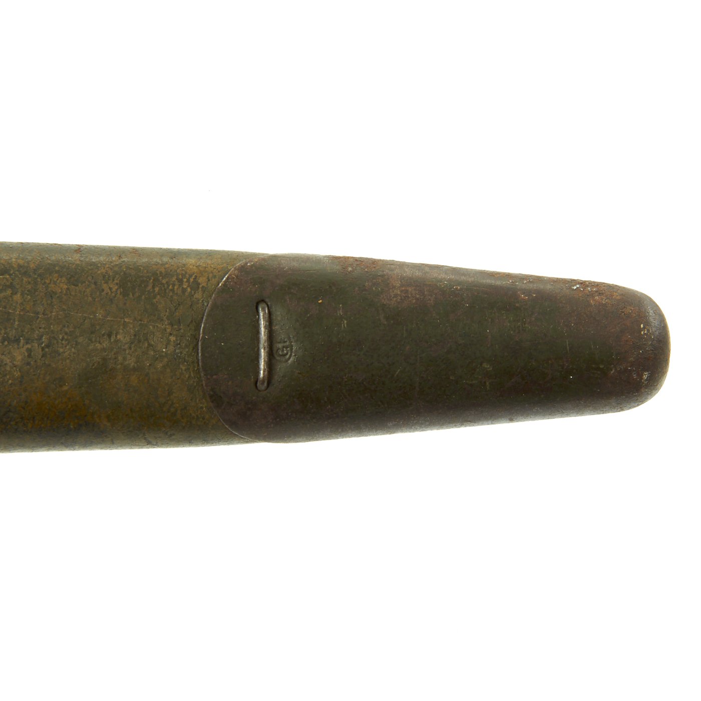 The scabbard is in very good condition as well, though there is definitely some wear to the paint. The leather "Frog" has had the stitching give way at the top, so the belt clip slides around somewhat. Unfortunately the maker and date on the frog can no longer be read, though there is GF in a circle on the bottom fitting.