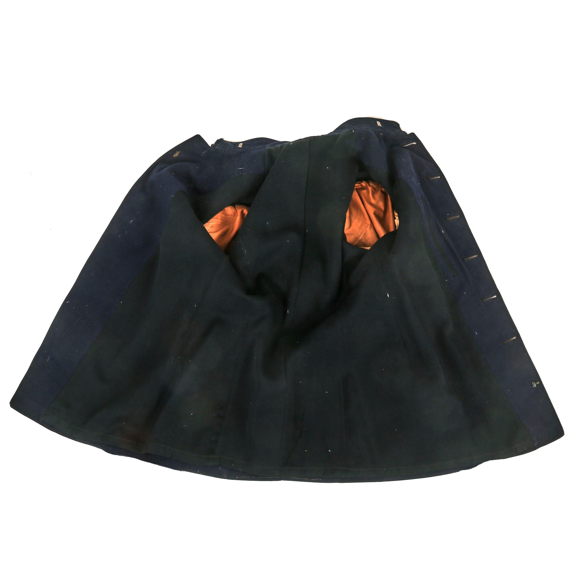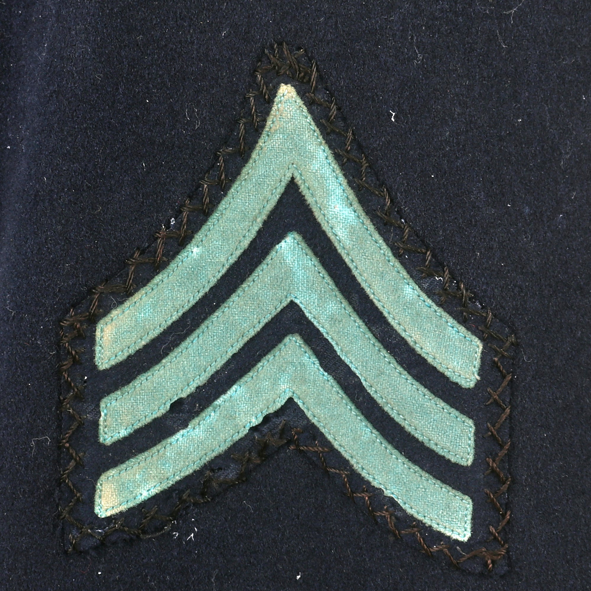 This is an excellent example of the 1902 Army Infantry Uniform with blue piping, a full set of blue aiguillette or cords, and two Sergeant rates cross-stitched onto each sleeve. The aiguillette is in rough shape with the attachment loop having broken off, so it is loose on the uniform. The collar is great but has no insignia. The jacket also bears a Service stripe on both sleeves, which to our knowledge denoted 4 years of prior service. All buttons are retained and there is little damage across the uniform outside of scattered mothing.
