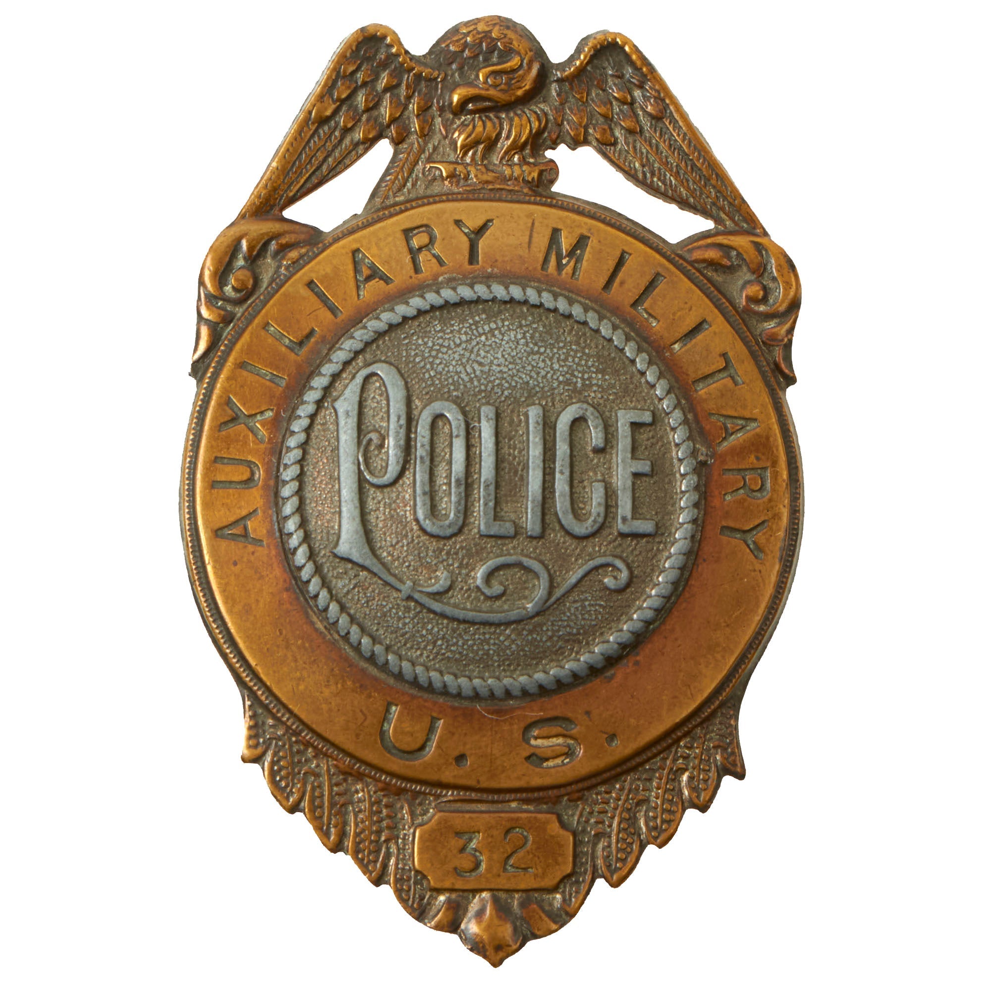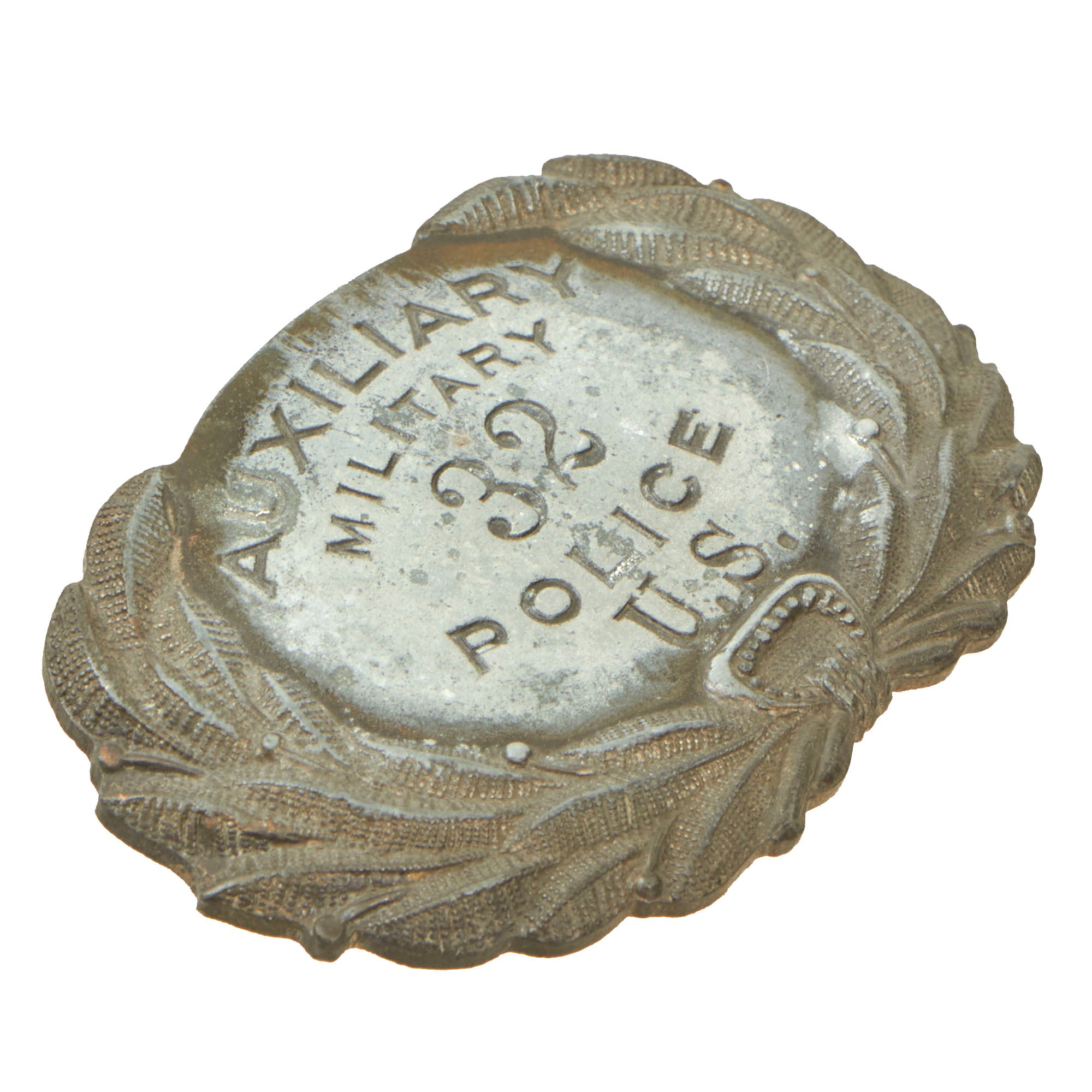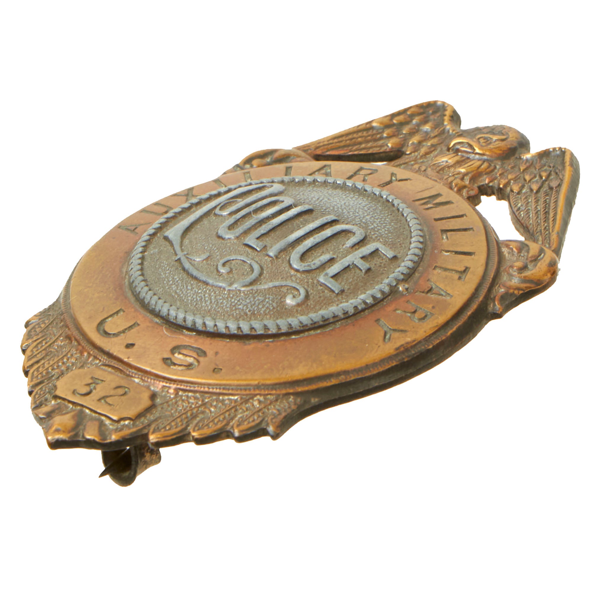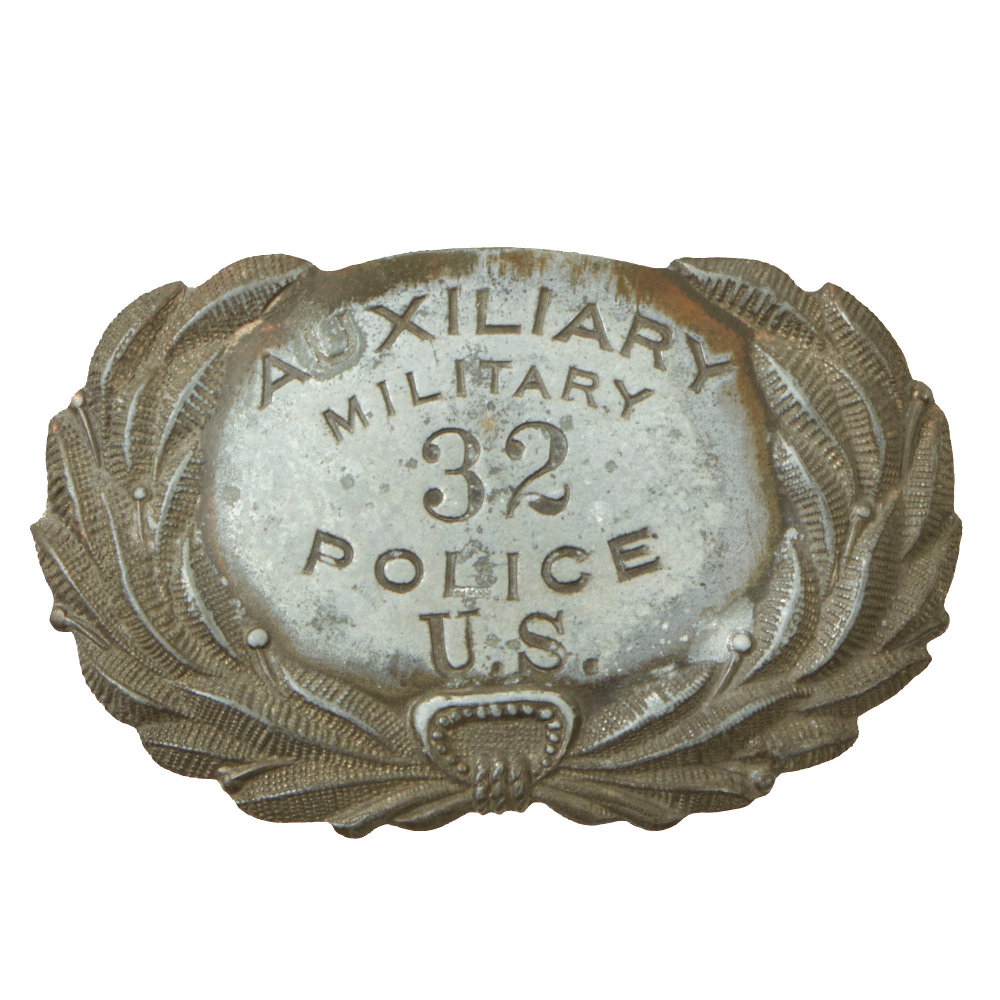 Original Items. One-of-a-Kind. This is an extremely scarce set of insignia for Auxiliary Military Police dating pre-World War I, likely the 1890s or 1900s. Anything Military Police before World War I is extremely scarce to find, making this matching set extremely rare. Note that both the badge and cap insignia have the number 32.