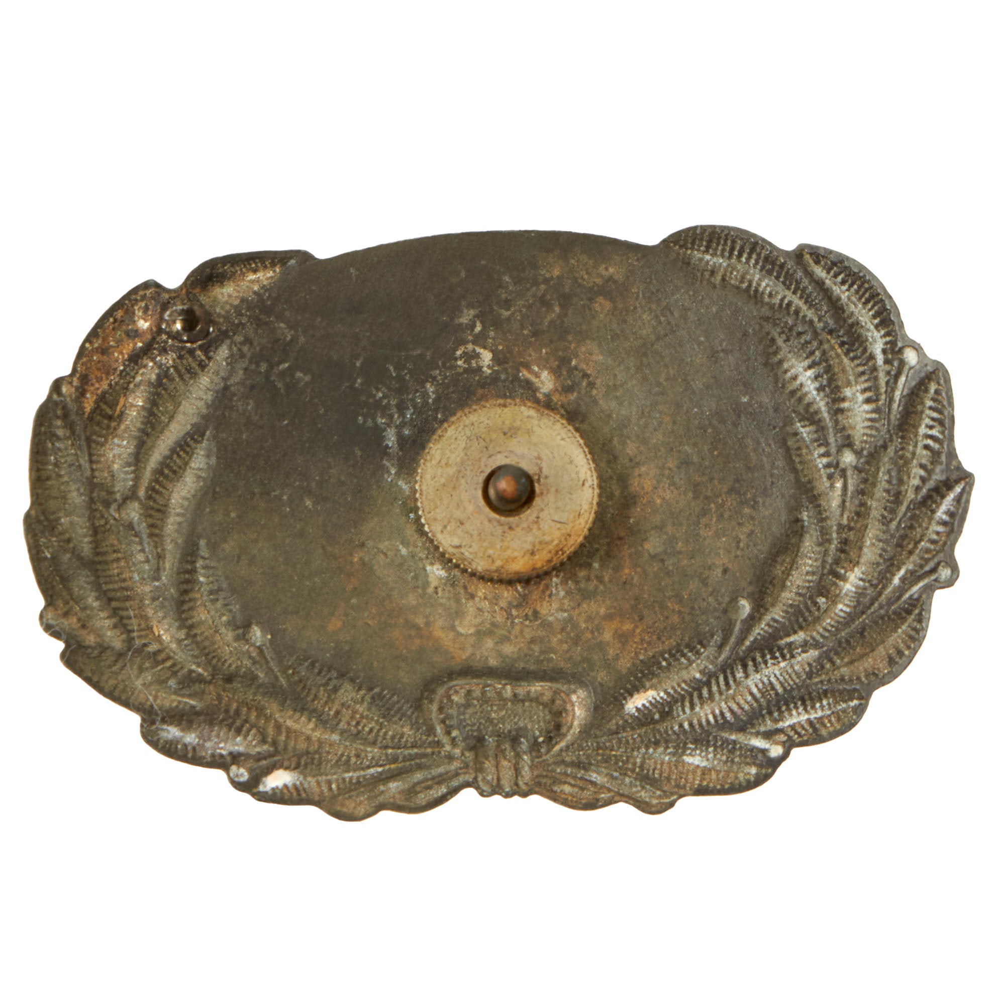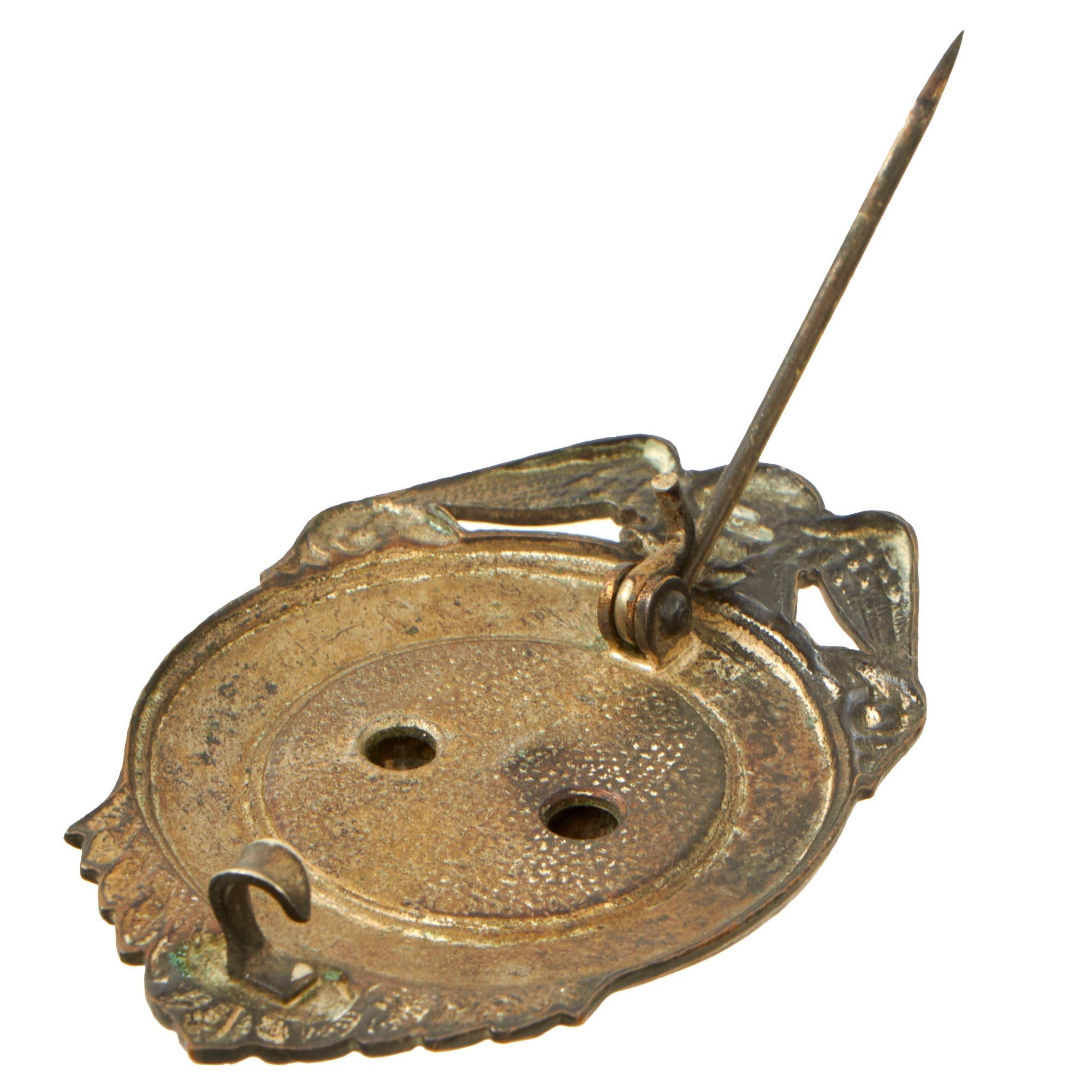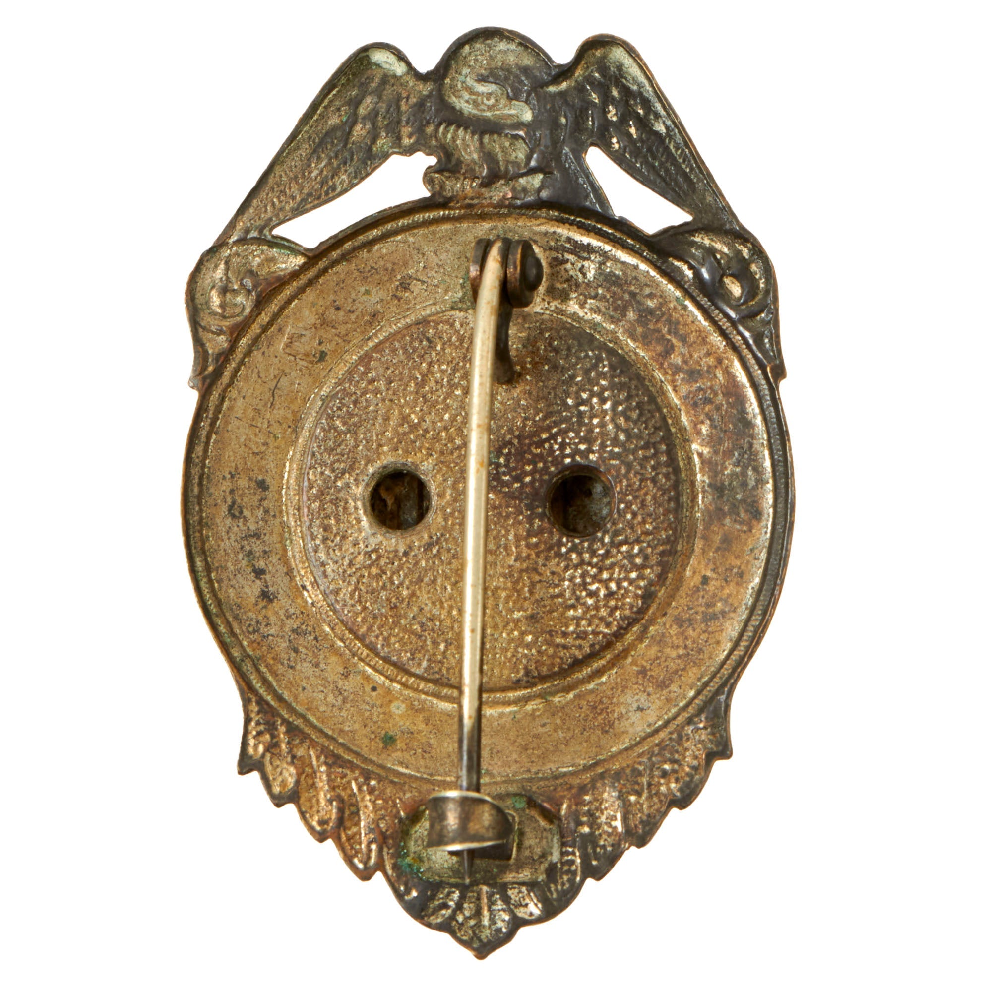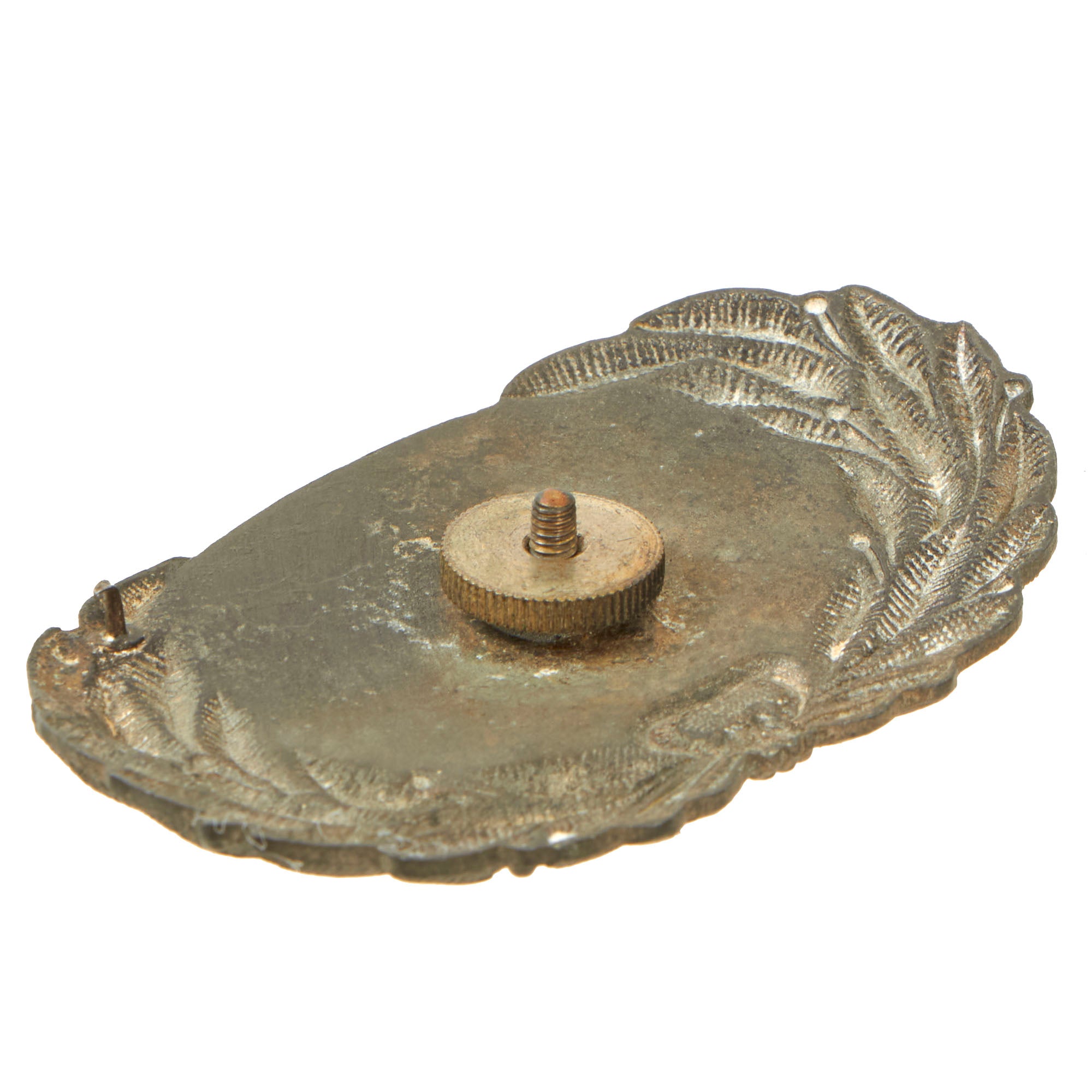 This example is a screwback and retains its original washer. It has a pin on the back to better affix itself to the cap. It measures 2⅝ x 1⅝”. With enough research, these could possibly be identified to an area.