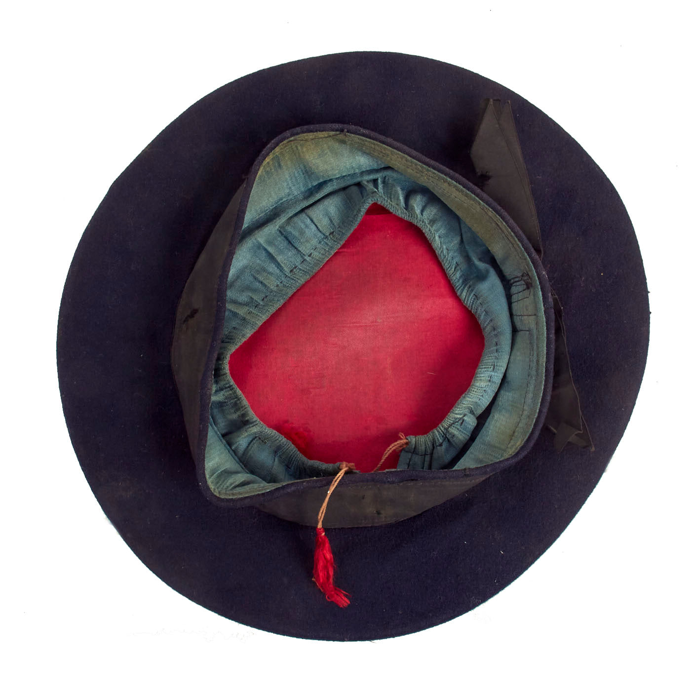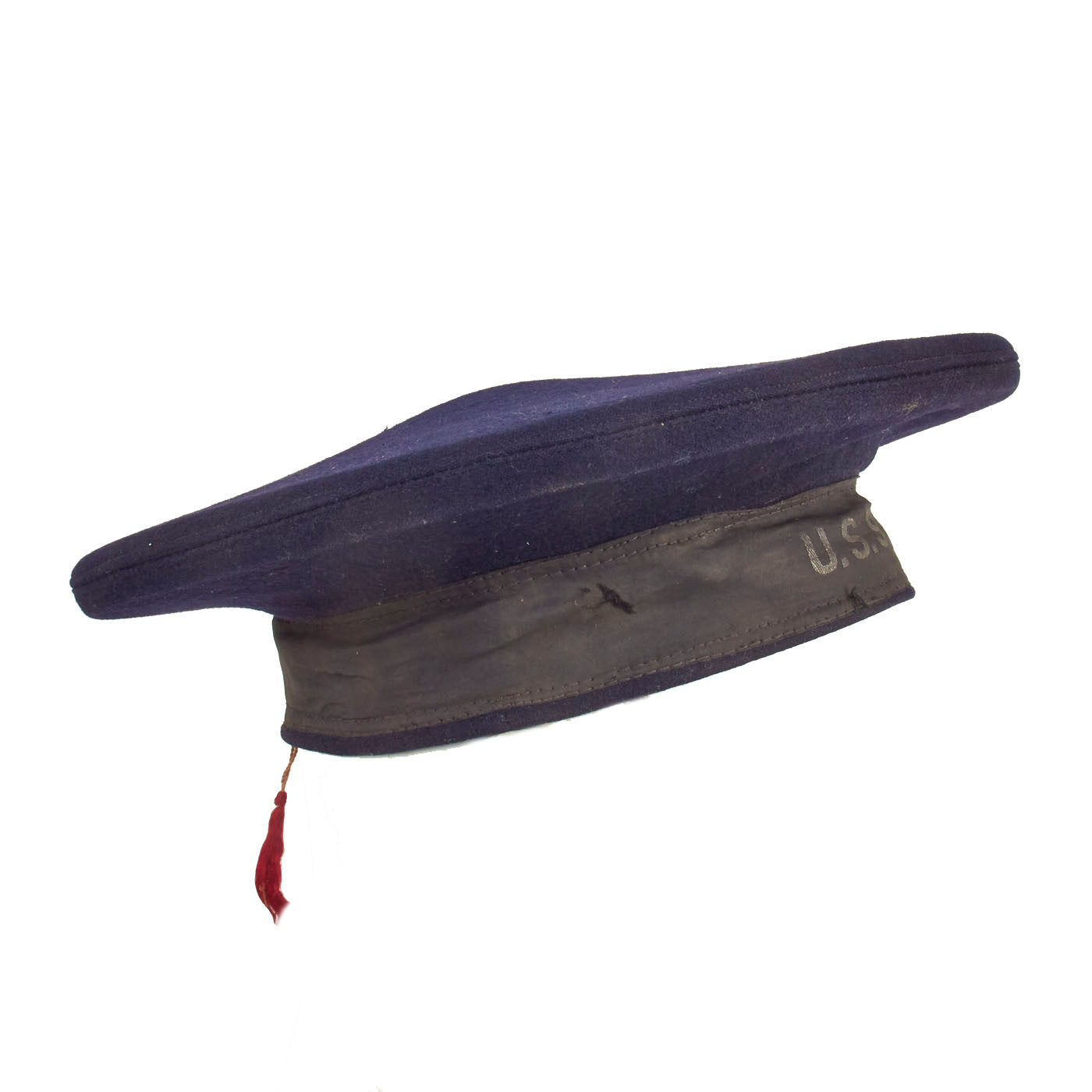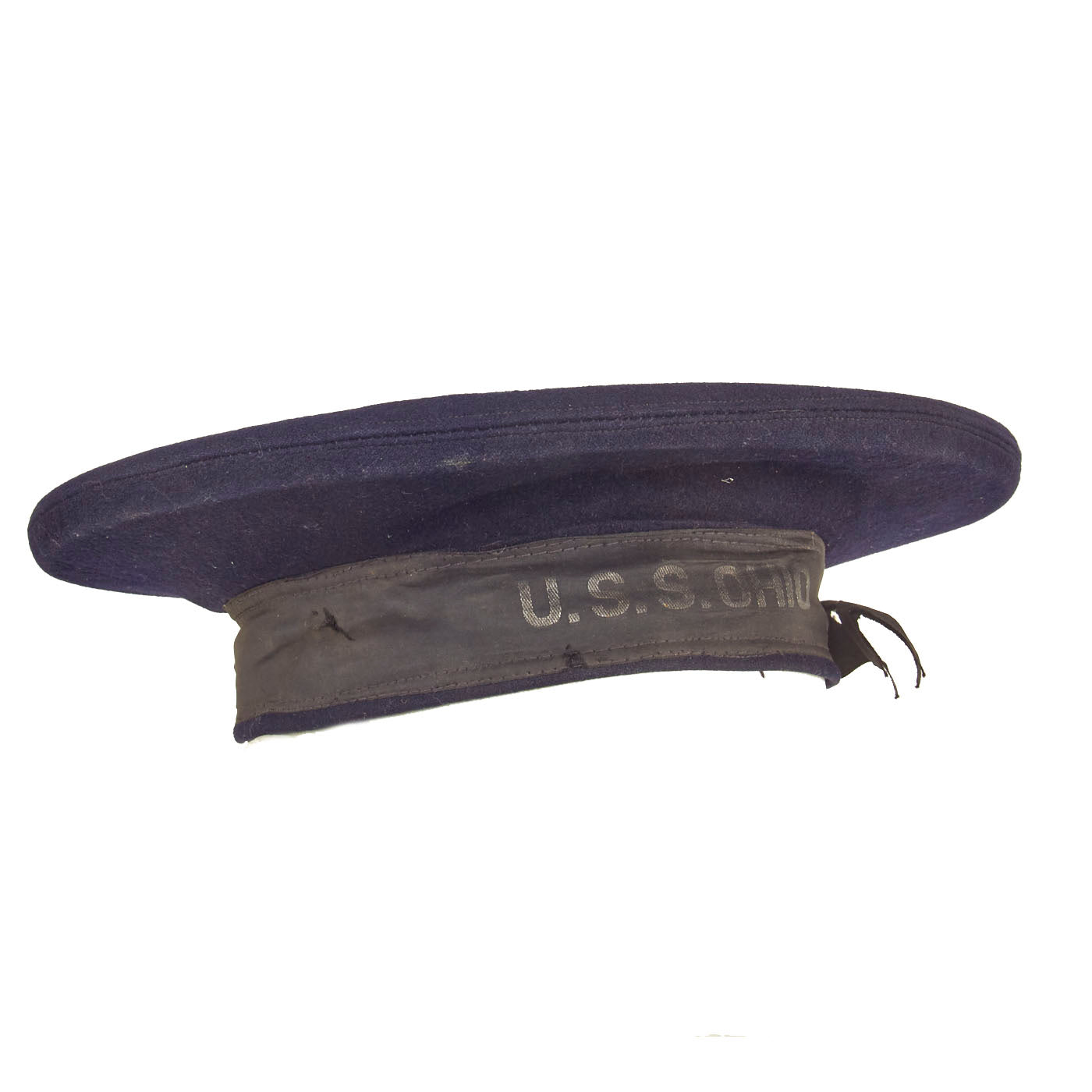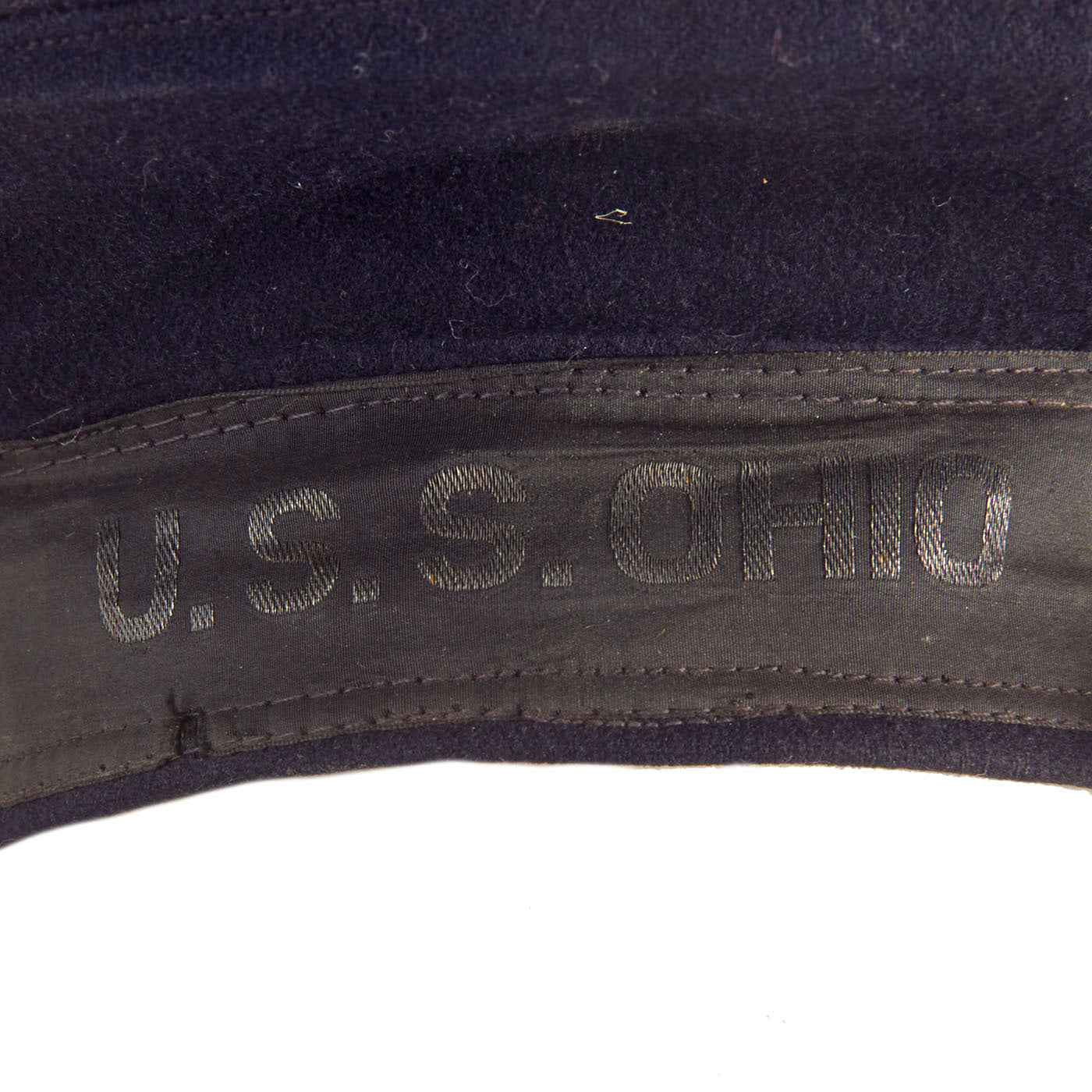 This flat hat is in lovely condition and features a tally that bears the name of the ship, the U.S.S. Ohio. The once gold lettering is now darkened to a lovely gray patina but is still easily recognizable.