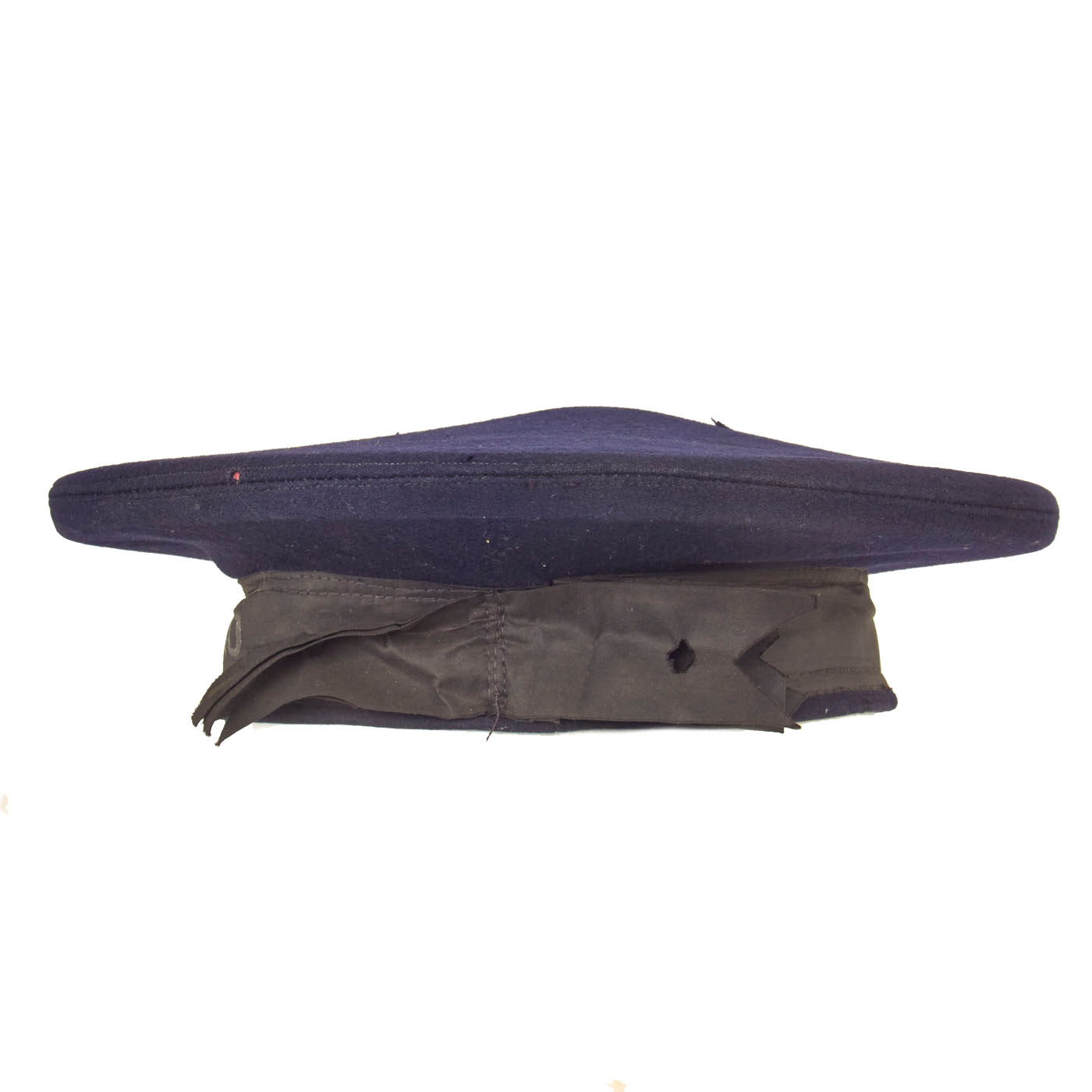 There is wear present on the cap, but nothing too extensive or damaging. The crown stiffener is still solid and has not worn through the heavy blue wool. The lining is still intact and even still has the crown adjustment string on the “skull cap” of the liner.
