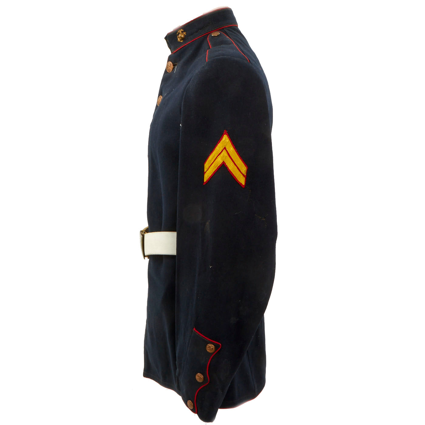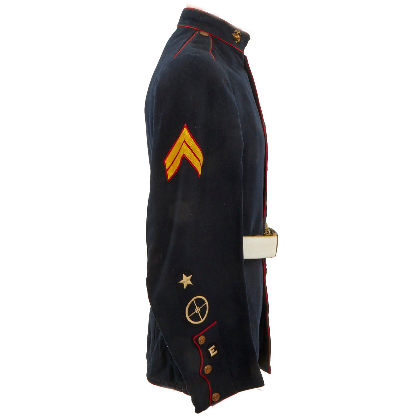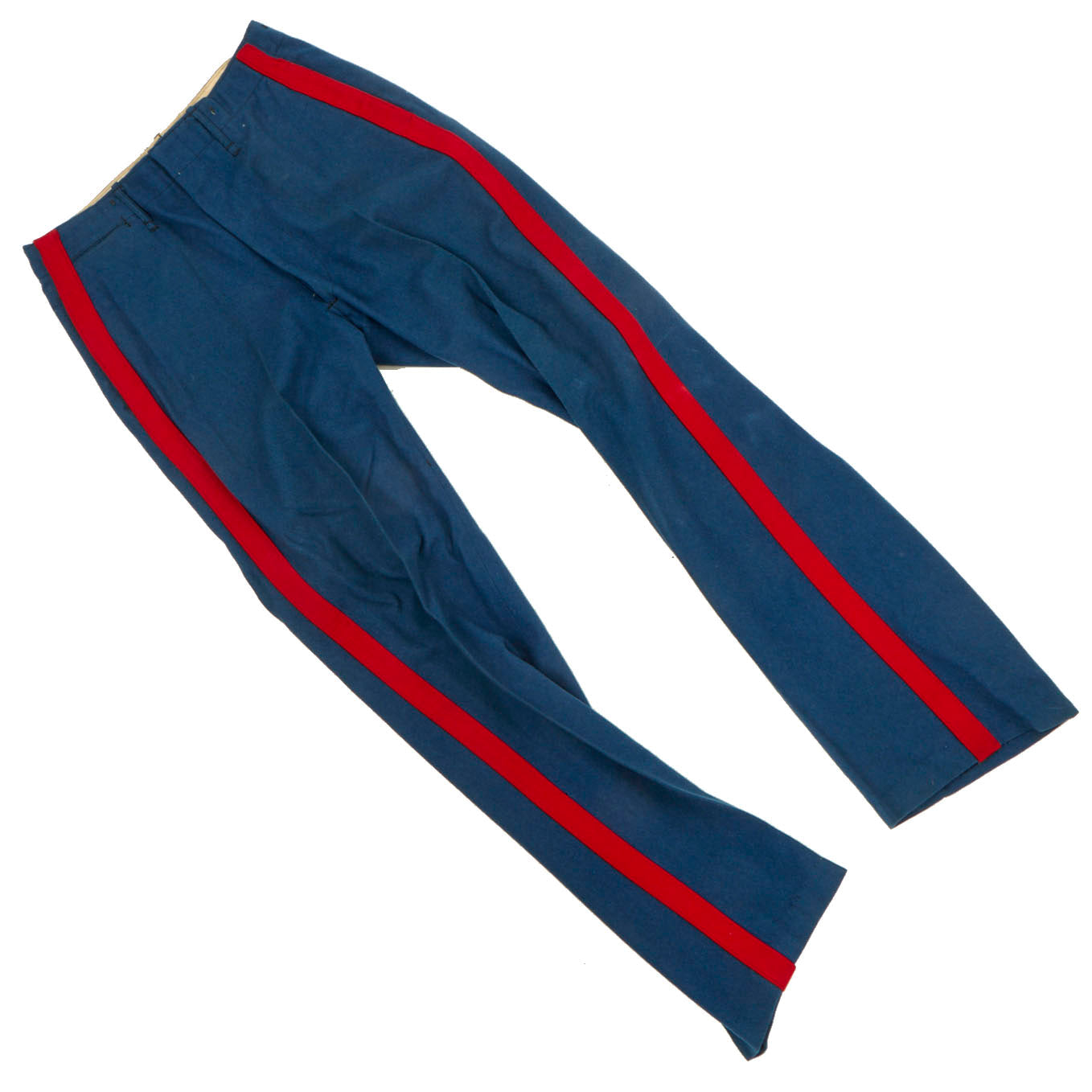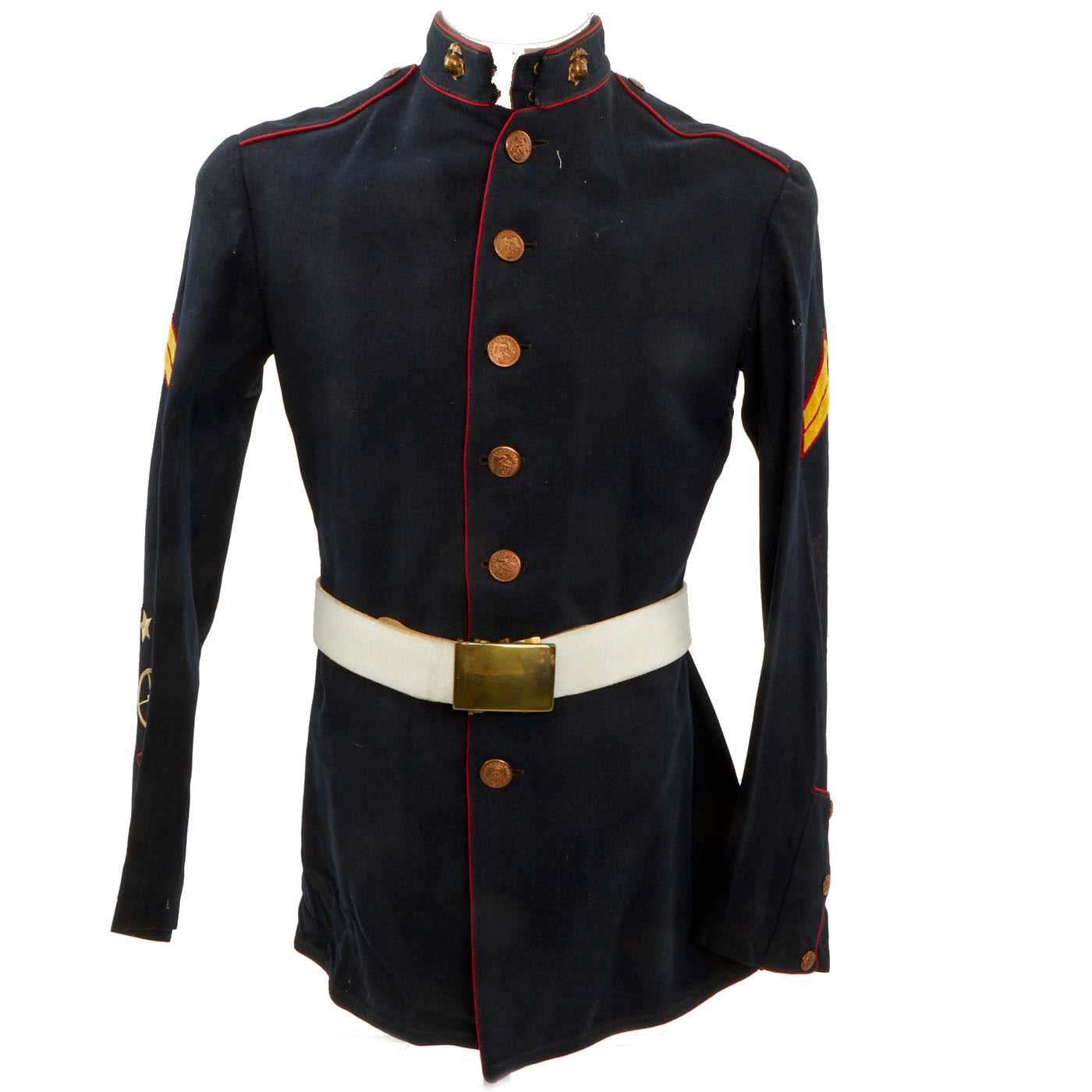 The uniform is complete, but does show its age. There appears to be an early repair done to the cuff style collar, with the stitching done by hand next to the left EGA device. All buttons and devices have a lovely darkened patina to them. The white belt is faded and stained, but still very white in appearance, with a tarnished brass buckle. The trousers feature a blood stripe which is correct for Marine NCOs and still retains a depot stamp and name on the inside waistline.