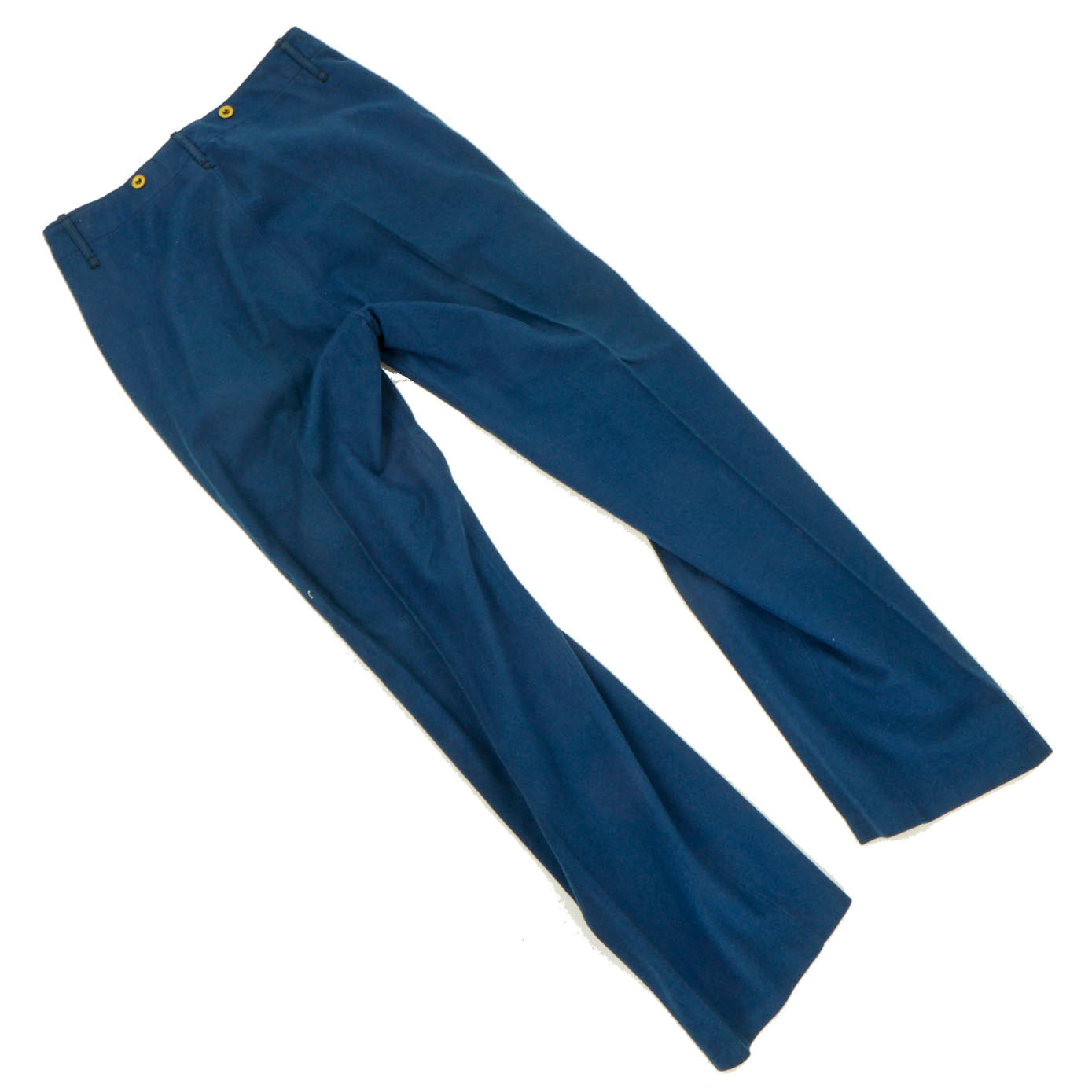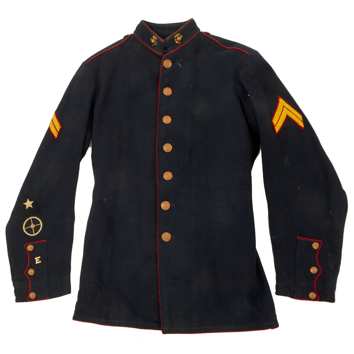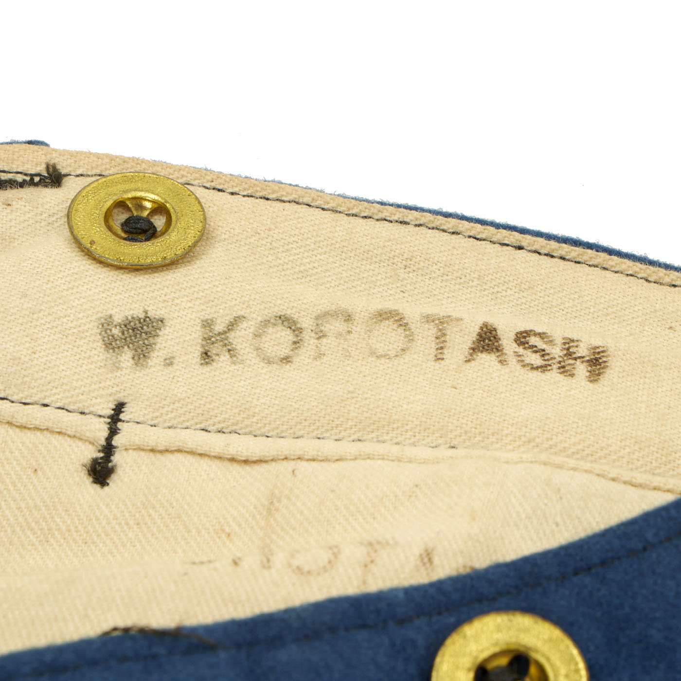 The uniform is complete, but does show its age. There appears to be an early repair done to the cuff style collar, with the stitching done by hand next to the left EGA device. All buttons and devices have a lovely darkened patina to them. The white belt is faded and stained, but still very white in appearance, with a tarnished brass buckle. The trousers feature a blood stripe which is correct for Marine NCOs and still retains a depot stamp and name on the inside waistline.