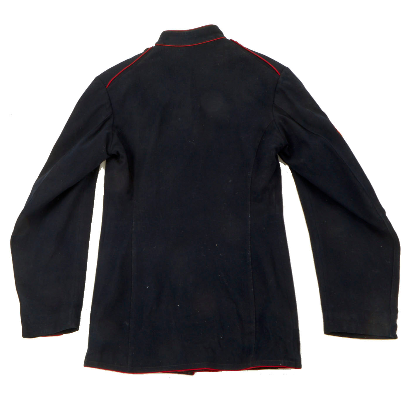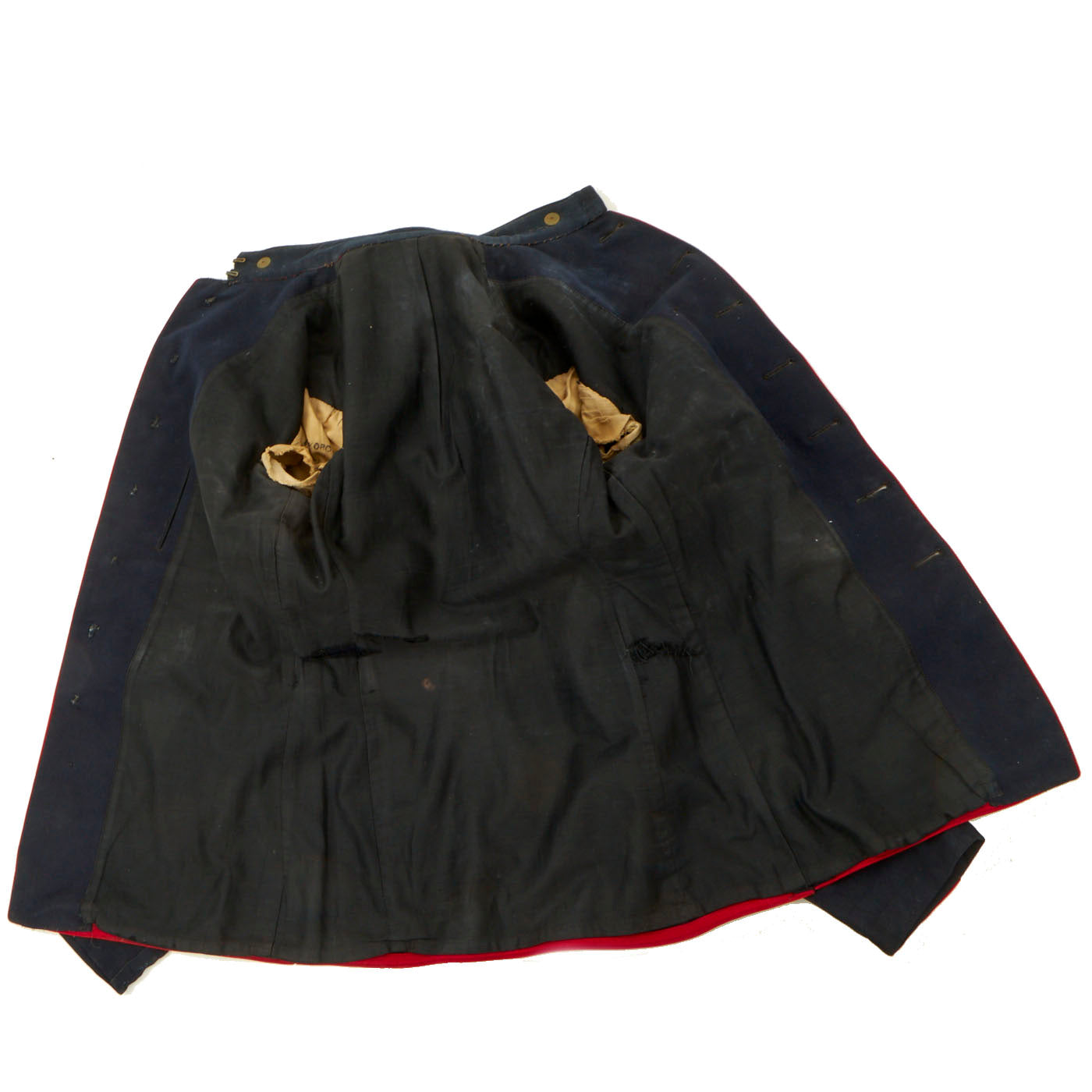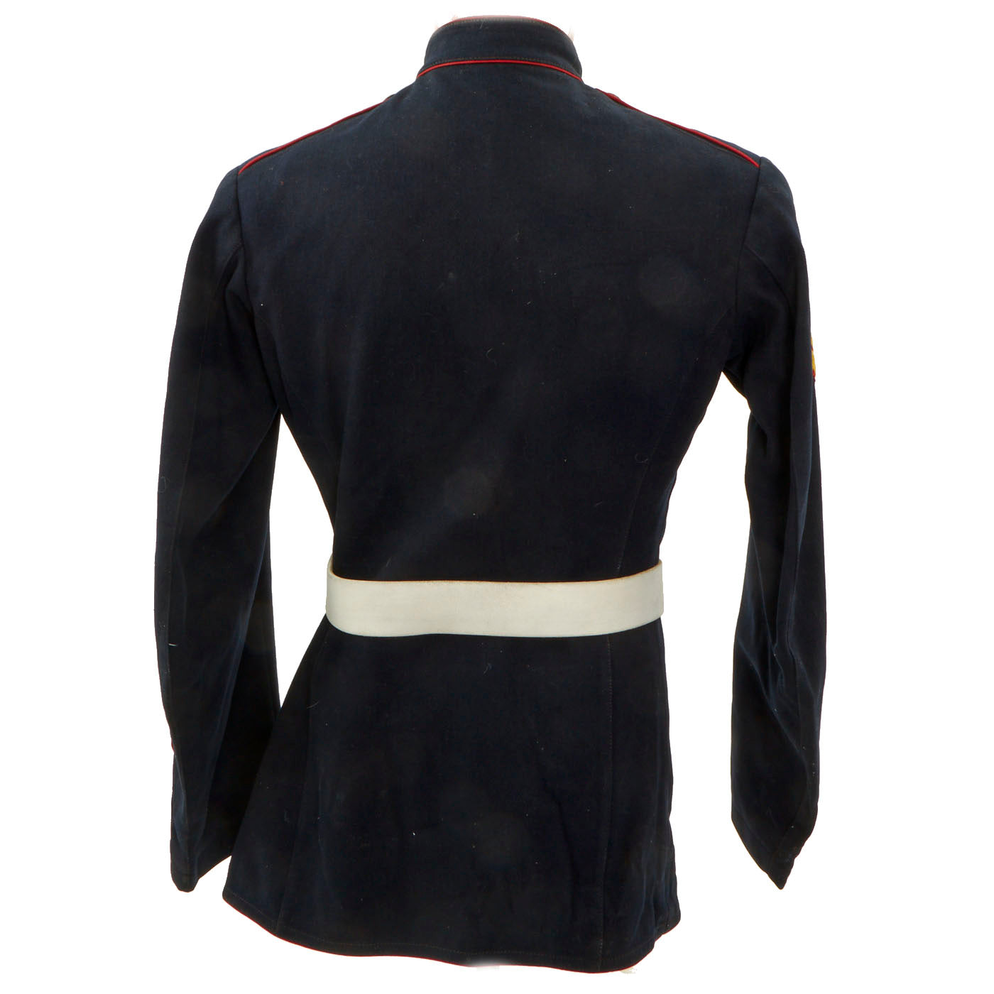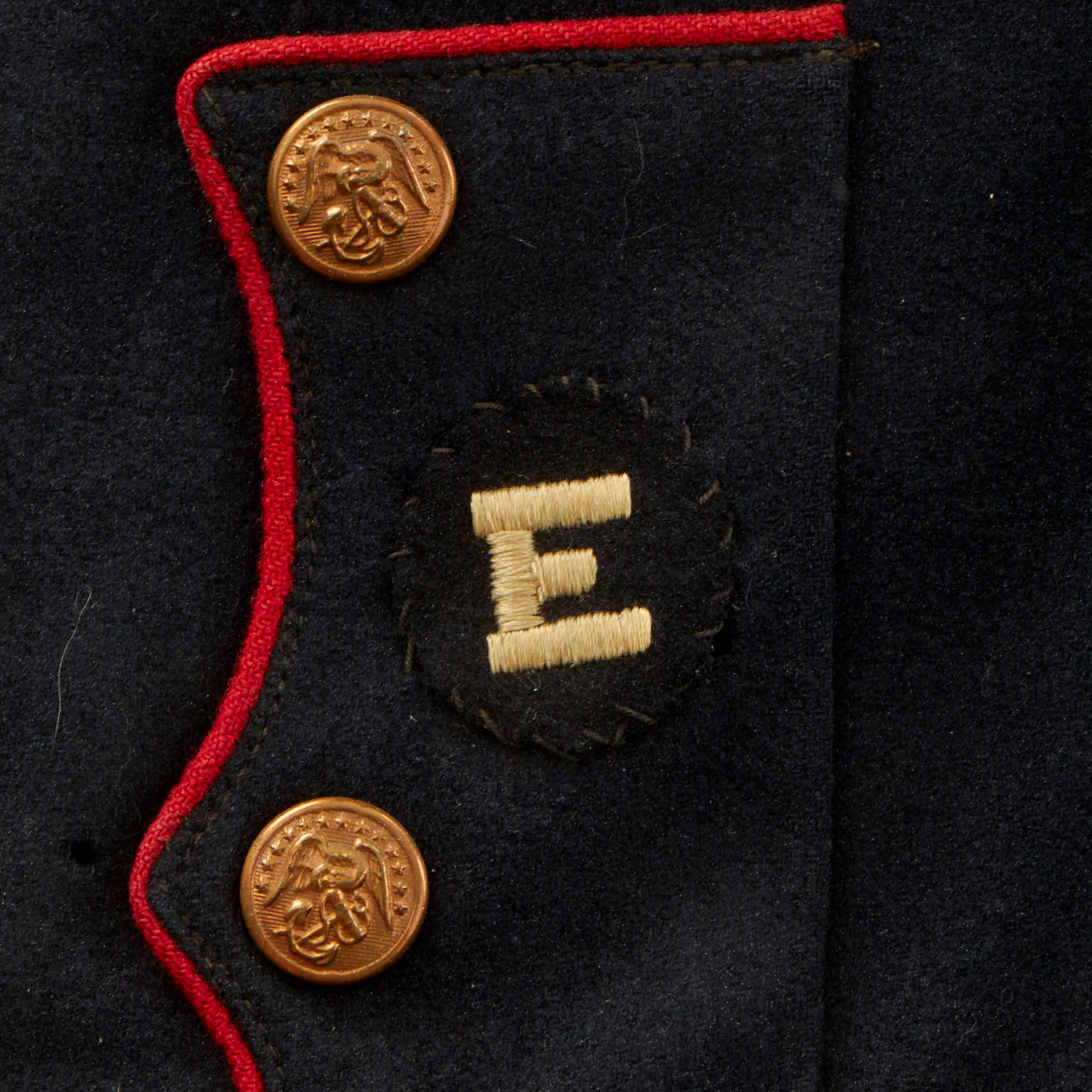 The uniform is complete, but does show its age. There appears to be an early repair done to the cuff style collar, with the stitching done by hand next to the left EGA device. All buttons and devices have a lovely darkened patina to them. The white belt is faded and stained, but still very white in appearance, with a tarnished brass buckle. The trousers feature a blood stripe which is correct for Marine NCOs and still retains a depot stamp and name on the inside waistline.