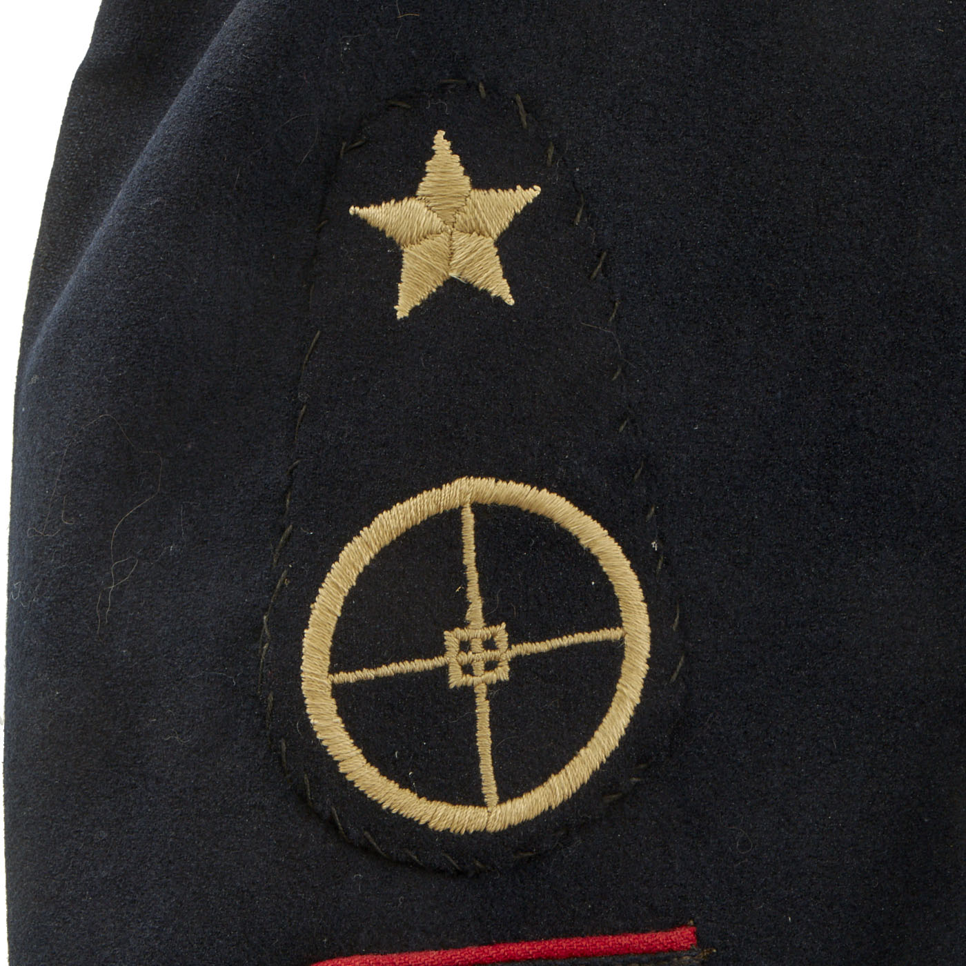 The right sleeve patch indicates that this Marine, while serving aboard the Ship’s Detachment, trained on and was qualified for operating the larger deck guns on the vessel. The patch indicates that he was a “Gun Pointer 1st Class”. Between 1915 and 1929 and early WWII, the Marine Corps authorized the wearing of eight Navy distinguishing marks or specialty marks by qualified Marines, this example was one of them.