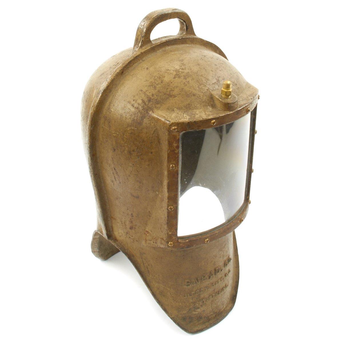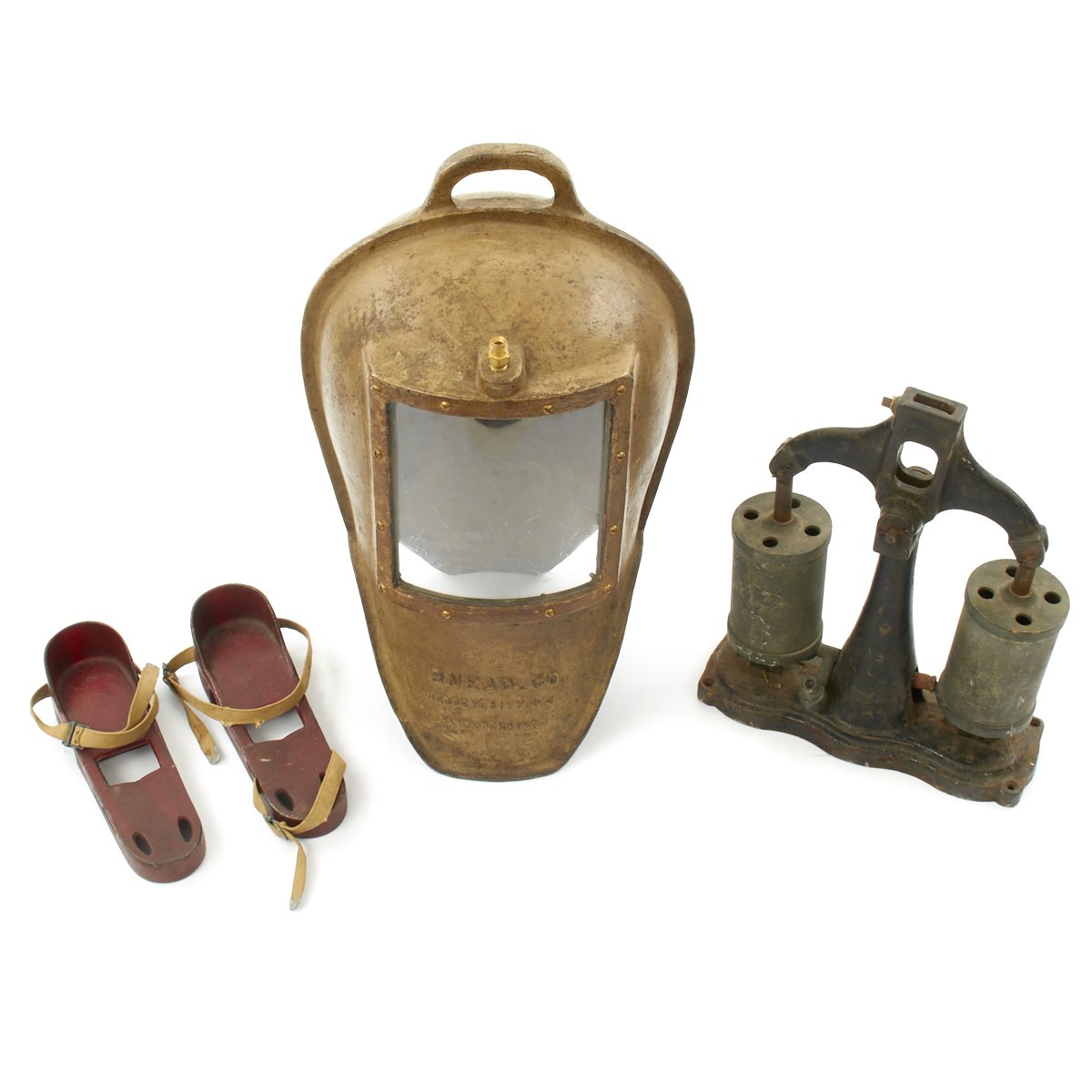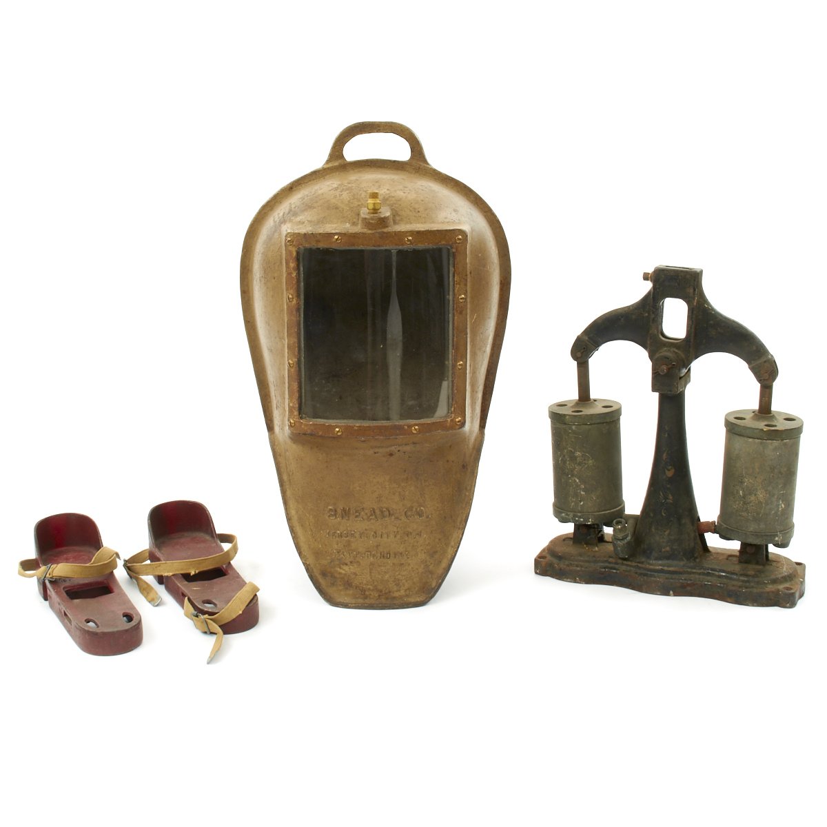 Original Items. One Set Only. Under water exploration has long been one of man's greatest dreams and around the 1920's the SNEAD IRONWORKS COMPANY of Jersey City decided to enter this New World. Pearl divers have been around for many hundreds of years but sustained underwater diving whilst actually breathing was almost a pipe dream. Hard Hat diving was so complicated and hazardous but SNEAD came out with a simpler way using what is best described as a "Diving Bell" method. The apparatus was first offered in their 1933 Catalog, and a set consisted of an Iron helmet, a hand operated bellows for pumping air down to the diver and a pair of heavy tie on iron under shoes to help combat the body's natural bouyancy.