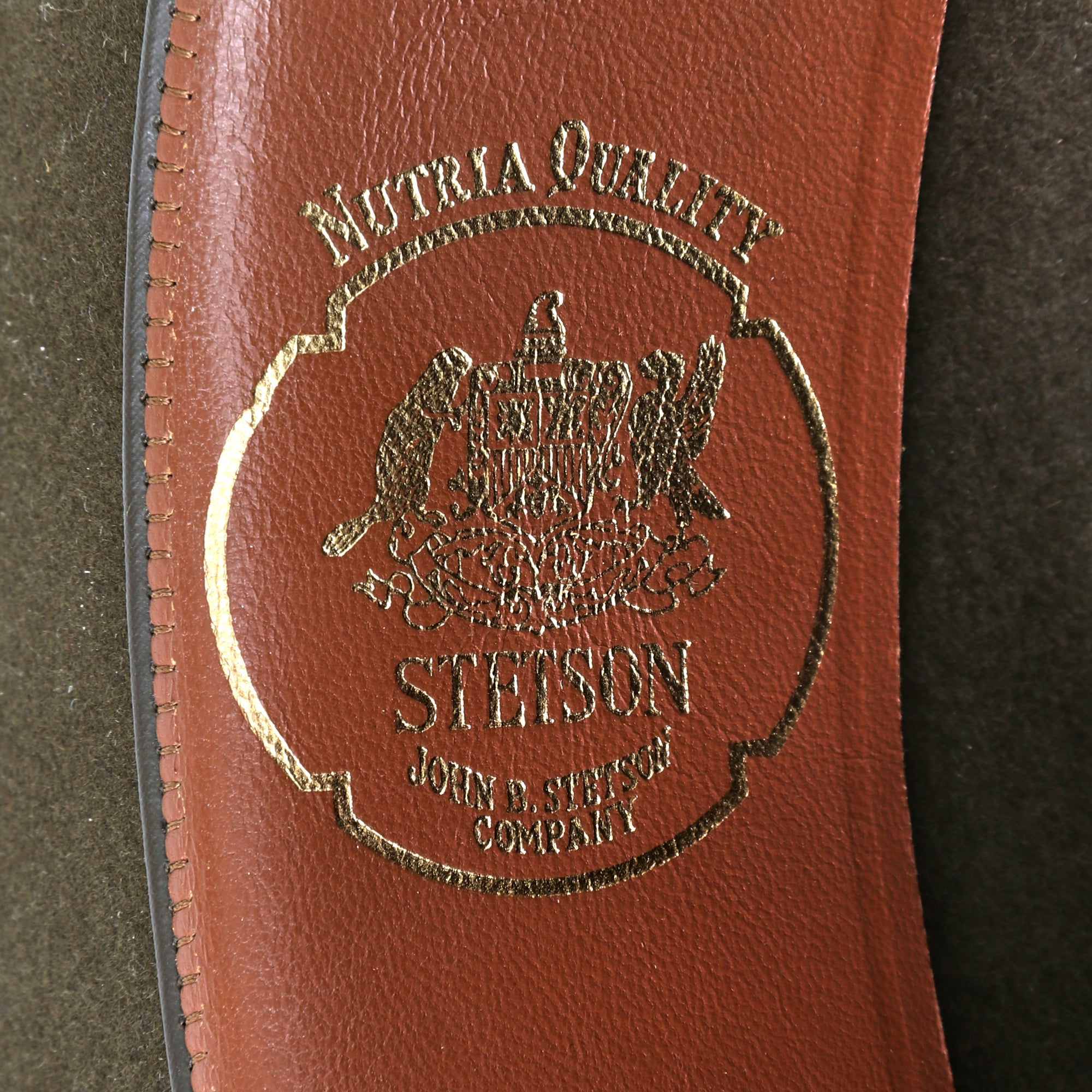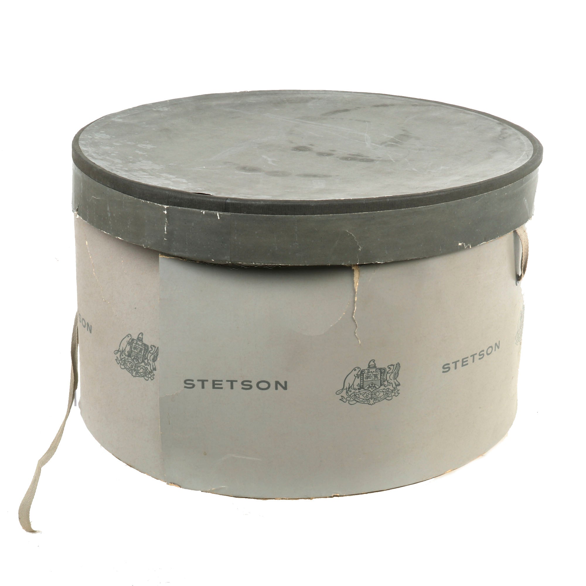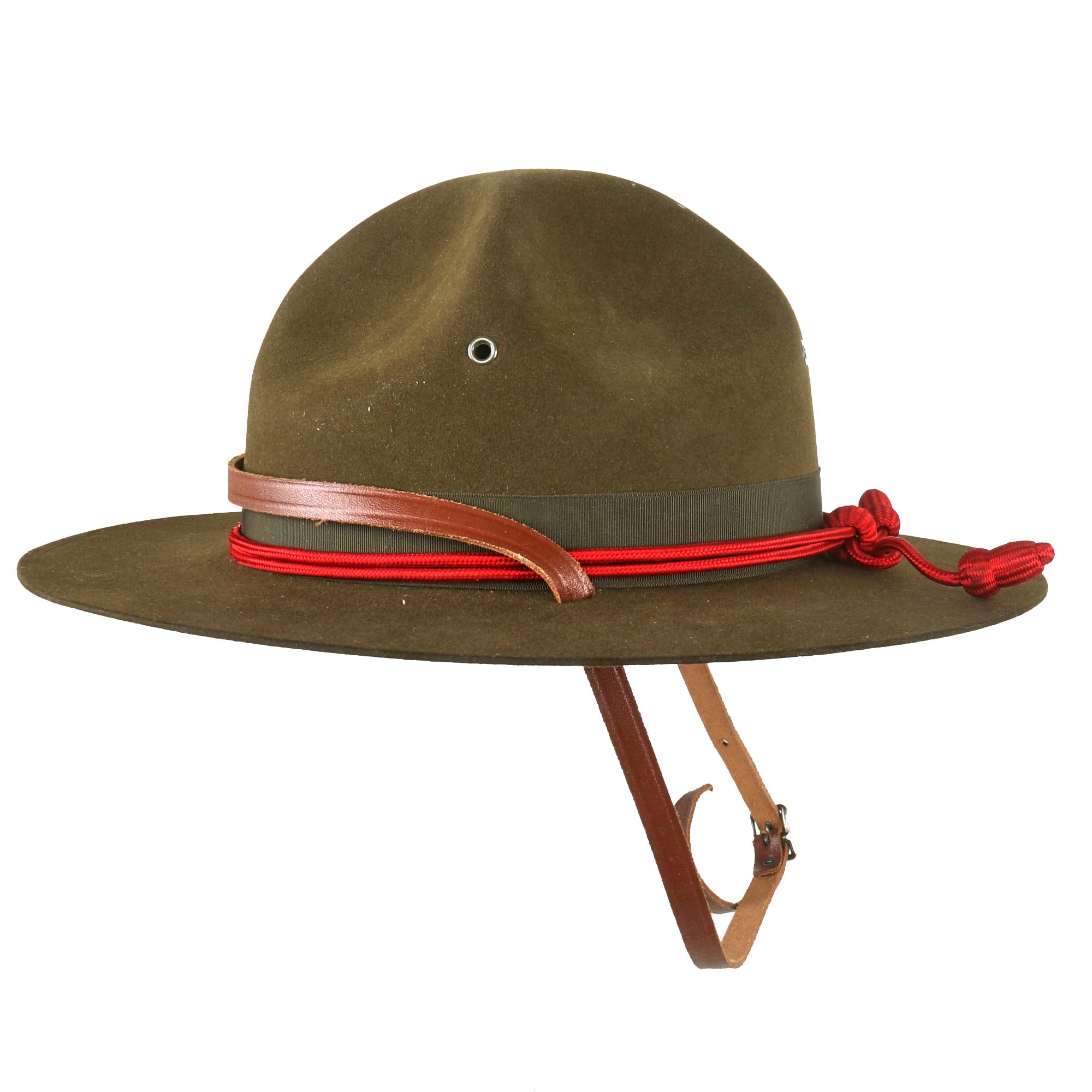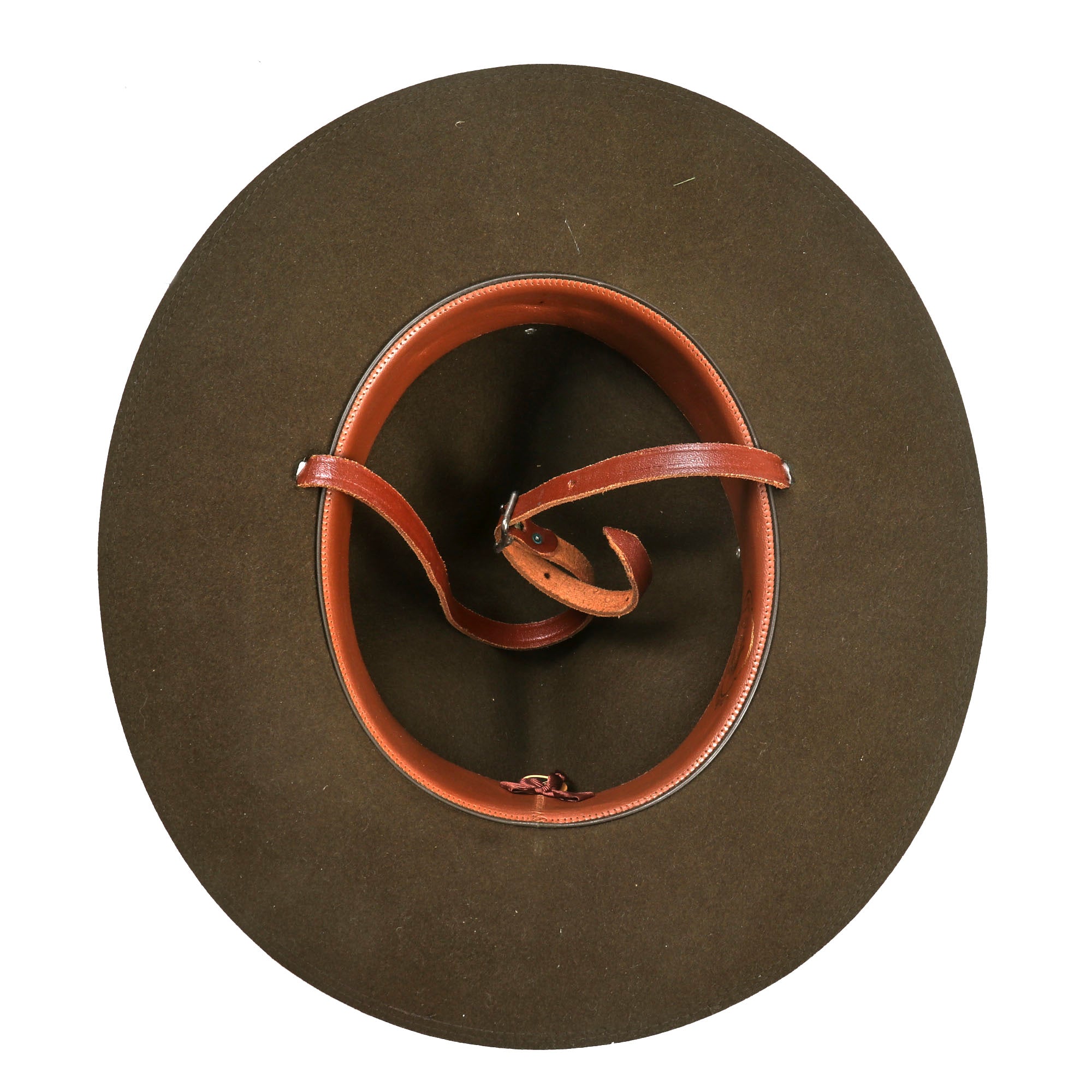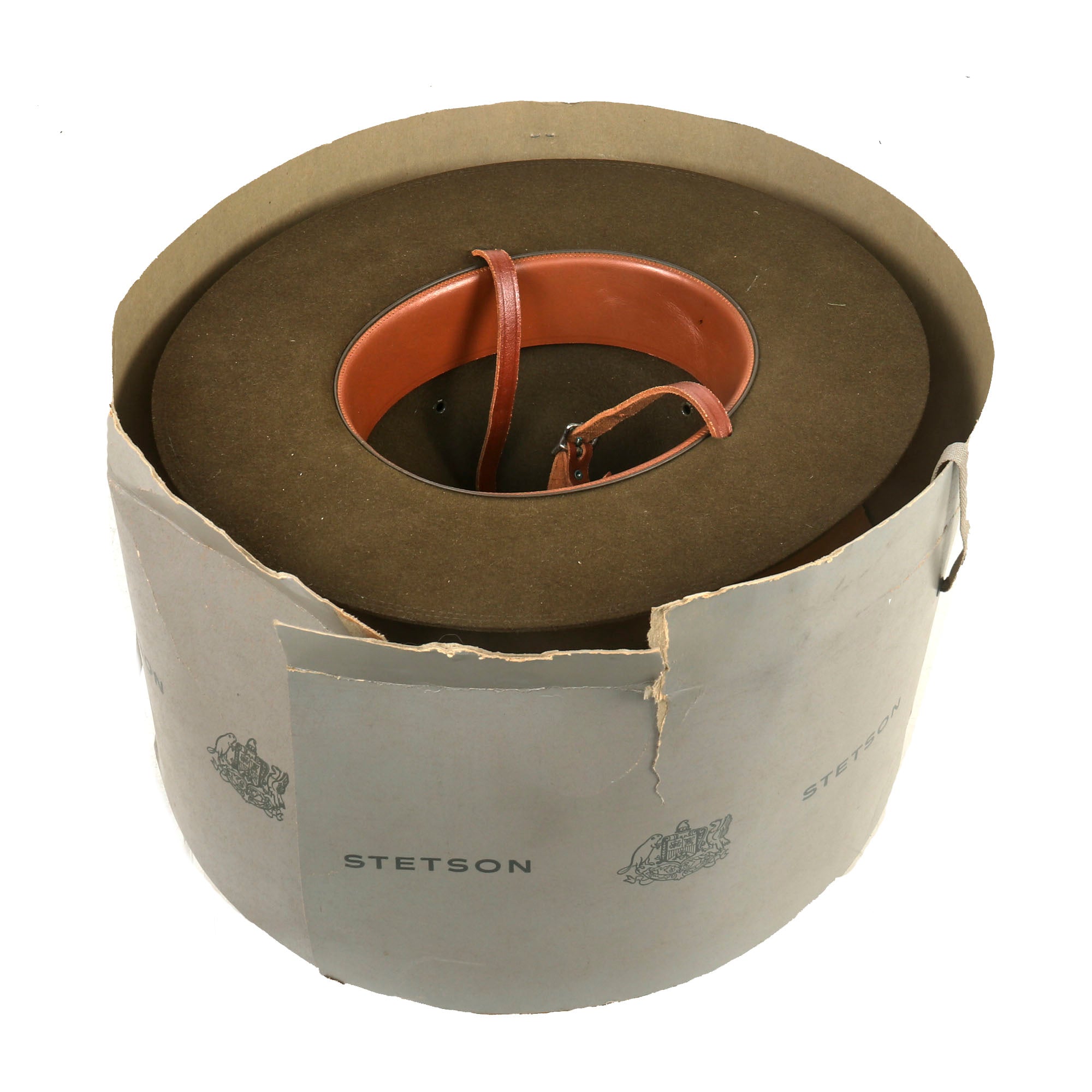 The Campaign Hat is in very good condition considering its age. The leather sweatband is embossed in gold with the "Shield" logo and name of the maker, the JOHN B. STETSON COMPANY of Philadelphia. There is even the original maker inspection tag inside! The sweatband stitching is loose on one side, which could easily be repaired if one so desired. The Leather Chinstrap is complete. Accompanying the Hat is the original box, which bears the Company name and logo around its circumference. Size is approximately 7⅝.