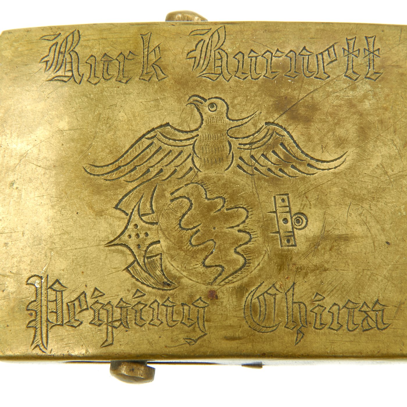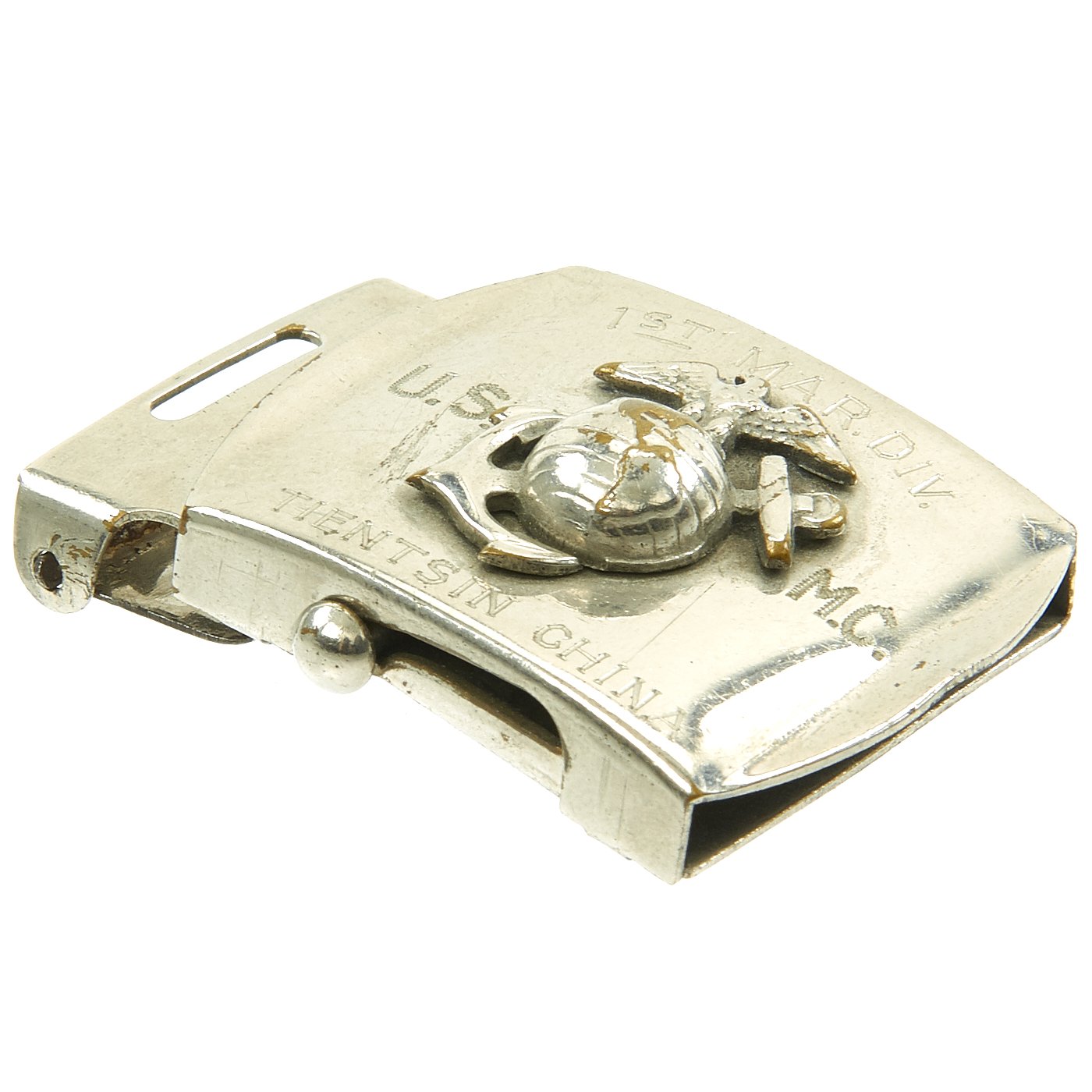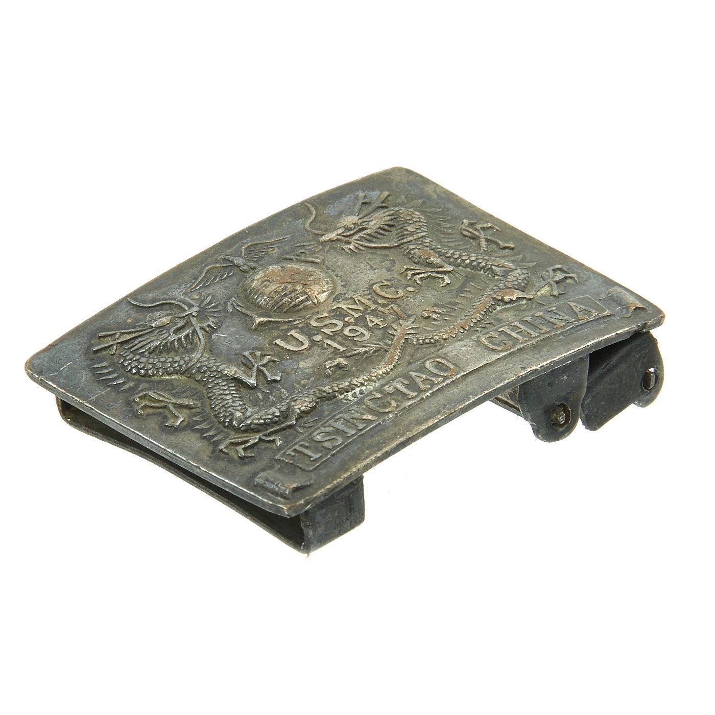 - Silver Belt buckle in high relief with Chinese Dragoons and EGA and U.S.M.C 1947 TSINGTAO CHINA