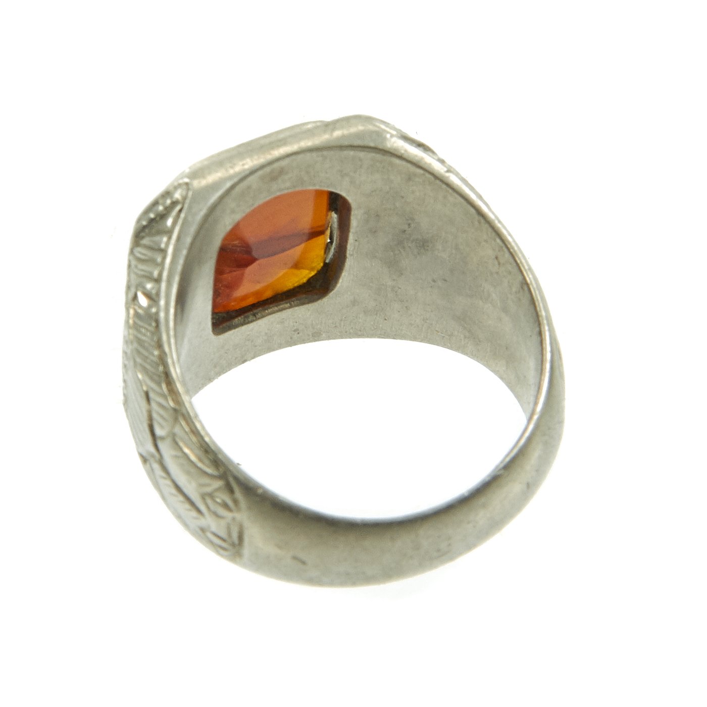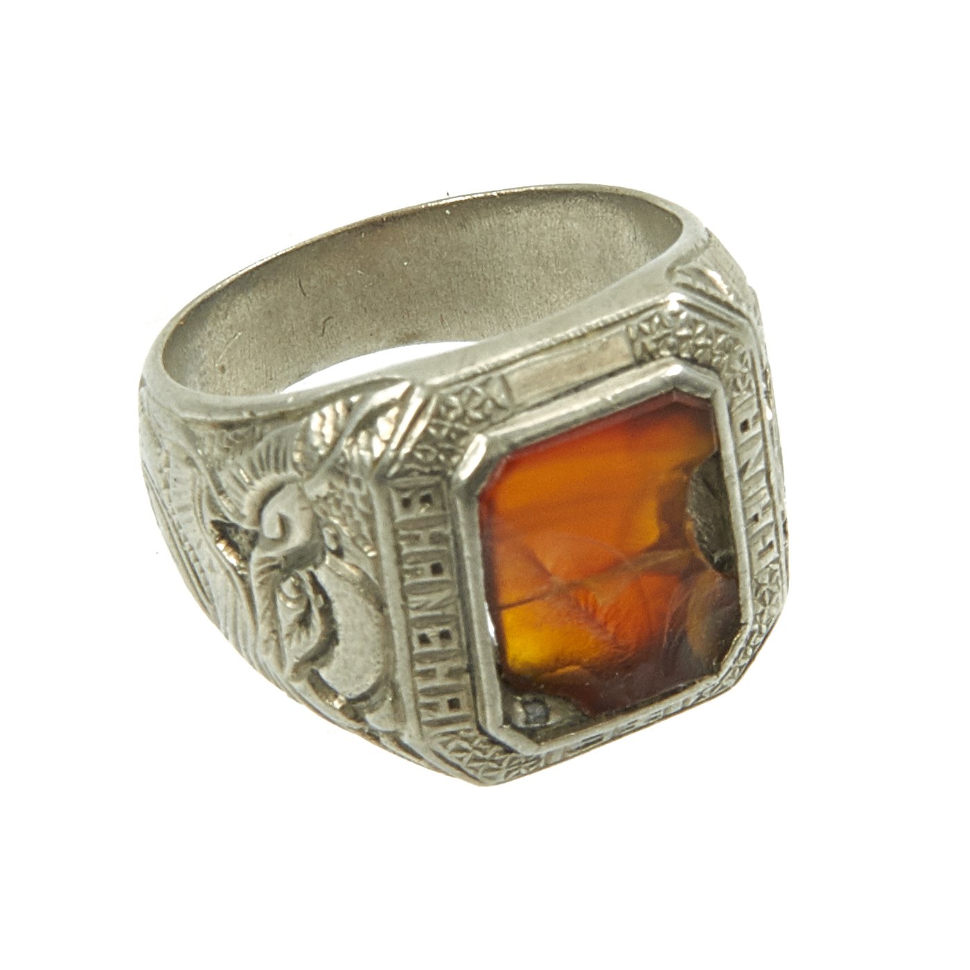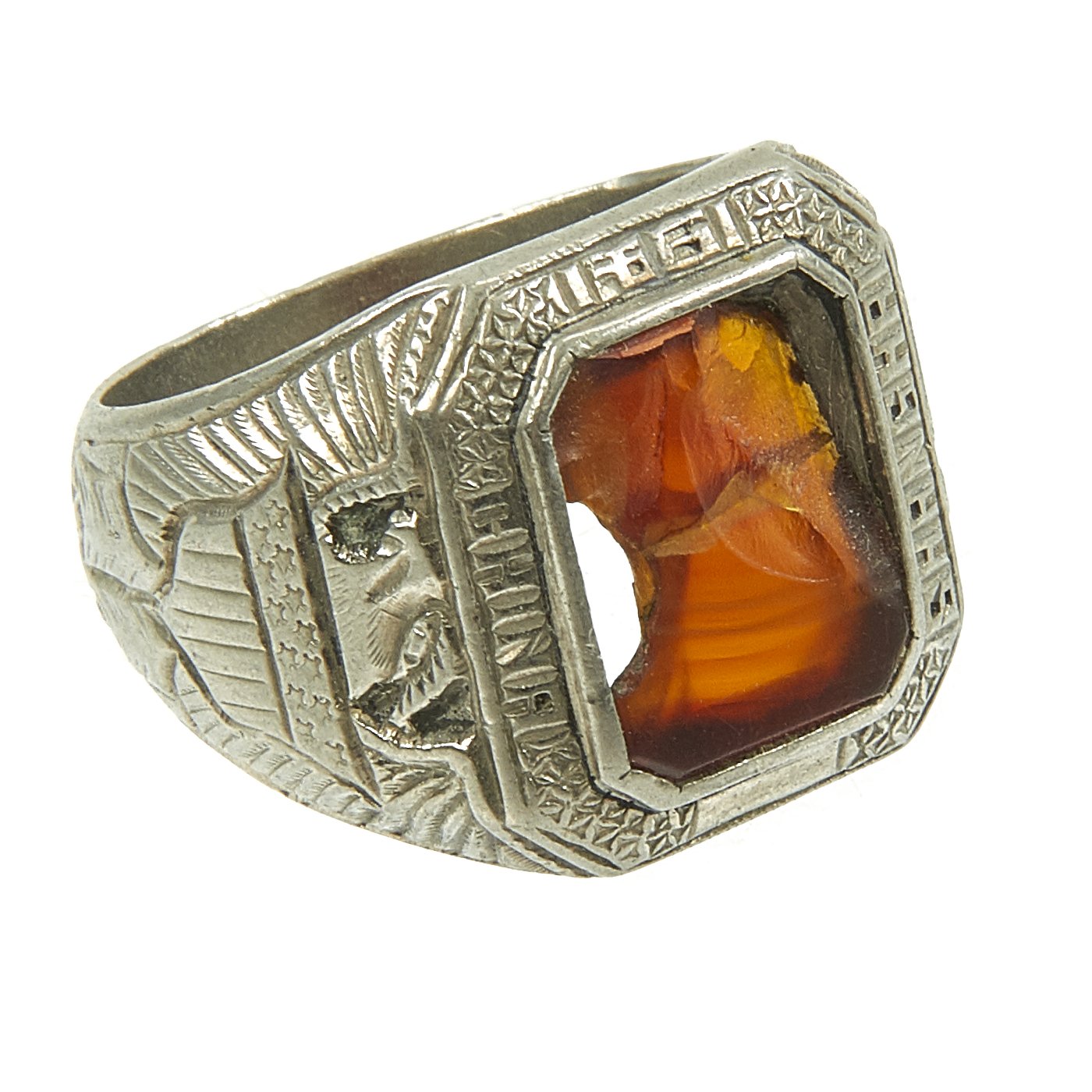 - Ring with chipped amber stone that reads SHANGHAI CHINA and features a Chinese Dragon and American Eagle with Shield.
