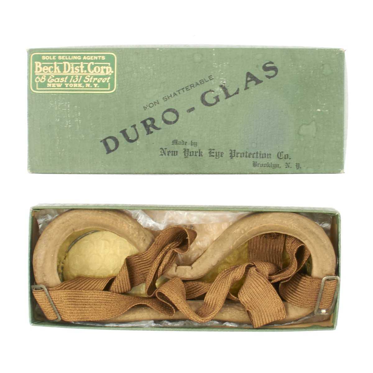 Original Item: Only One Available. These are mint condition M38 Tank Goggles that were made sometime between WWI and WWII. They are offered with the original box in excellent condition. The only issue is that the step has broken and been tied together. Otherwise these are mint examples of an iconic google that was also used for aviation. The history o f this style goggle is best explained by the wonder historical author Peter Succio on his website militarysunhelmets.com an excerpt of which can be found below.