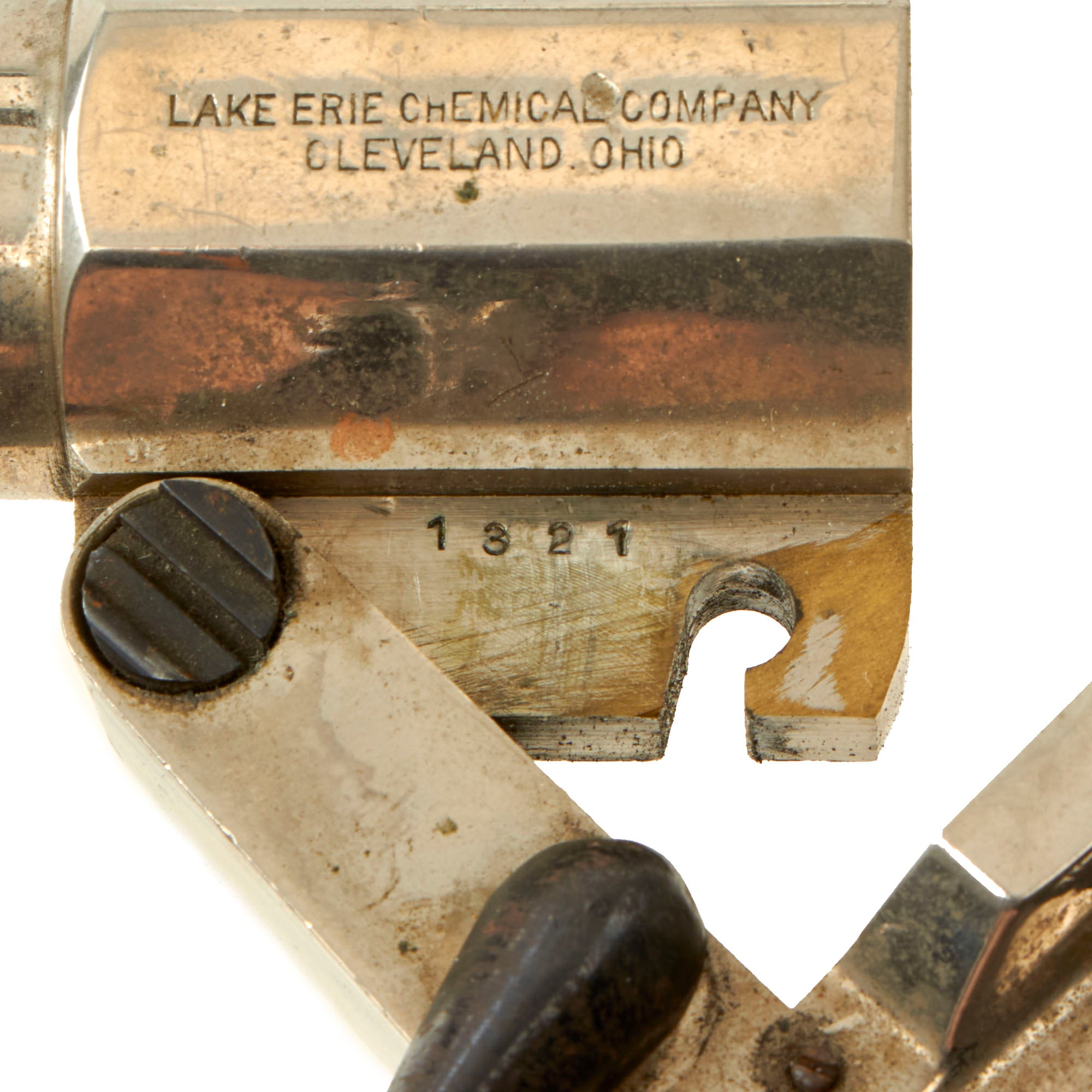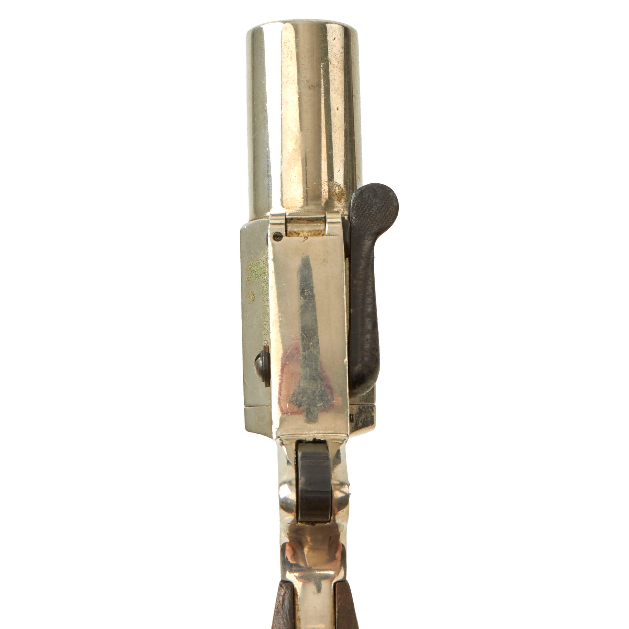 Original Item: Only One Available. This is a very nice Lake Erie Chemical Co. Mark IV flare pistol, with a 4 inch barrel. It is the typical "Very" design used during WWI, but produced during the 1930s. Made of nickel plated cast brass with wooden grip scales, it really is quite an attractive model compared to many issued later during WWII. It is fully functional. breaking open correctly when the breech lock is opened, and still dry fires correctly. The "spur trigger" gives it quite elegant lines, similar to many WWI German designs.