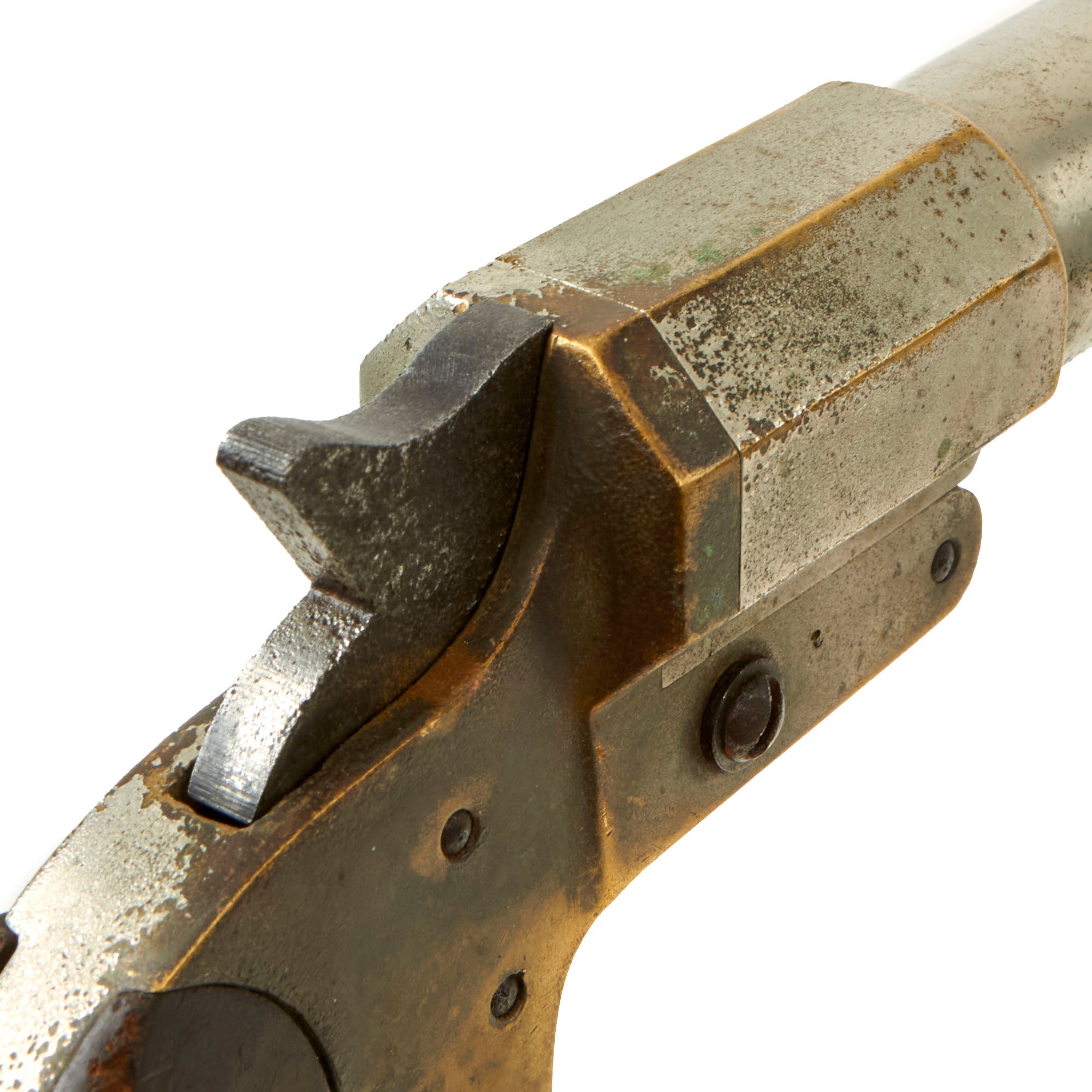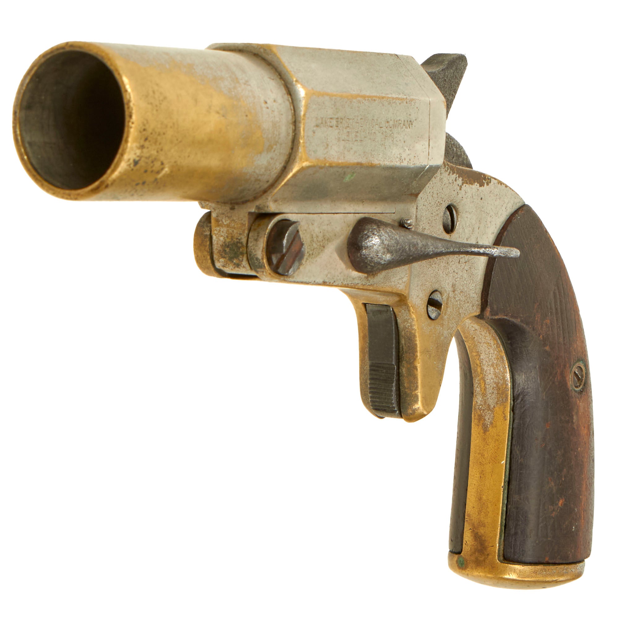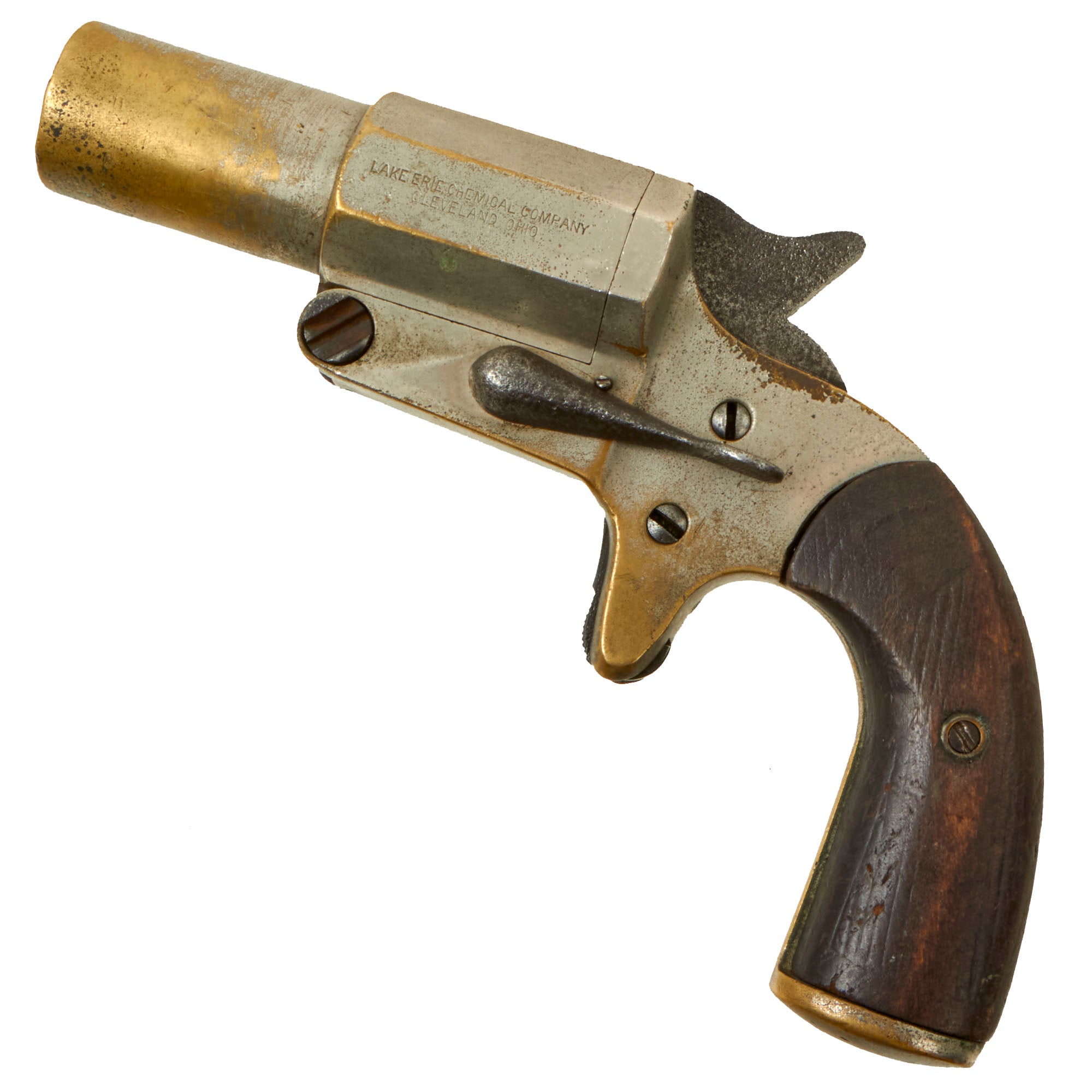 Original Item: Only One Available. This is a very nice Lake Erie Chemical Co. Mark IV flare pistol, with a 4 inch barrel. It is the typical "Very" design used during WWI, but produced during the 1930s. Made of nickel plated cast brass with wooden grip scales, it really is quite an attractive model compared to many issued later during WWII. It is fully functional. breaking open correctly when the breech lock is opened, and still dry fires correctly. The "spur trigger" gives it quite elegant lines, similar to many WWI German designs.