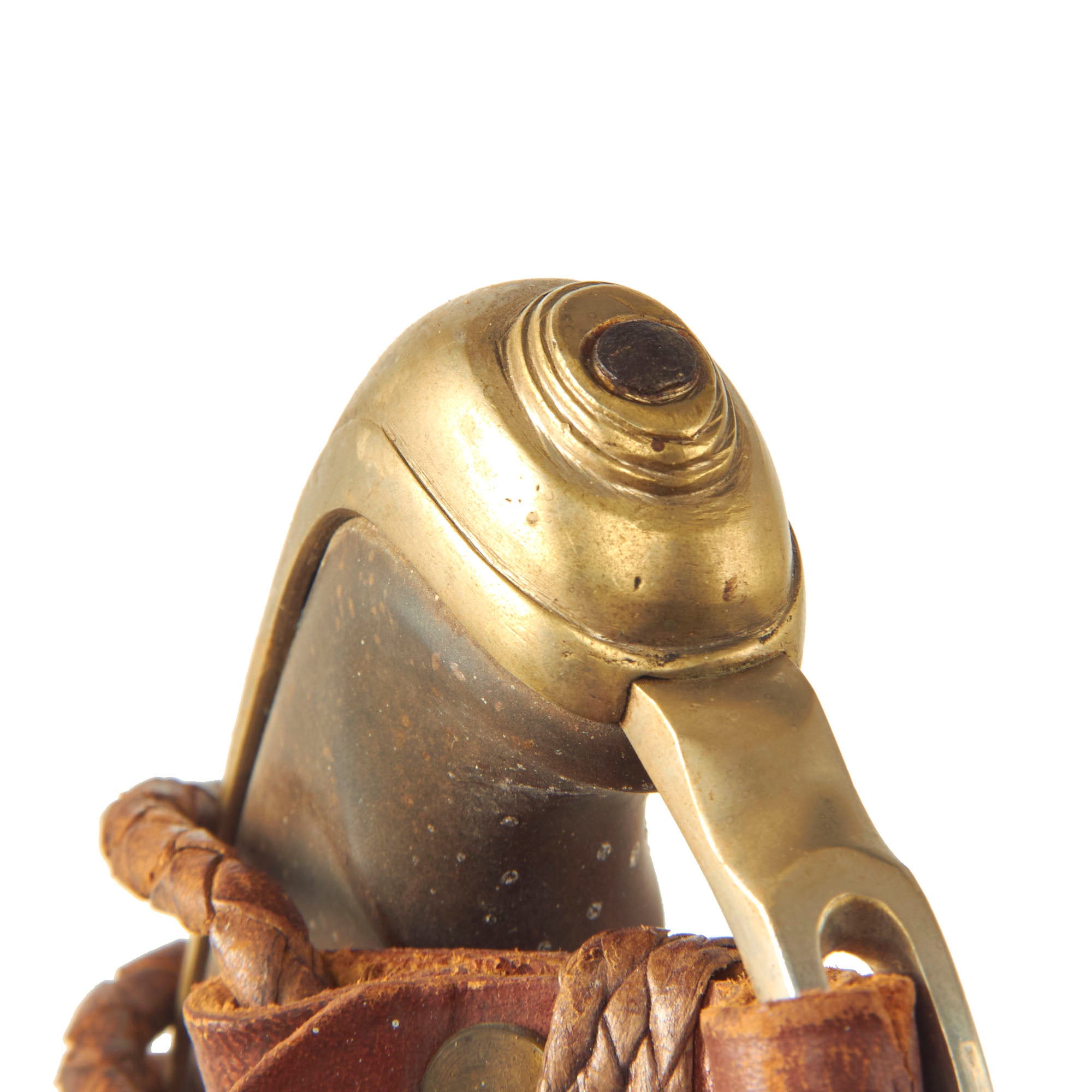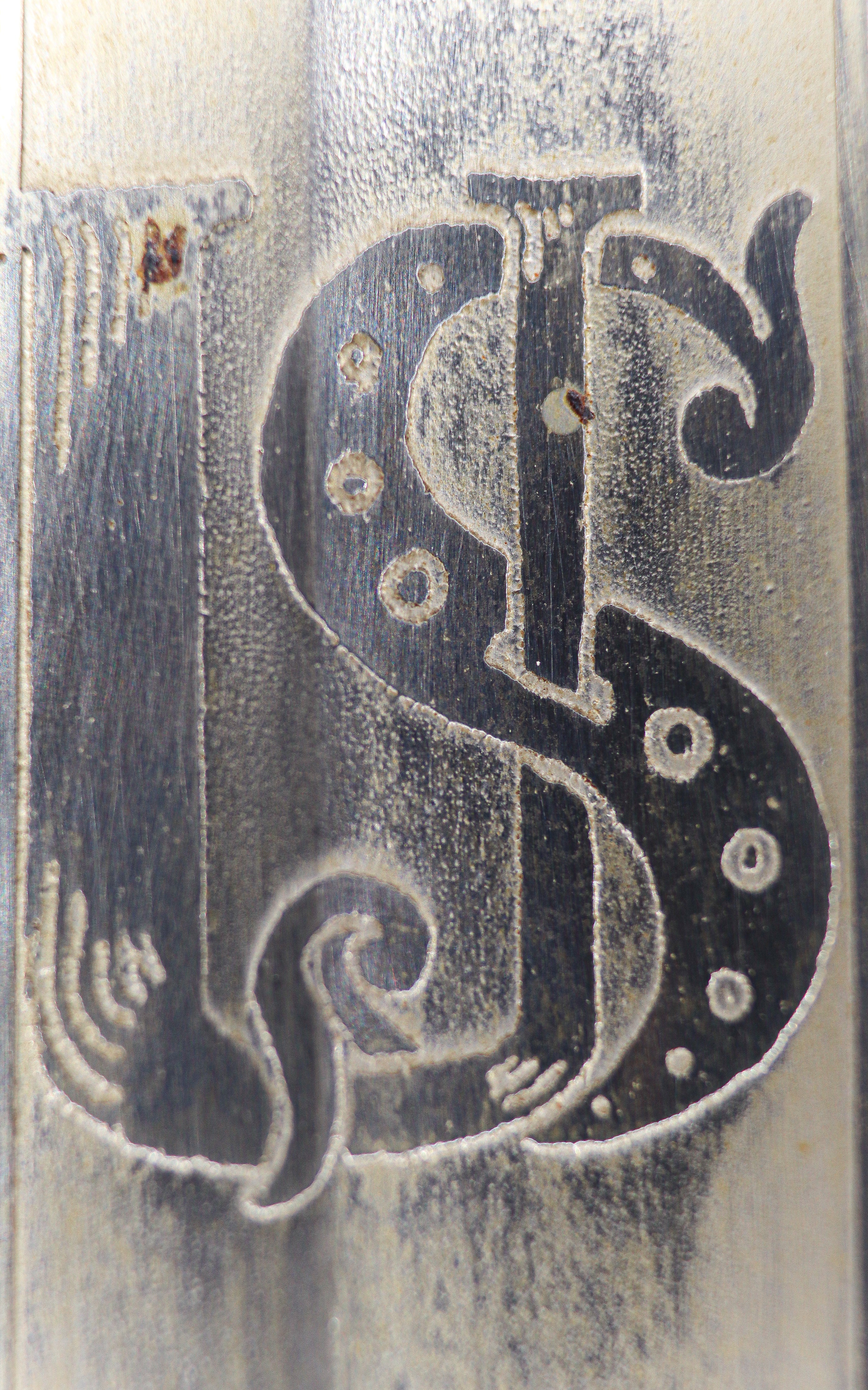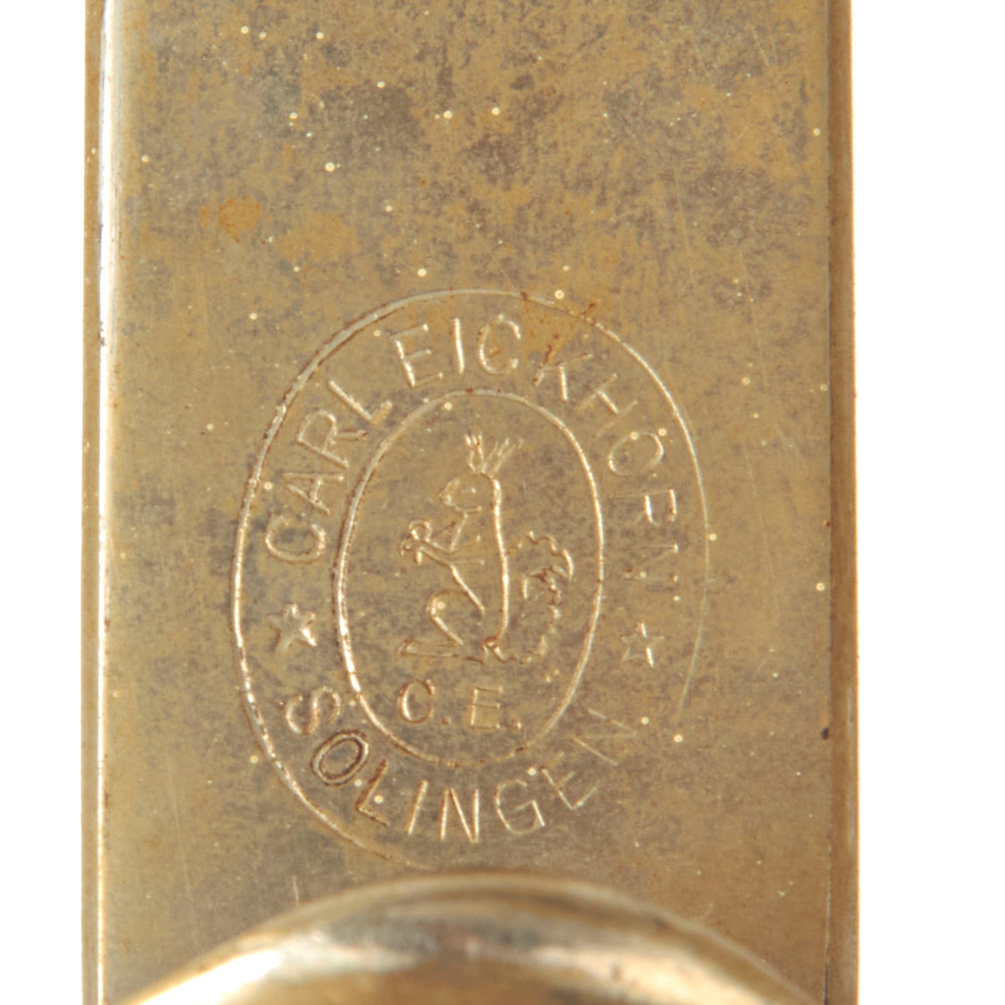 The reverse ricasso is etched with the 1933-35 Eickhorn trademark logo: a double oval surrounding a seated squirrel with a notched tail holding a sword, with CARL EICKHORN / SOLINGEN surrounding the squirrel trademark. Germany had a very active edged weapon export industry, which really only was stopped by the first world war, and continued again during the interwar period. Many outfitters had blades made under contract in Germany, which were imported in bulk, and then customized to the owner's wishes.