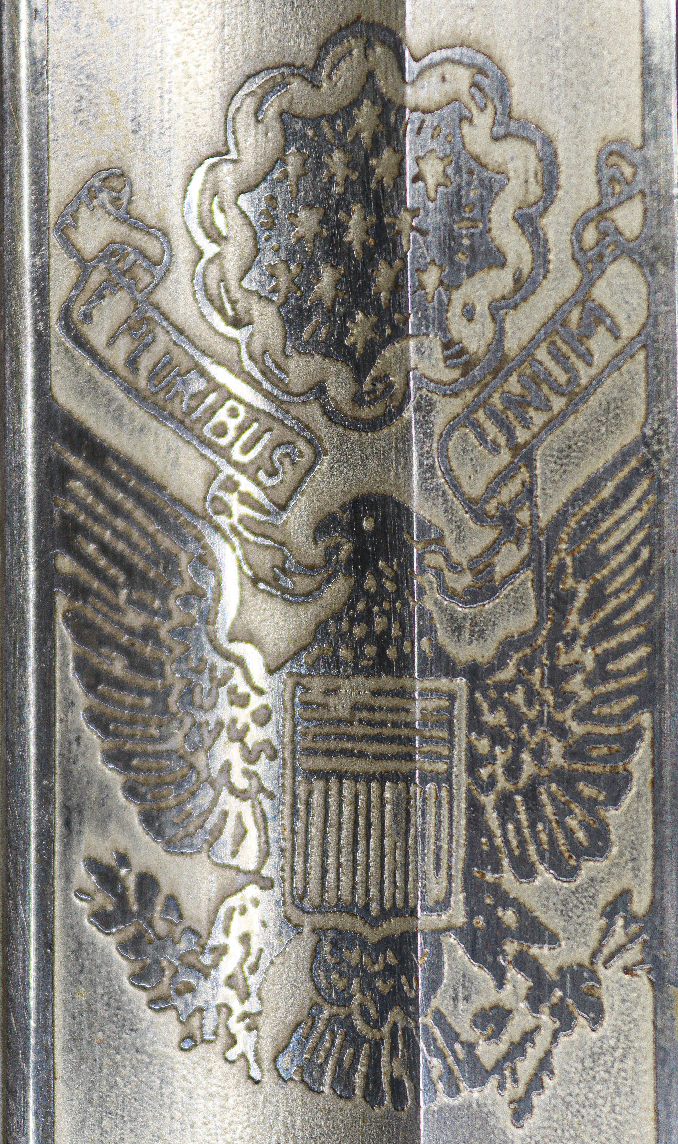 Original Item: One of a Kind. This is the official U.S. Army Officer's Sword, introduced in the early 1900's (M-1902). It has a four bar nickel plated hand guard, dark composite finger grooved grip, slim slightly curved fully etched and nickel-plated blade. The etched design has typical United States Military emblems, including the Federal Eagle, crossed cannons, flags, and so forth. There is a panel for a name, but it appears to have never had one etched.